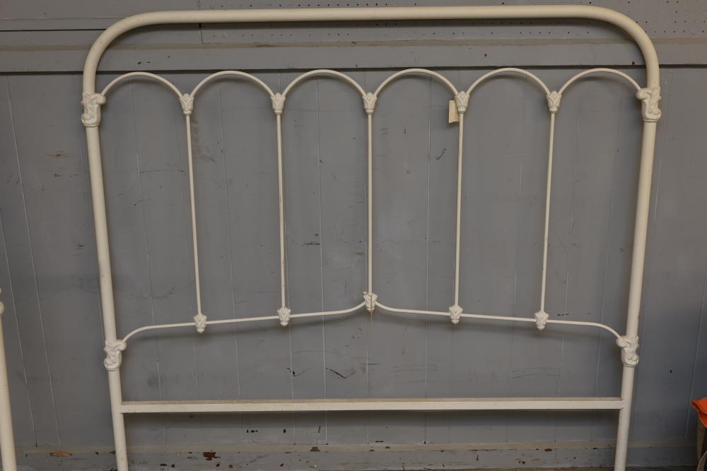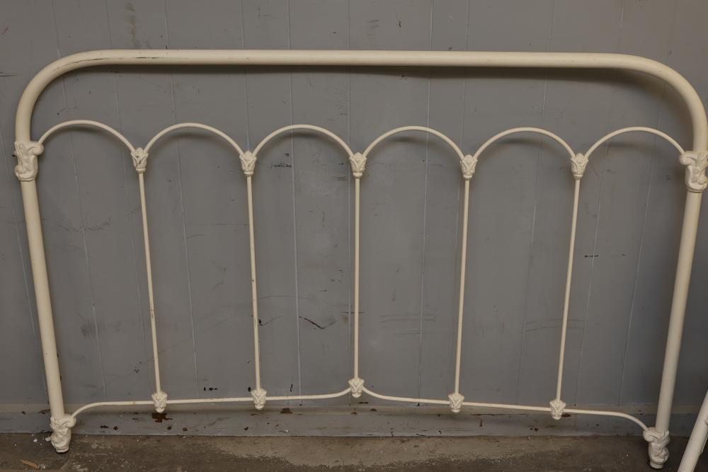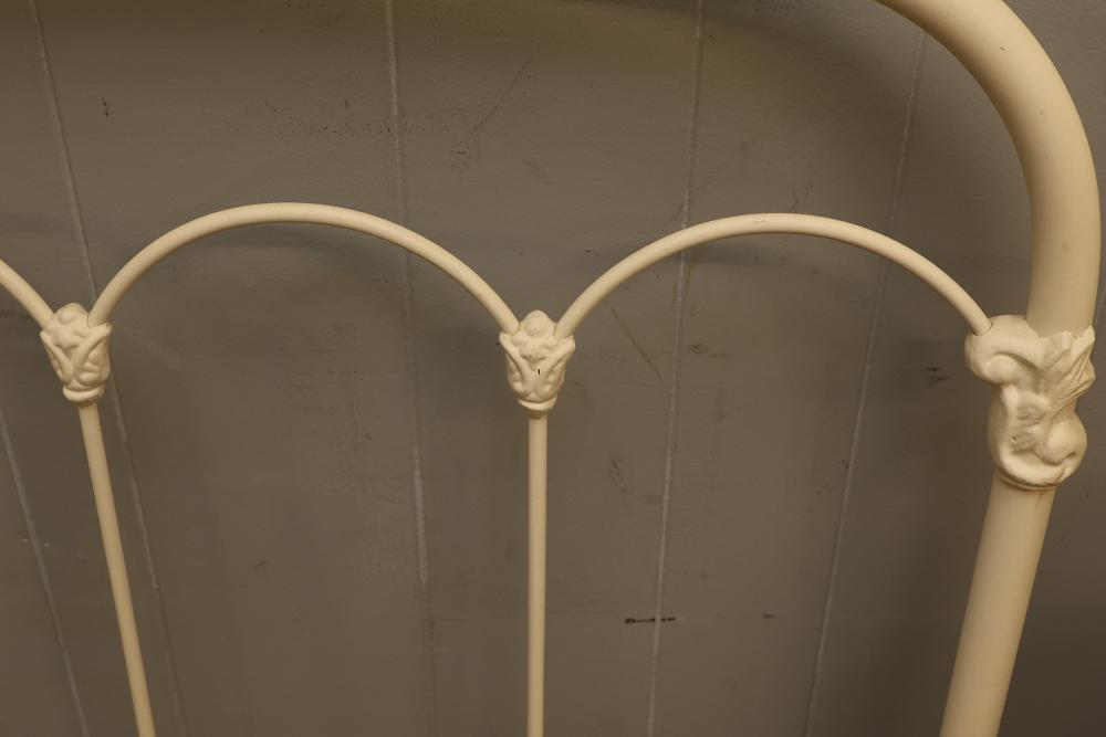 Iron bed frame with decorative cast accents featuring arched designs and floral motifs. Included are a headboard and footboard, each with vertical bars and four ornate cast elements per frame. The framework is finished in an off-white color. Pickup only.