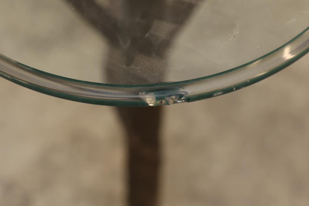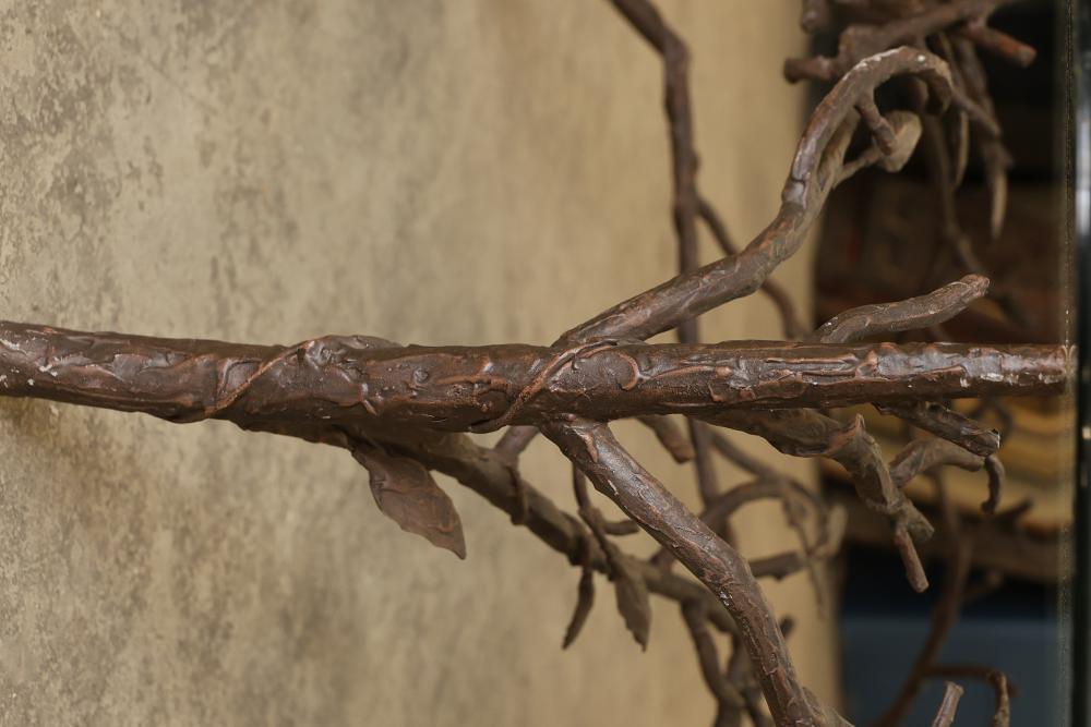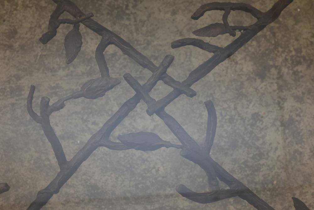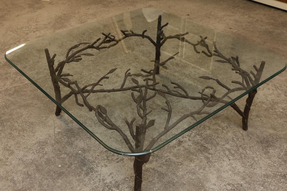 Glass-Top Table With Branch-Shaped Metal Base. Square clear glass top with beveled edges rests on an artistic metal base designed to resemble intertwined tree branches with detailed leaf accents. Pickup only.