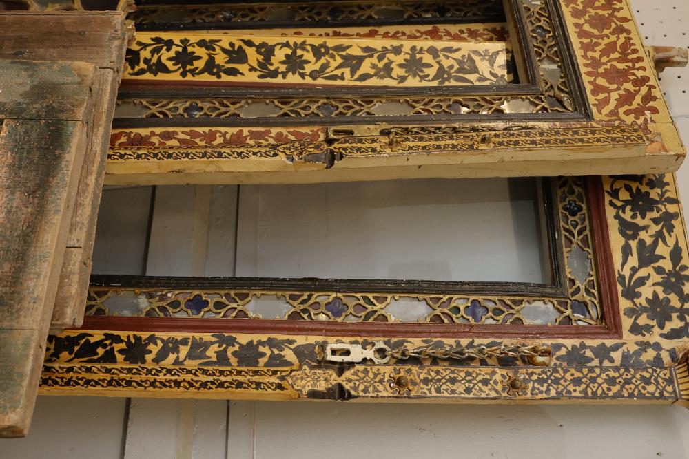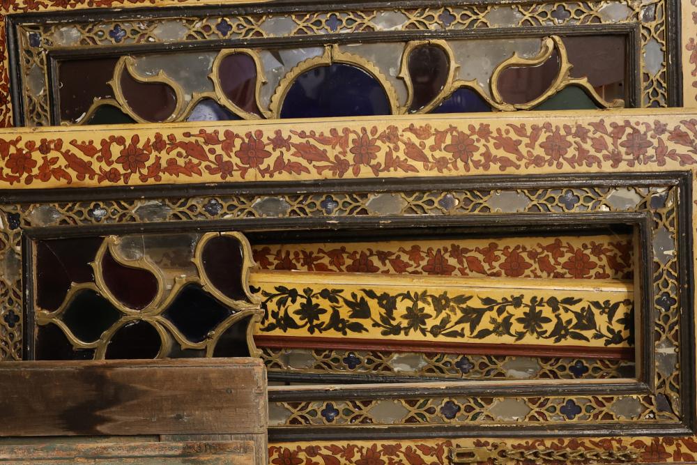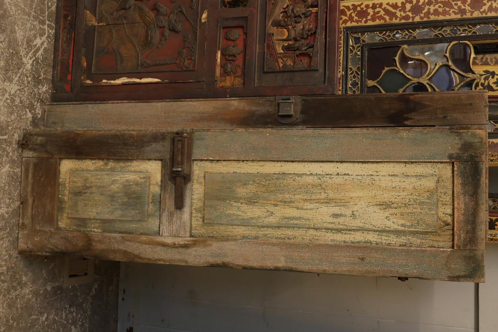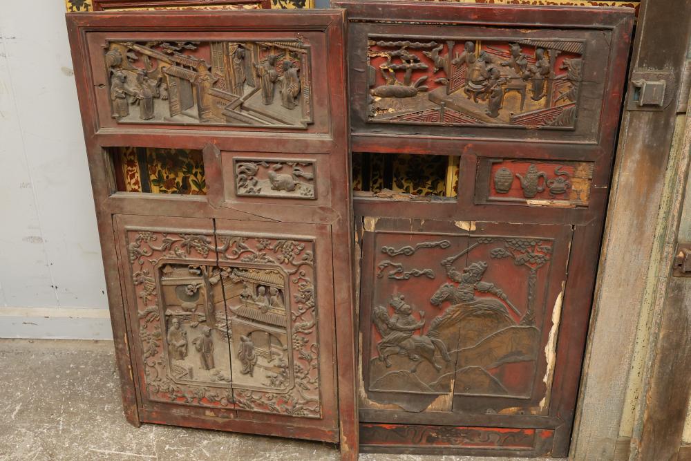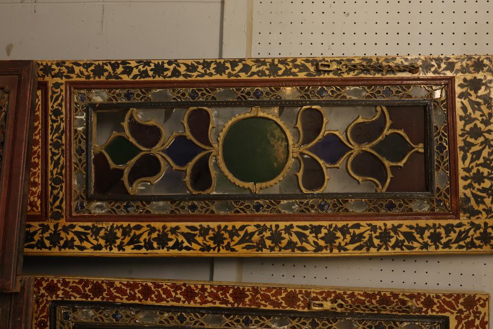 Painted wooden doors with decorative panels and carved details. Includes stained glass inserts with multicolored geometric designs framed by intricate floral painted patterns. Also features doors with relief-carved figural and abstract designs, and a single panel door with weathered paint. Panels may be missing stained glass. Pickup only.