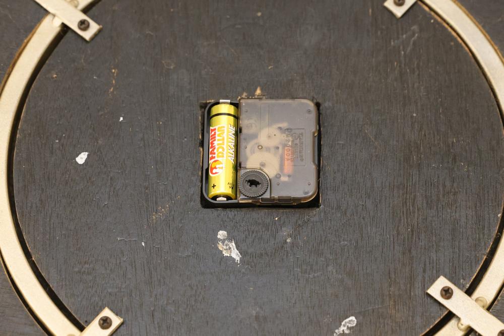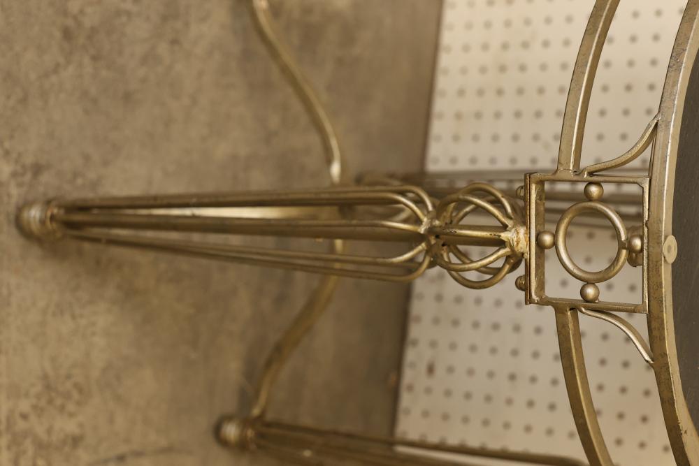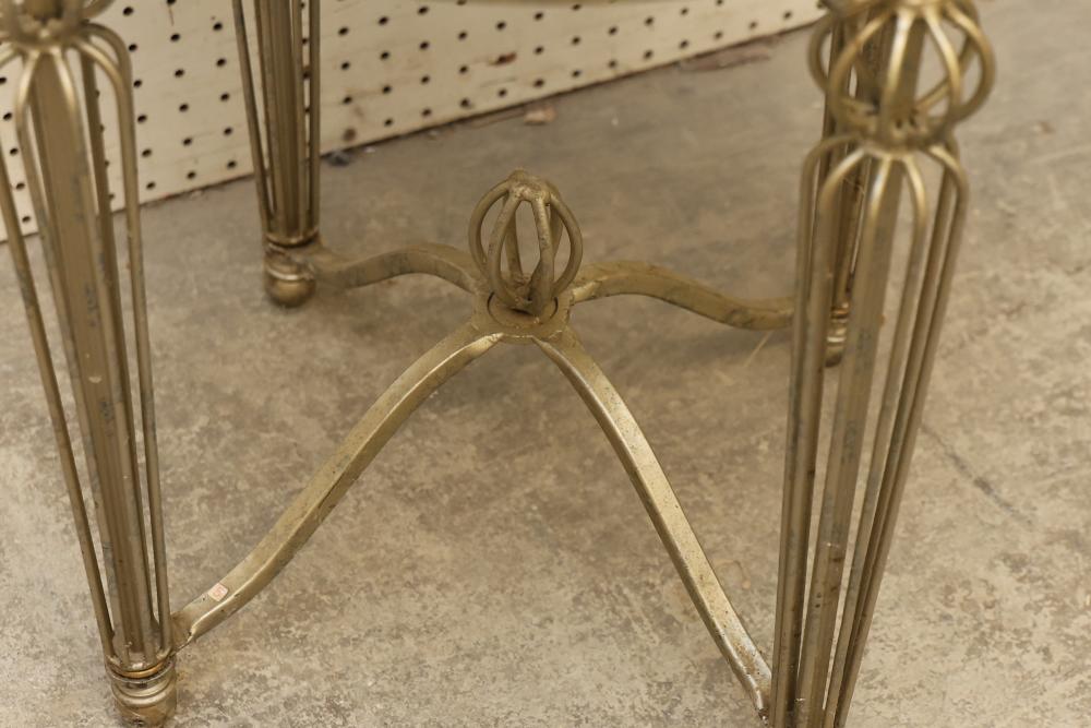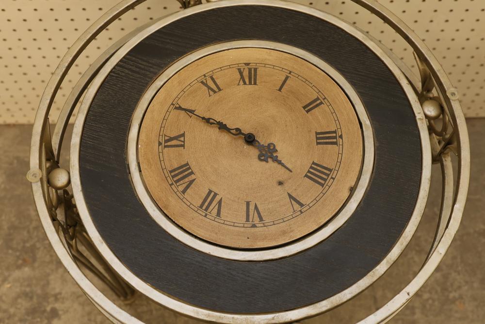 Glass-Top Metal Table with Integrated Clock, Approximately 21 Inches in Diameter and 23 Inches in Height. Features a round clear glass top supported by metal legs with decorative elements and an integrated clock housed beneath the glass surface. The clock mechanism is battery-operated, with access located on the underside. Pickup only.