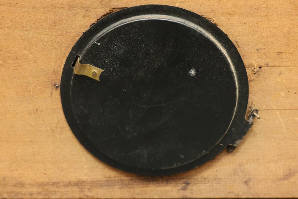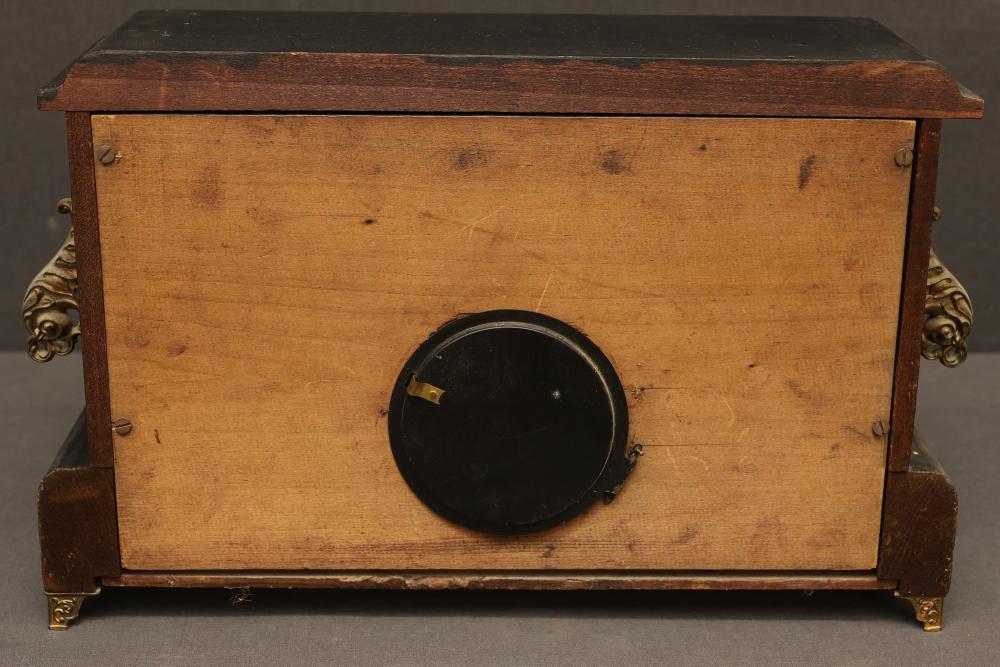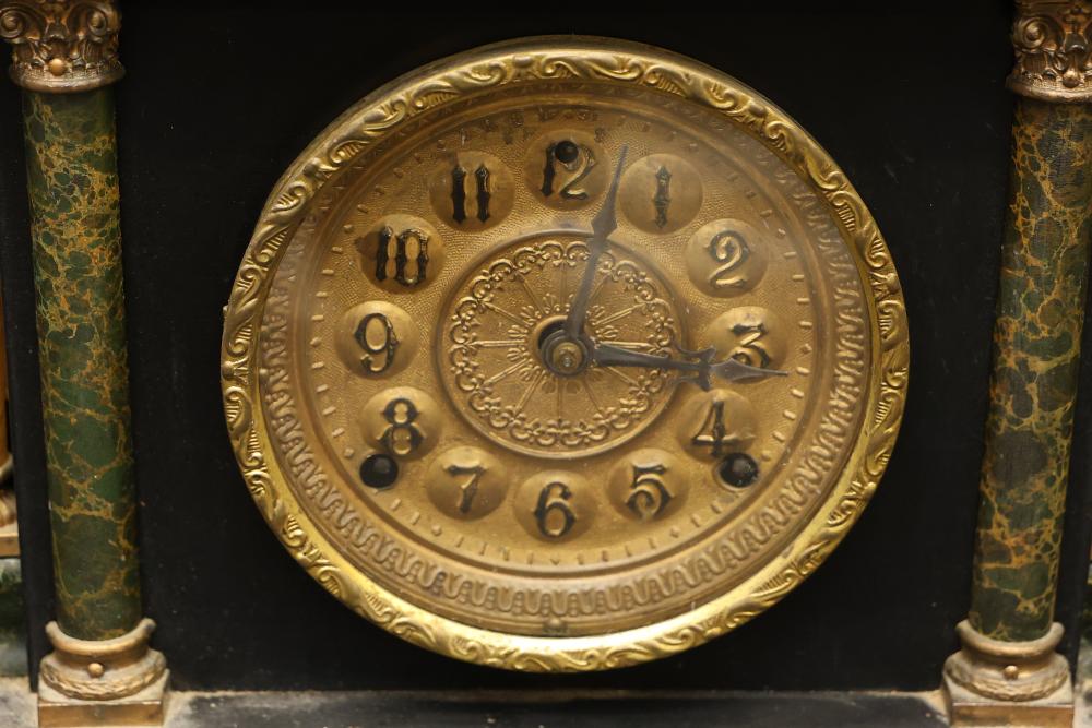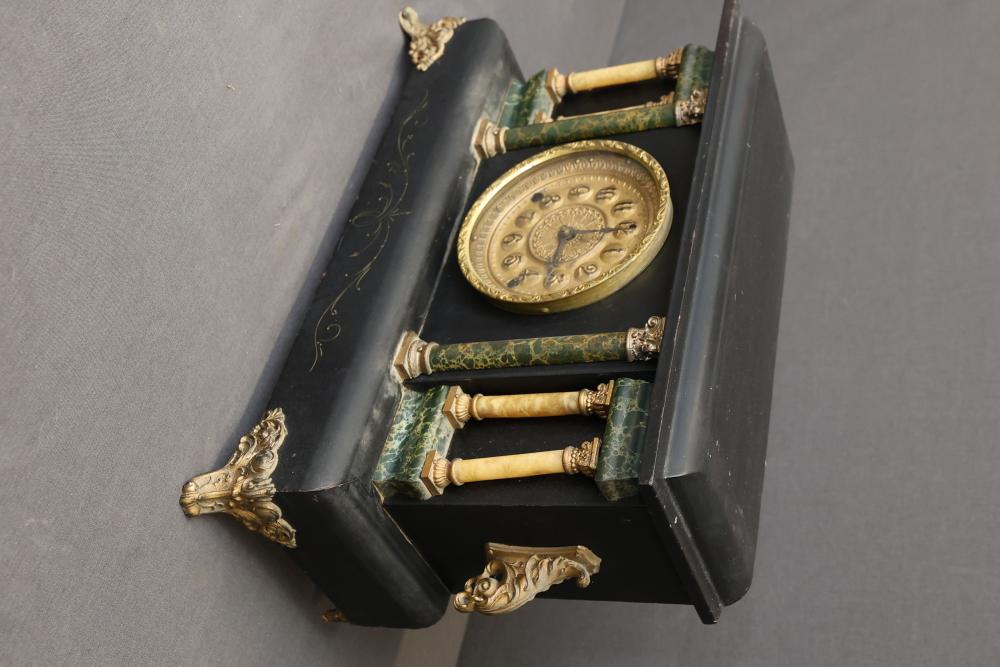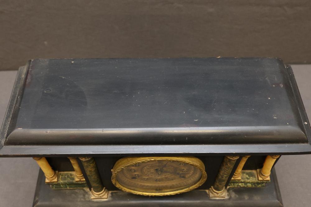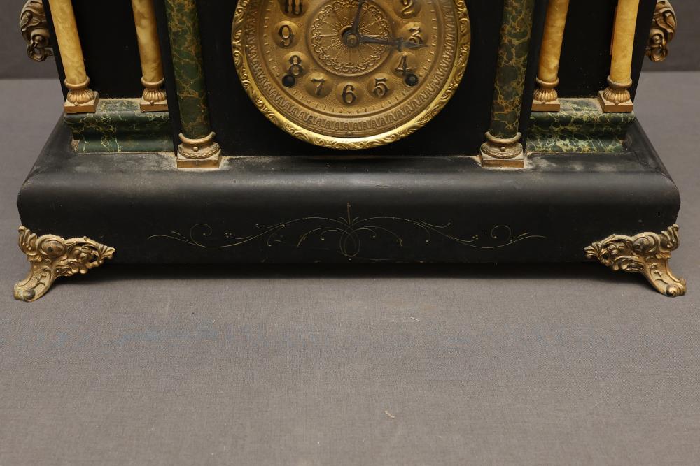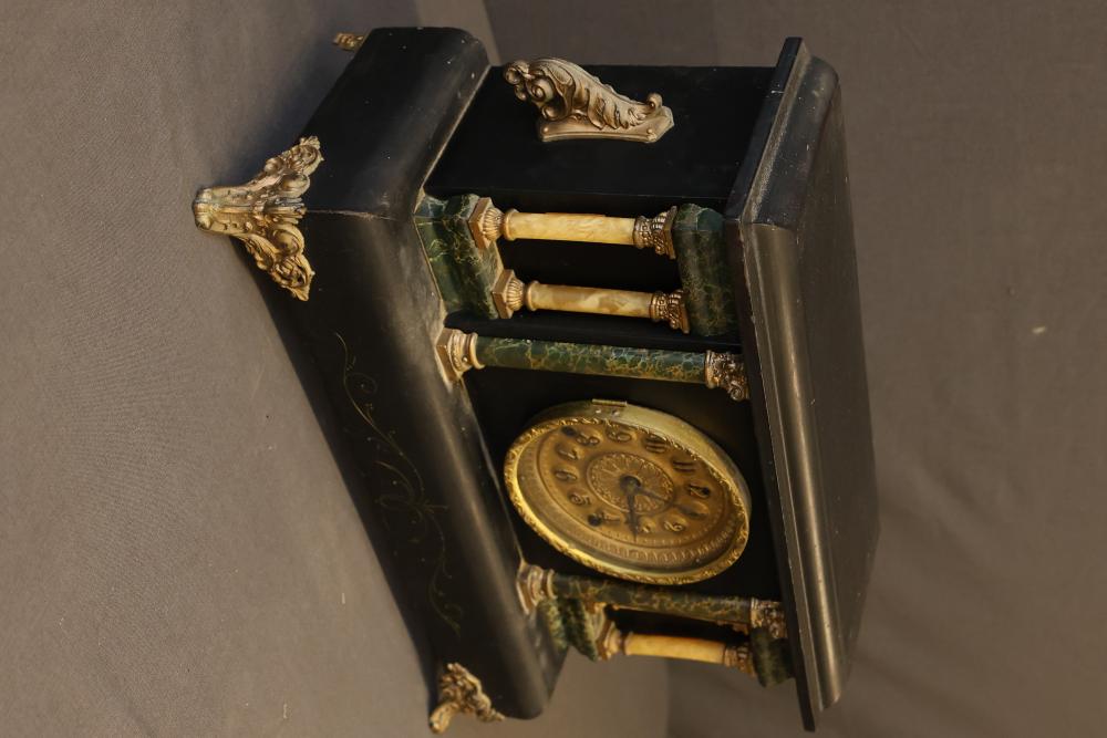 Black mantel clock with a gold-toned dial featuring embossed numerals and ornate detailing. The case includes decorative green and beige marbled columns, gold embellishments, and four decorative feet. The back panel provides access to the pendulum mechanism. Wear consistent with age and use. Pickup only.