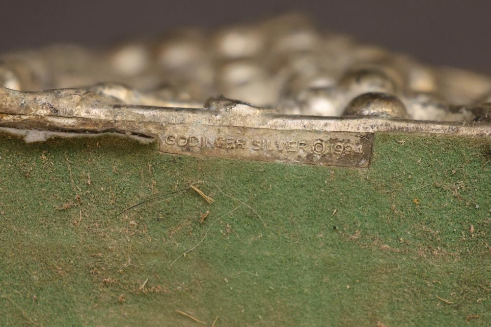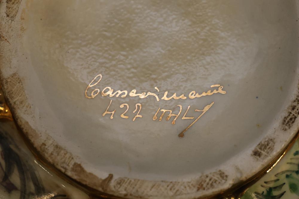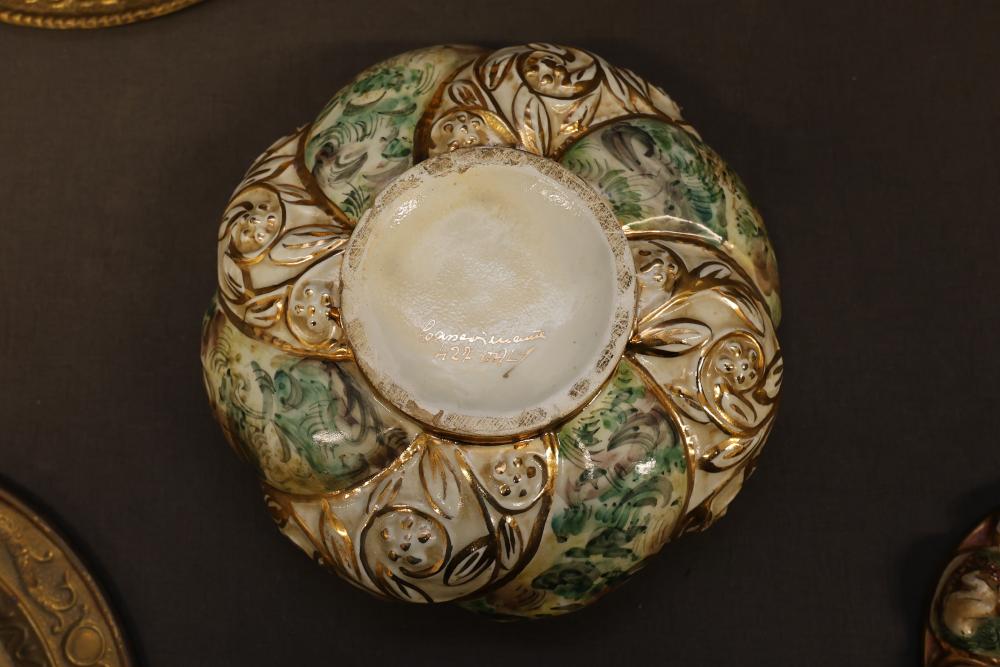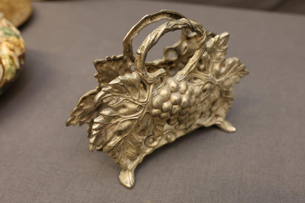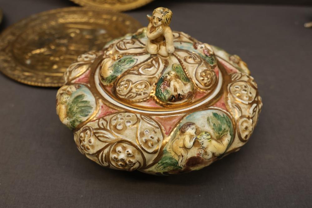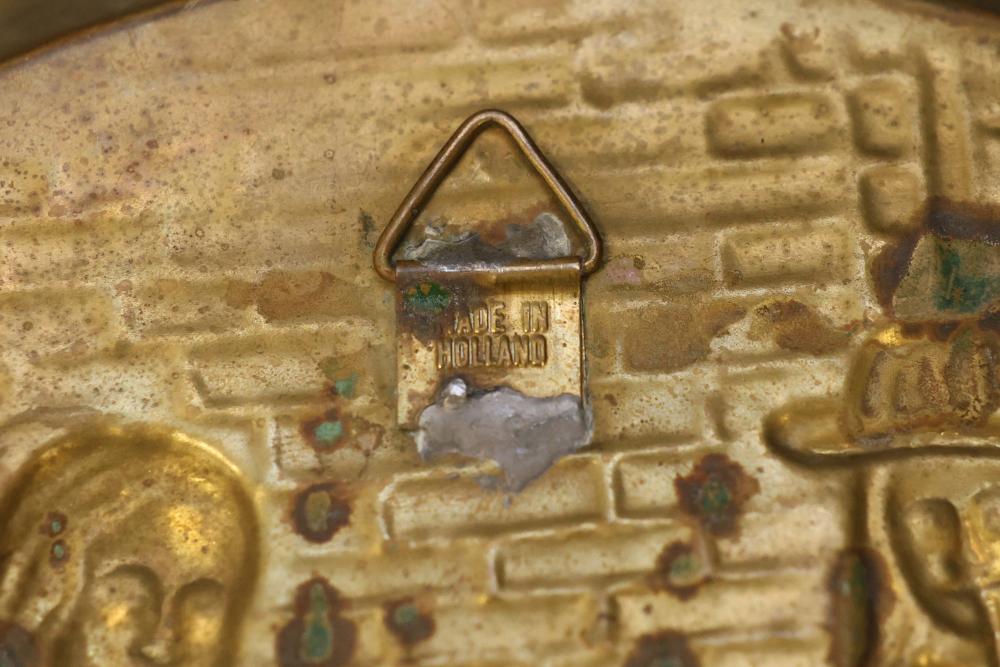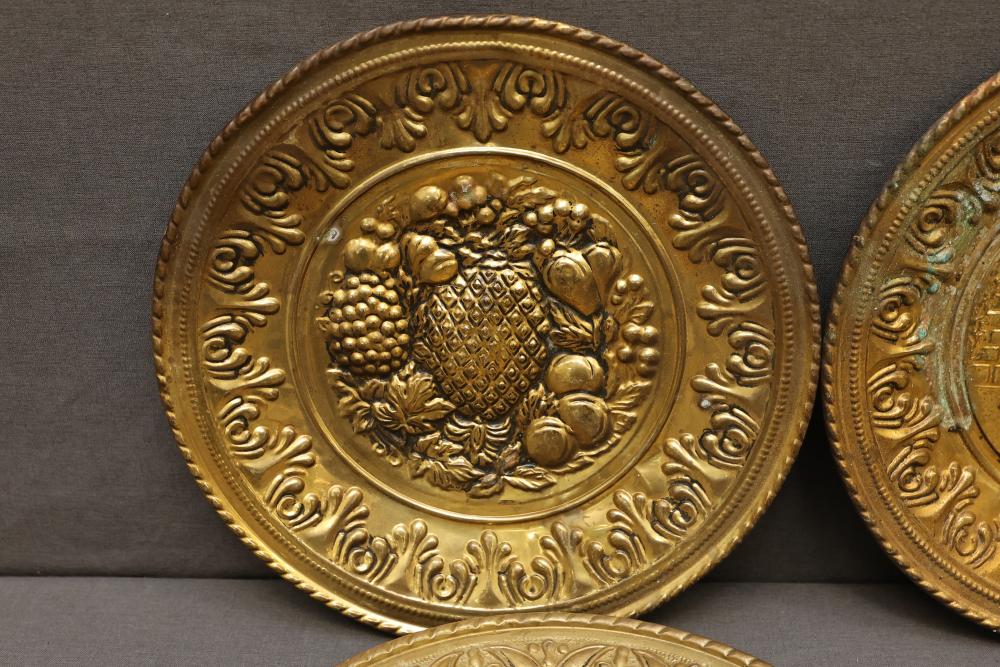 Decorative Brass Plates, Ceramic Lidded Dish with Putti, and Metal Grape-Themed Letter Holder. Set includes embossed brass hanging plates depicting various scenes and motifs, a ceramic lidded dish marked 'Bassano,' featuring painted floral and figure designs accentuated with a putti, and a cast metal letter holder with grape cluster and leaf designs, marked 'Godinger Silver.' Pickup only.