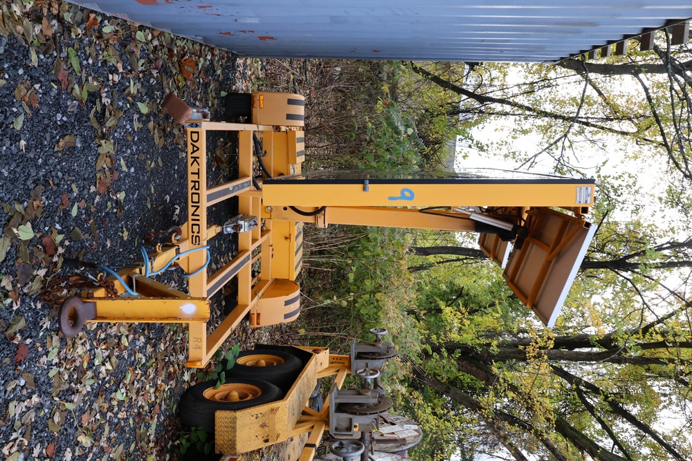 Daktronics Portable Message Board Trailer, Serial #069028. Solar-Powered Variable Message Sign (VMS) with Dual Solar Panels, Hydraulic Lift, and LED Display Panel. Yellow Steel Frame, Adjustable Pintle Hitch, and Manual Jack Stand. Equipped with Daktronics Control System and Power Box. Hasn't been used by the seller, unknown if operational.