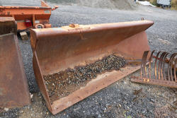 Hewitt model 926 1.75 cubic yard loader side dump bucket. Unit features hydraulic connections, integrated cylinder mounts, for use with CAT 416 or older 420 backhoe.