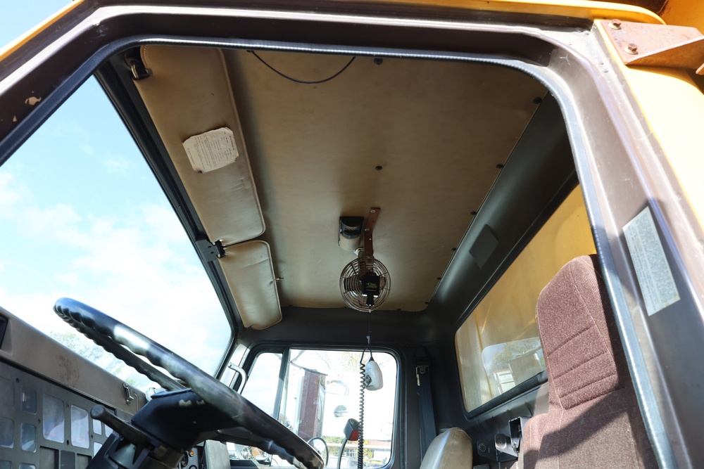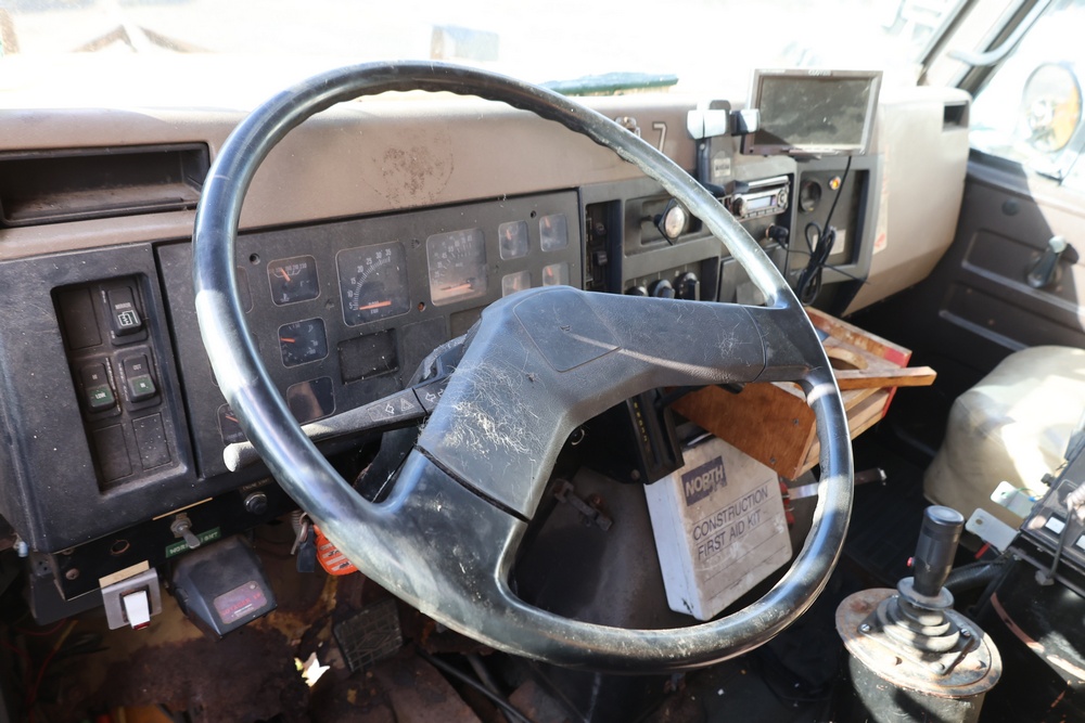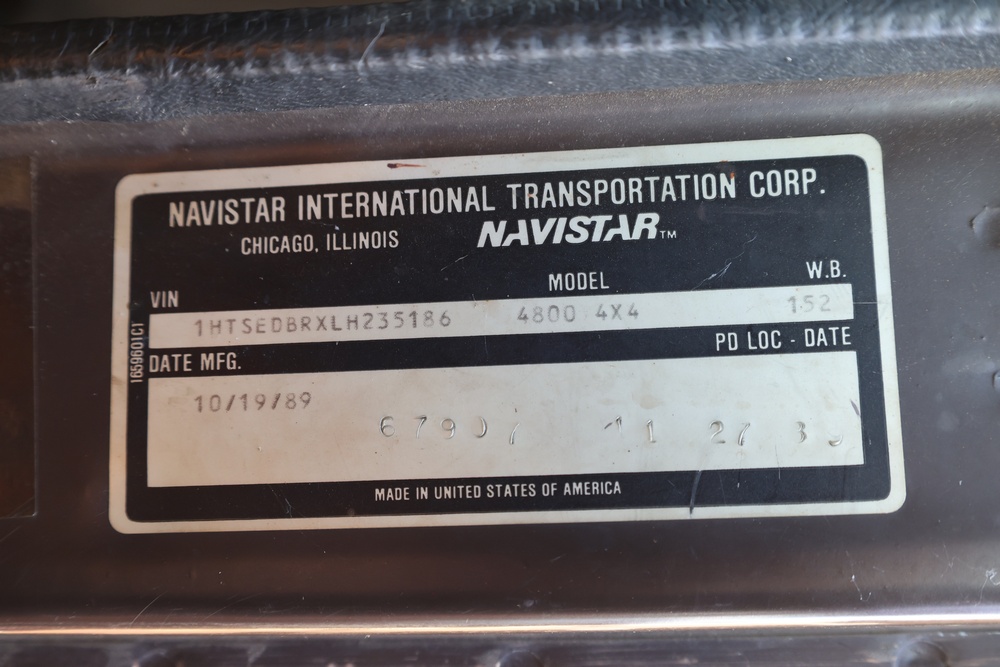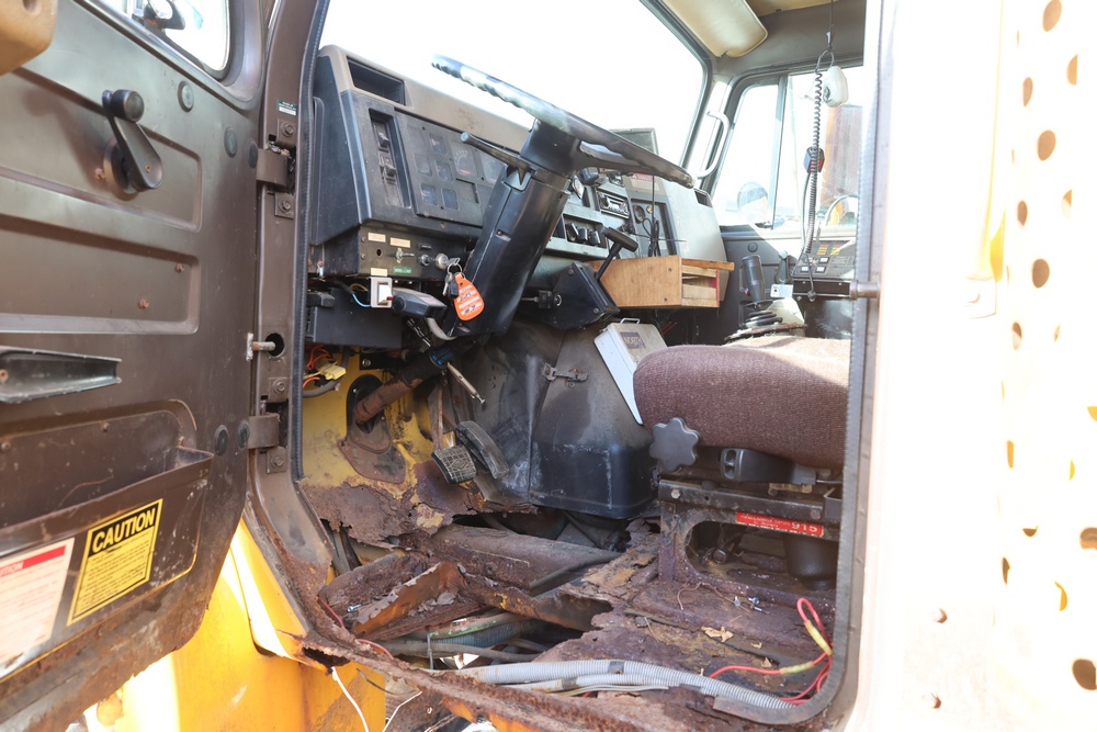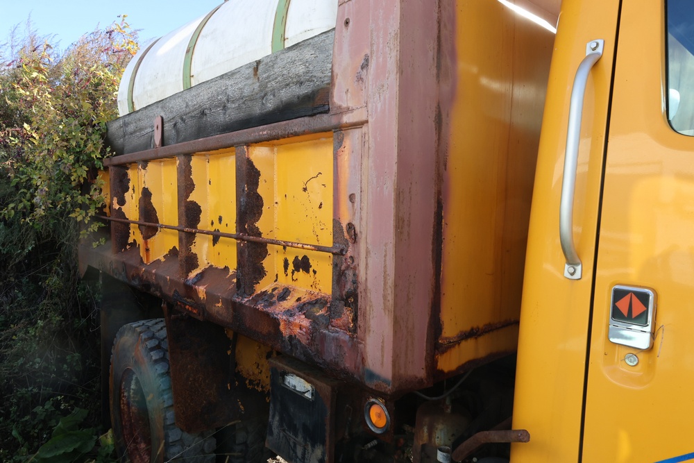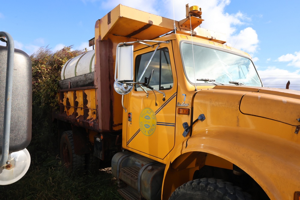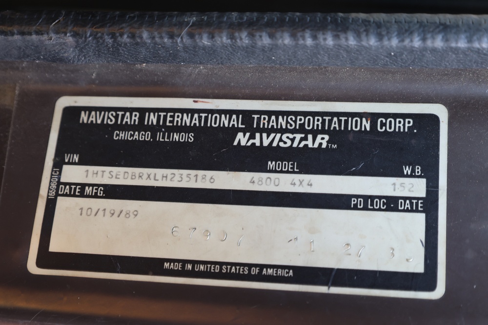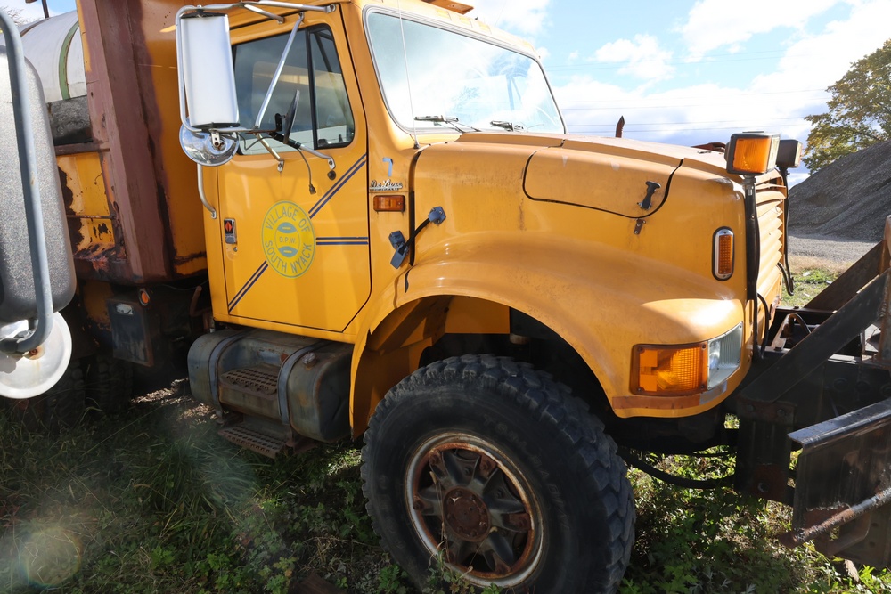 1989 International 4800 4x4 dump truck with automatic transmission. VIN: 1HTSEDBRXLH235186. Odometer reading: 36,295. Exterior: Yellow cab and dump body with dual rear wheels, front plow mount, rear liquid tank, and amber roof light bar. Interior: Brown driver's seat, Panasonic radio, auxiliary switchgear. Tire configuration: Dual rear wheels. Additional equipment includes dump bed, front plow mount. Cab rotted through, suitable for parts. Runs, must be towed. Bill of Sale Only and key available.