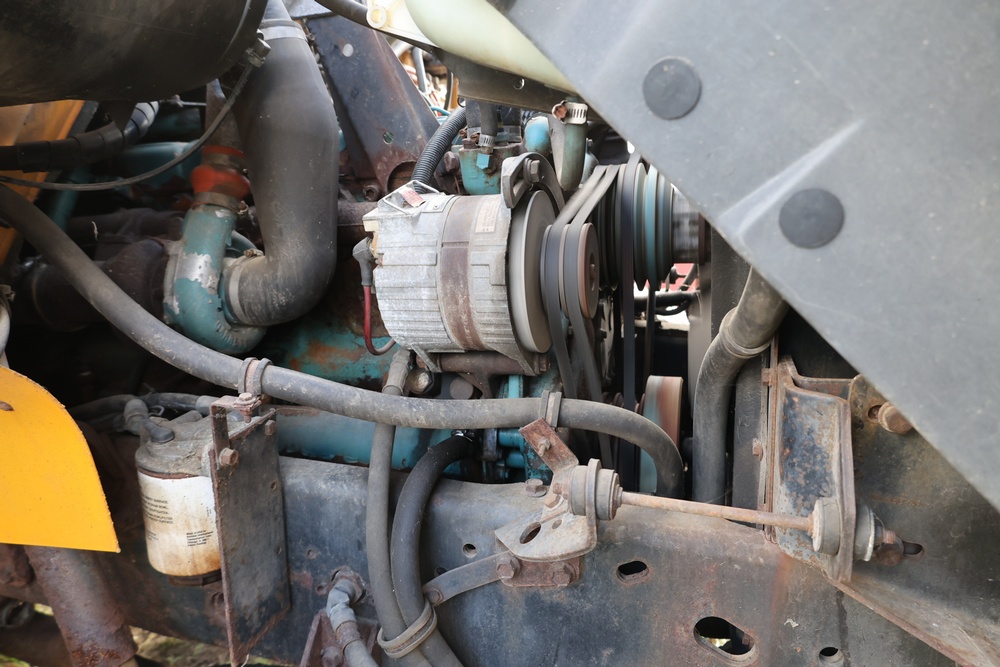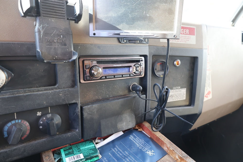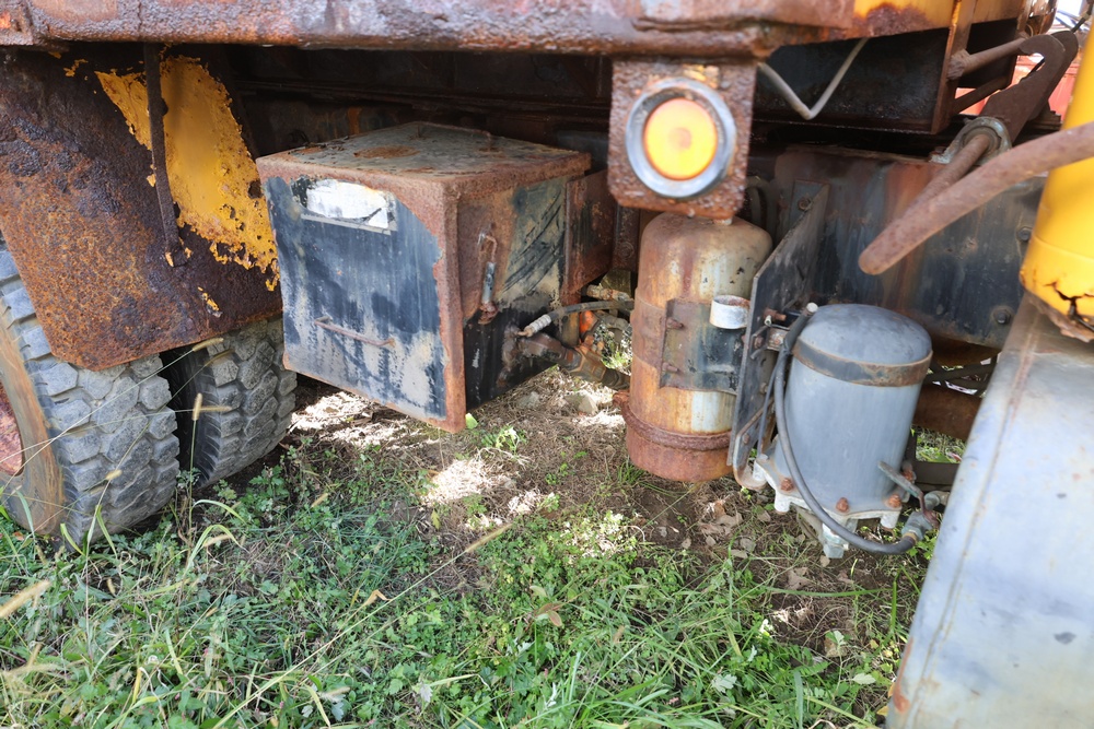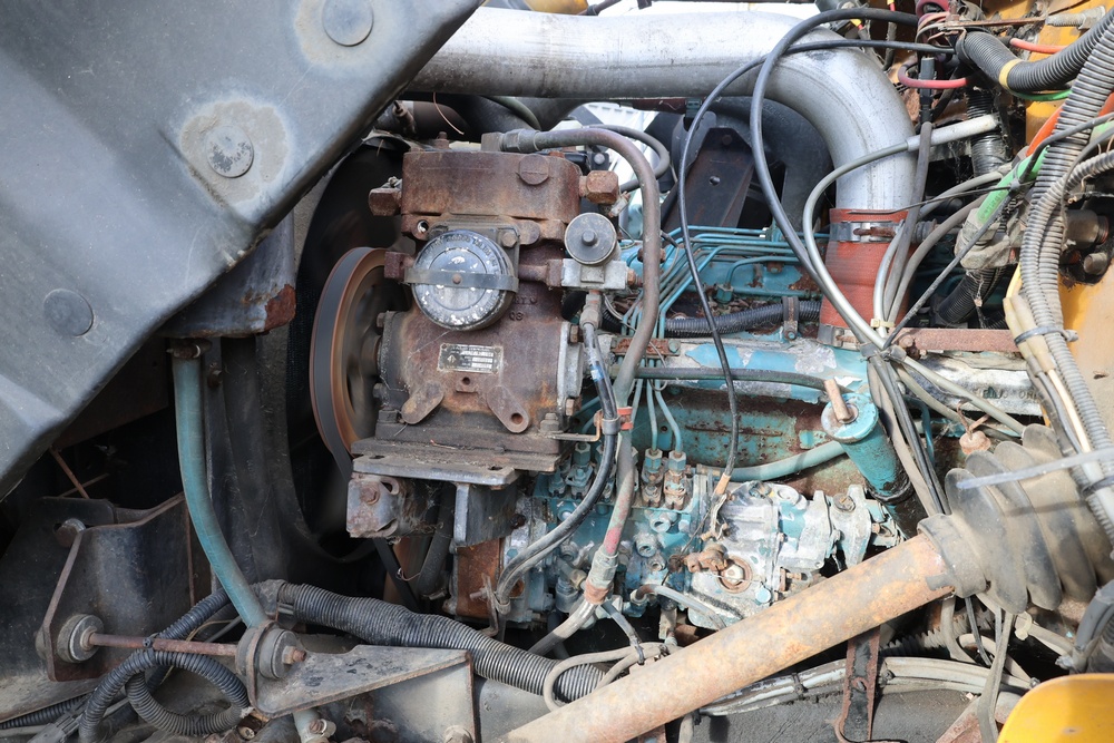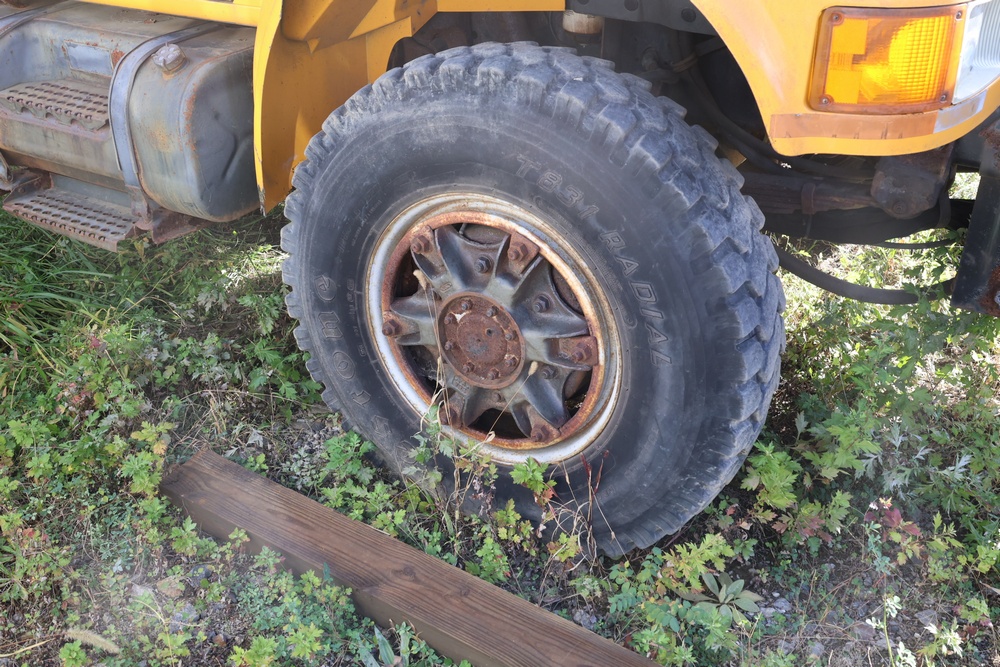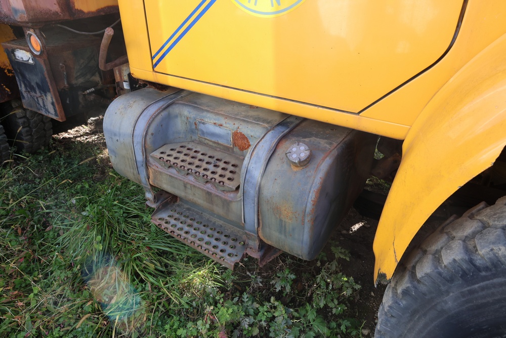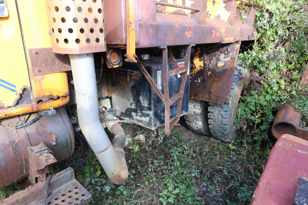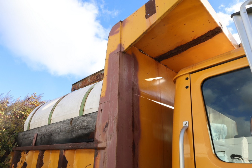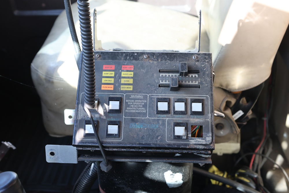 1989 International 4800 4x4 dump truck with automatic transmission. VIN: 1HTSEDBRXLH235186. Odometer reading: 36,295. Exterior: Yellow cab and dump body with dual rear wheels, front plow mount, rear liquid tank, and amber roof light bar. Interior: Brown driver's seat, Panasonic radio, auxiliary switchgear. Tire configuration: Dual rear wheels. Additional equipment includes dump bed, front plow mount. Cab rotted through, suitable for parts. Runs, must be towed. Bill of Sale Only and key available.