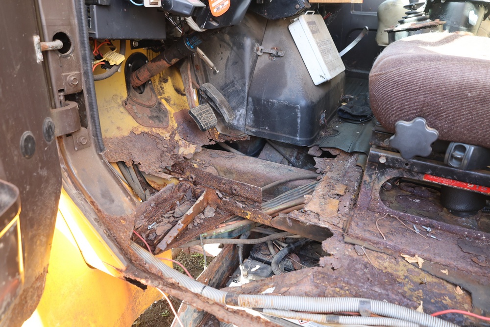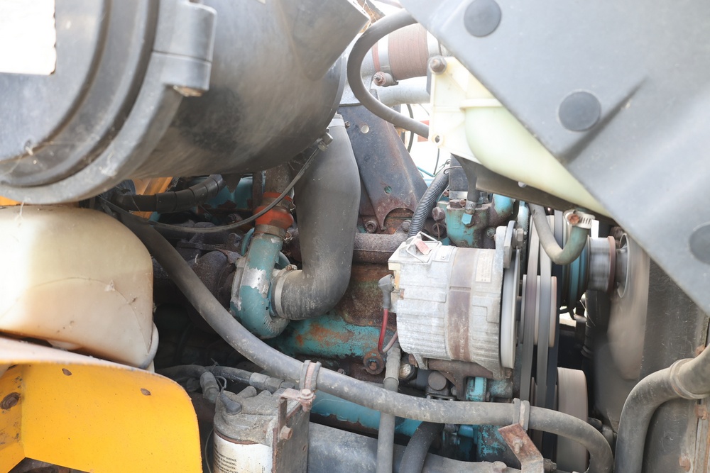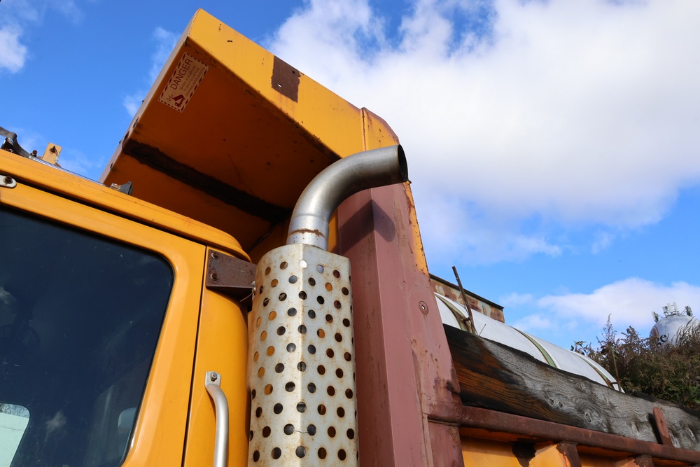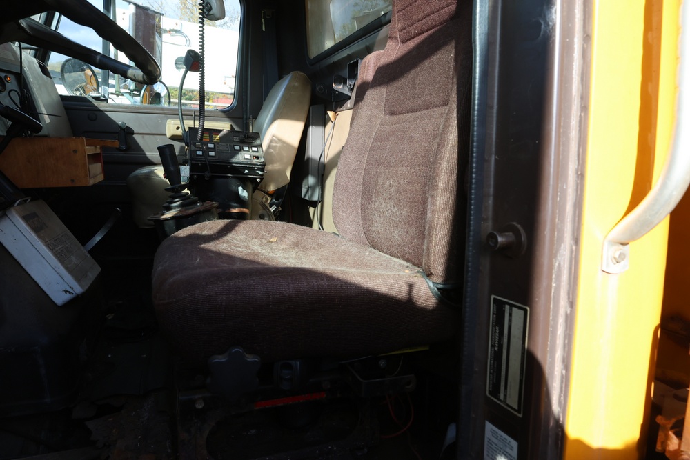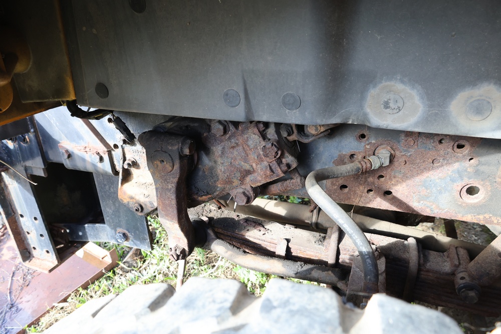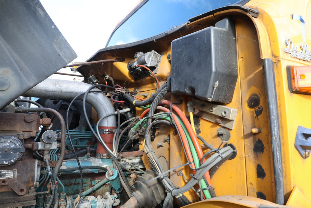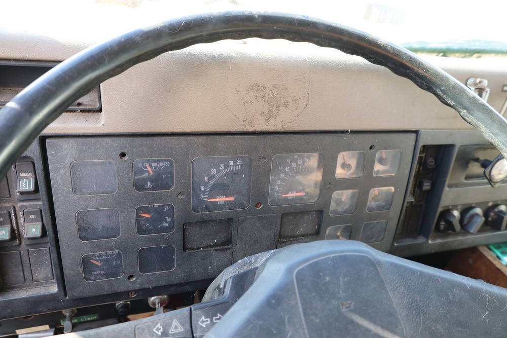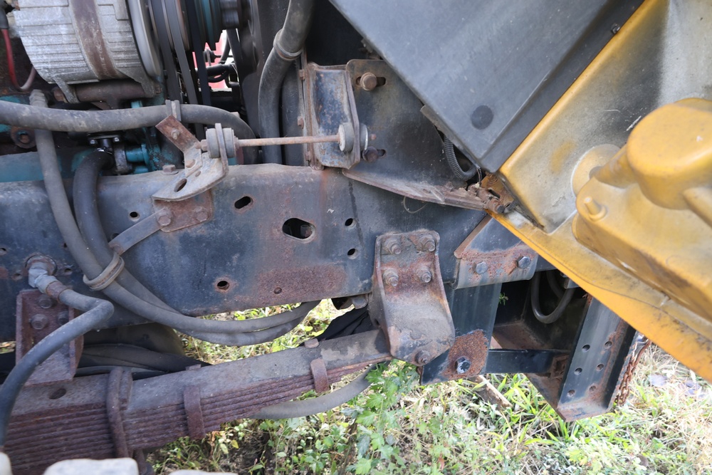 1989 International 4800 4x4 dump truck with automatic transmission. VIN: 1HTSEDBRXLH235186. Odometer reading: 36,295. Exterior: Yellow cab and dump body with dual rear wheels, front plow mount, rear liquid tank, and amber roof light bar. Interior: Brown driver's seat, Panasonic radio, auxiliary switchgear. Tire configuration: Dual rear wheels. Additional equipment includes dump bed, front plow mount. Cab rotted through, suitable for parts. Runs, must be towed. Bill of Sale Only and key available.