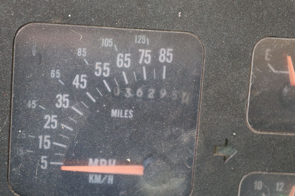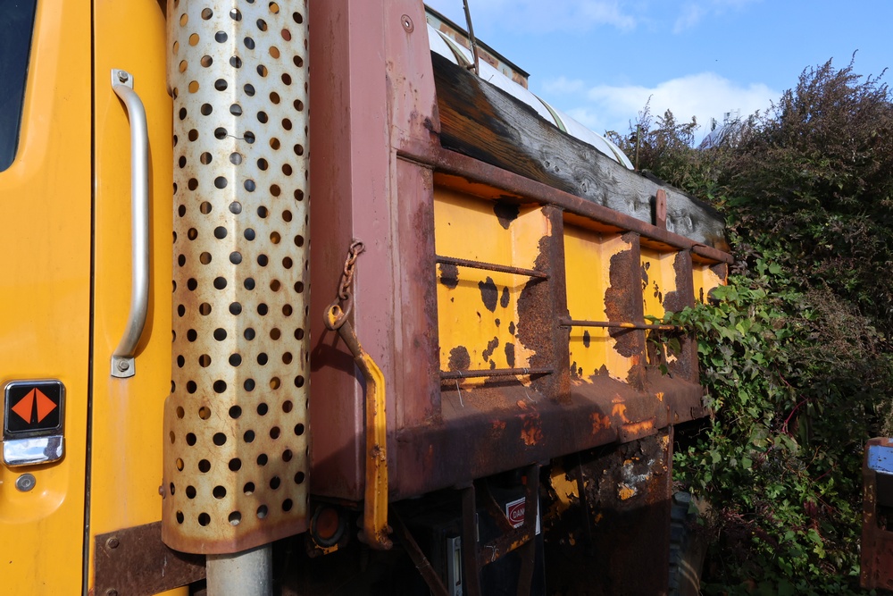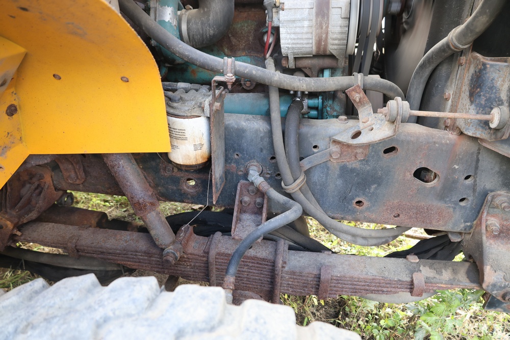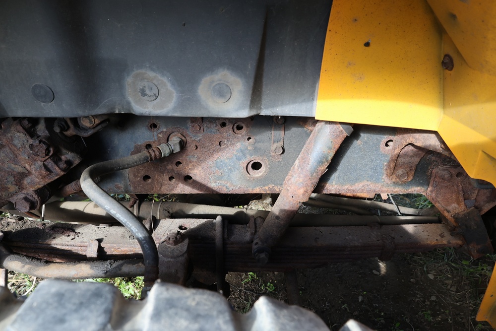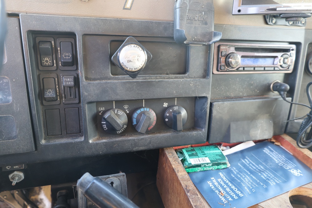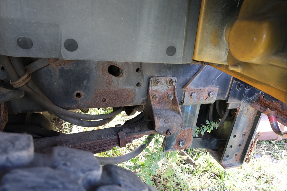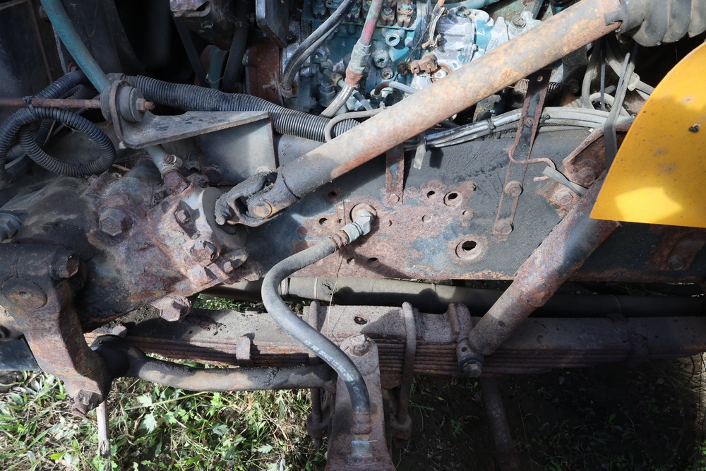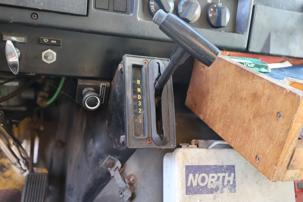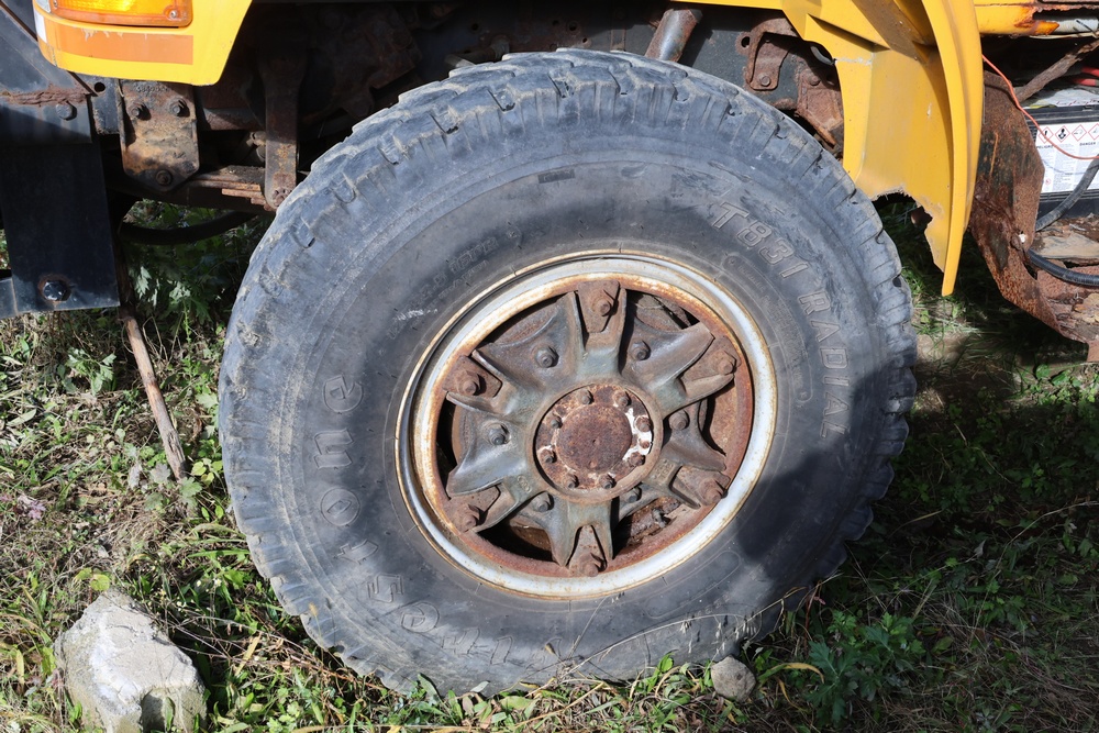 1989 International 4800 4x4 dump truck with automatic transmission. VIN: 1HTSEDBRXLH235186. Odometer reading: 36,295. Exterior: Yellow cab and dump body with dual rear wheels, front plow mount, rear liquid tank, and amber roof light bar. Interior: Brown driver's seat, Panasonic radio, auxiliary switchgear. Tire configuration: Dual rear wheels. Additional equipment includes dump bed, front plow mount. Cab rotted through, suitable for parts. Runs, must be towed. Bill of Sale Only and key available.
