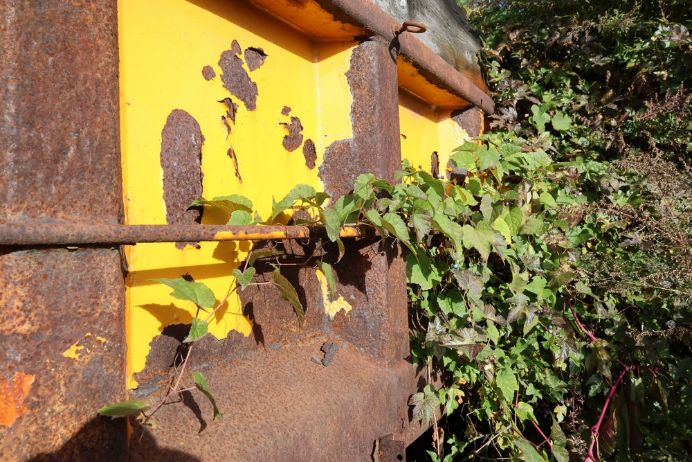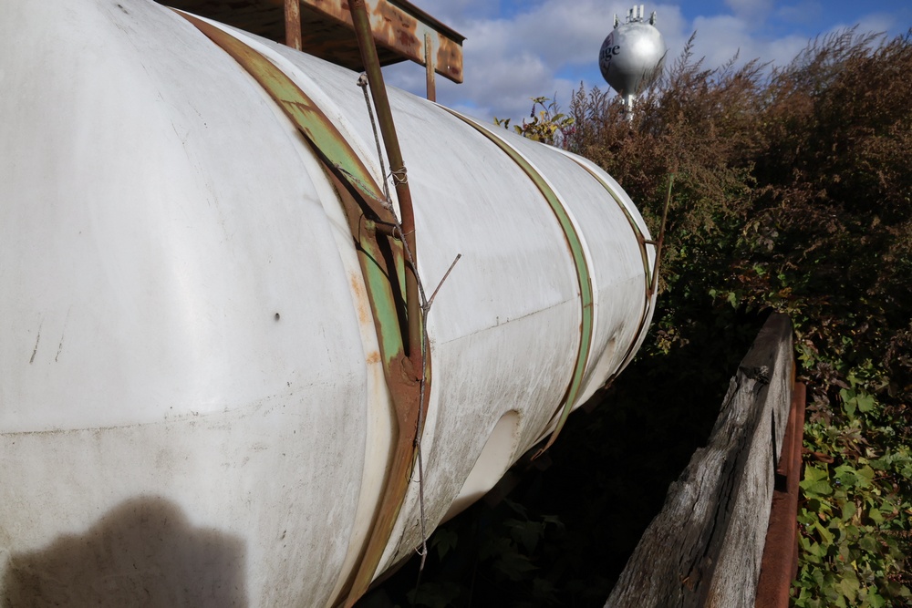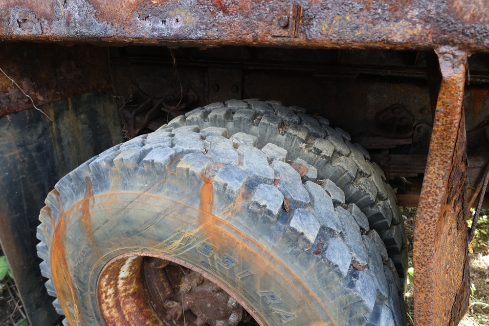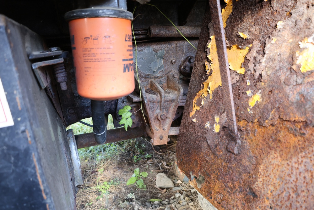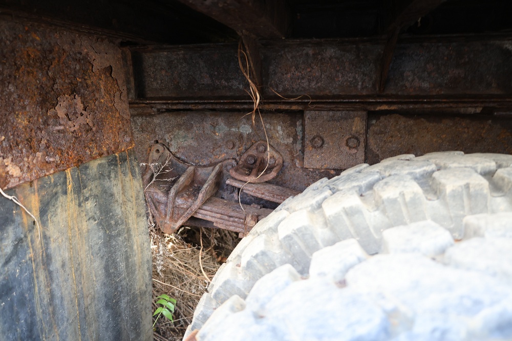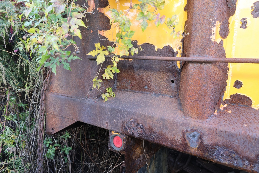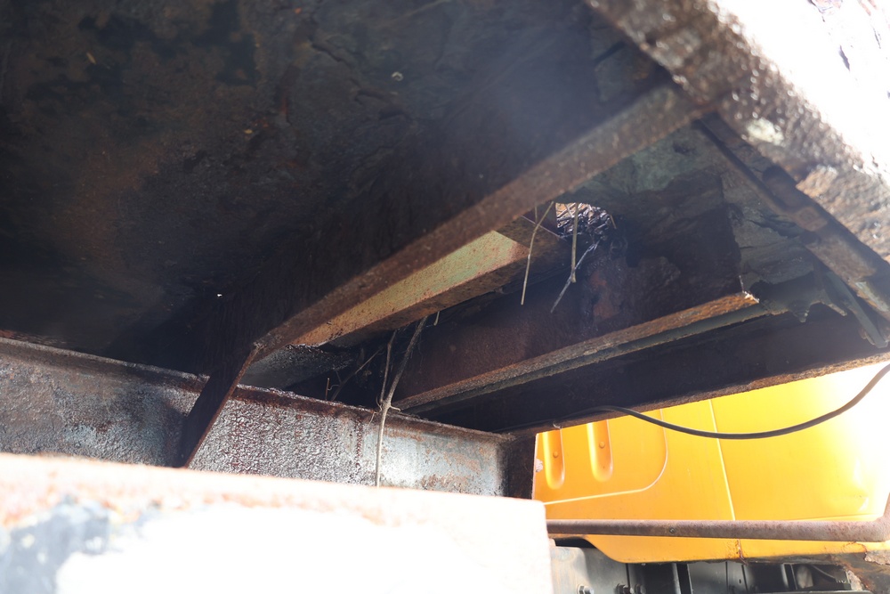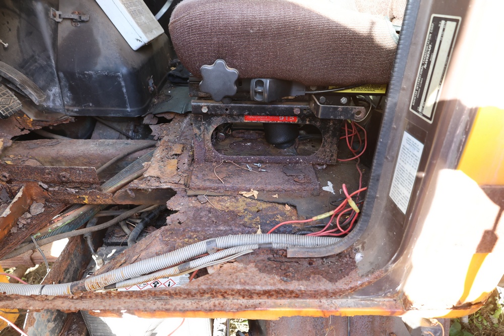 1989 International 4800 4x4 dump truck with automatic transmission. VIN: 1HTSEDBRXLH235186. Odometer reading: 36,295. Exterior: Yellow cab and dump body with dual rear wheels, front plow mount, rear liquid tank, and amber roof light bar. Interior: Brown driver's seat, Panasonic radio, auxiliary switchgear. Tire configuration: Dual rear wheels. Additional equipment includes dump bed, front plow mount. Cab rotted through, suitable for parts. Runs, must be towed. Bill of Sale Only and key available.