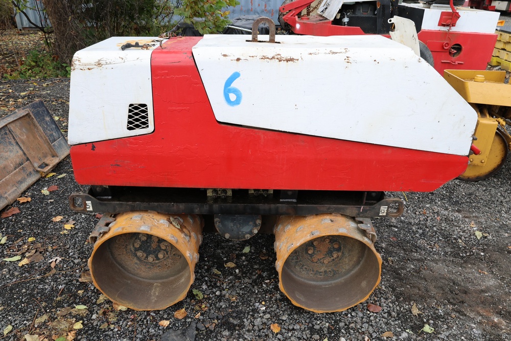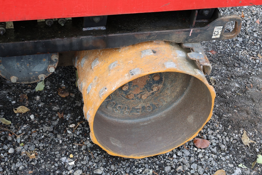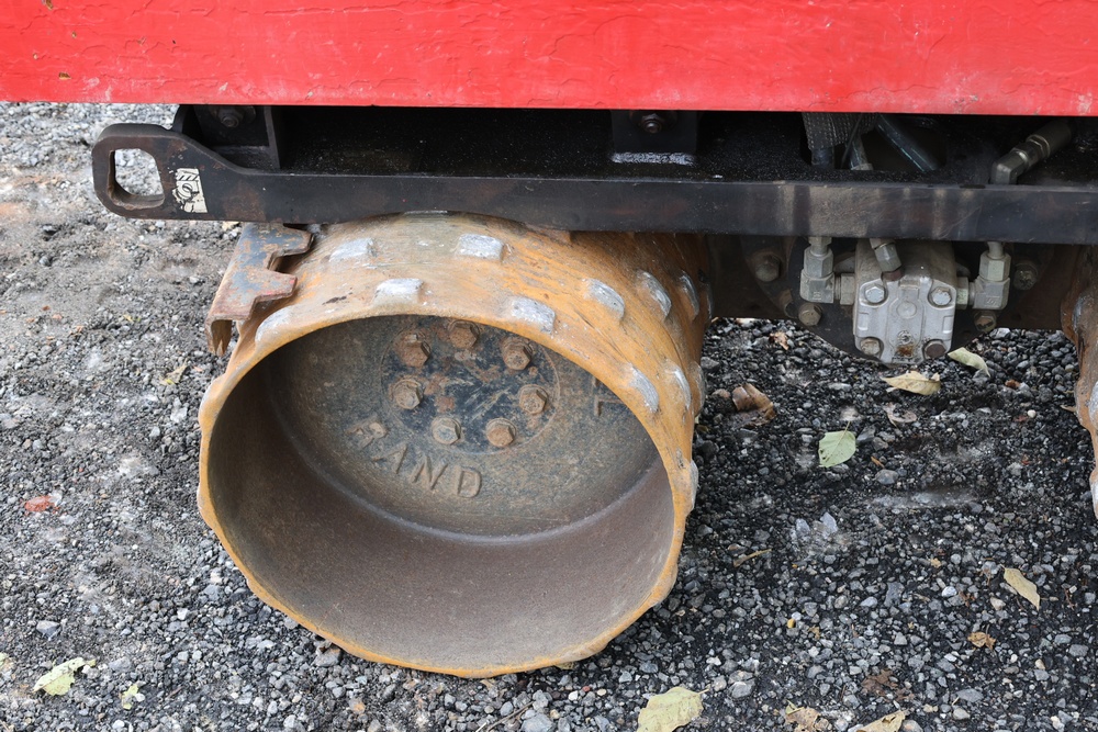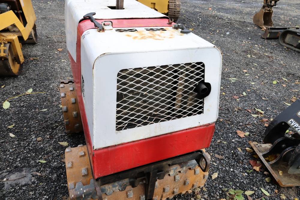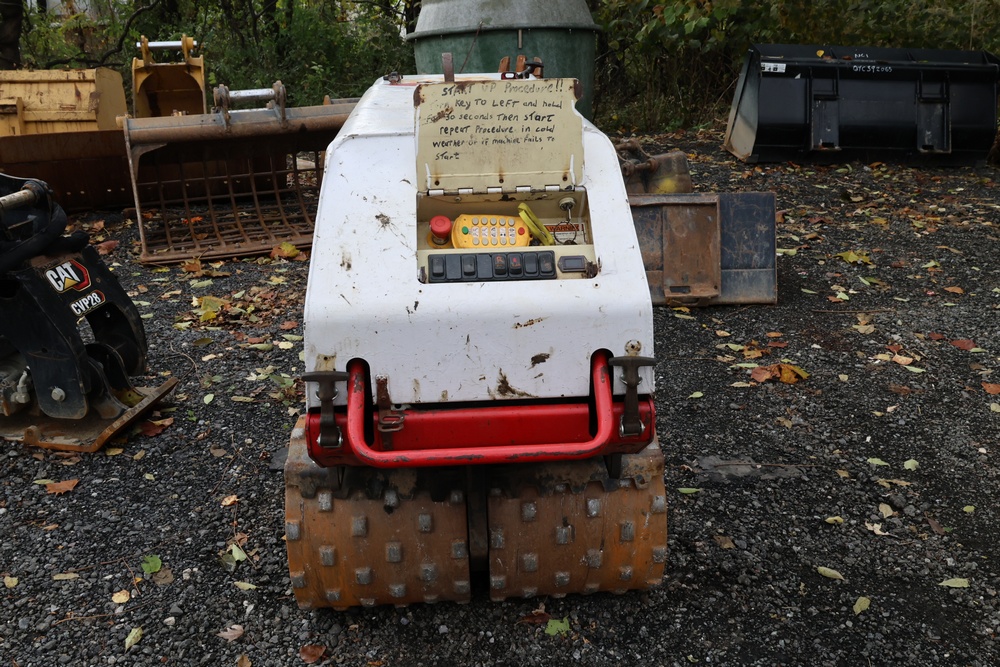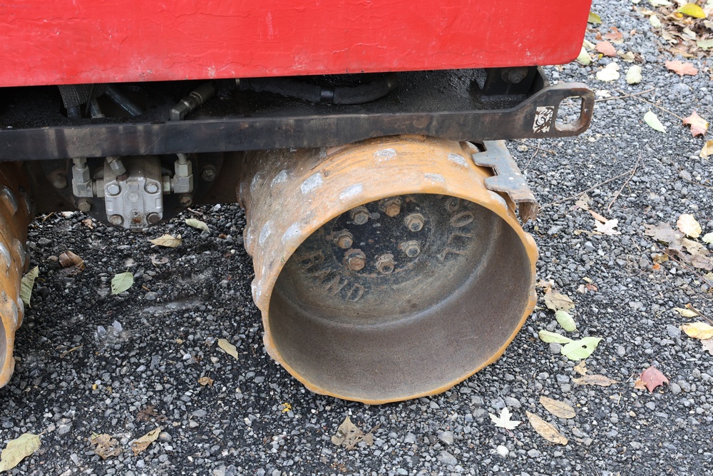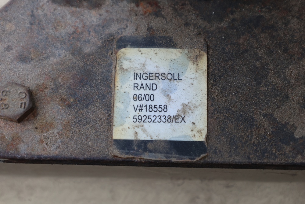 Ingersoll Rand Compactor. Tag dated 06/00, Identification #V18558, Code 59252338/EX. Remote-Controlled Padfoot Trench Roller with Four Steel Drums, Protective Engine Cover, and Omnex R160 Wireless Control System. Runs and operates as intended. Hour meter not functional.