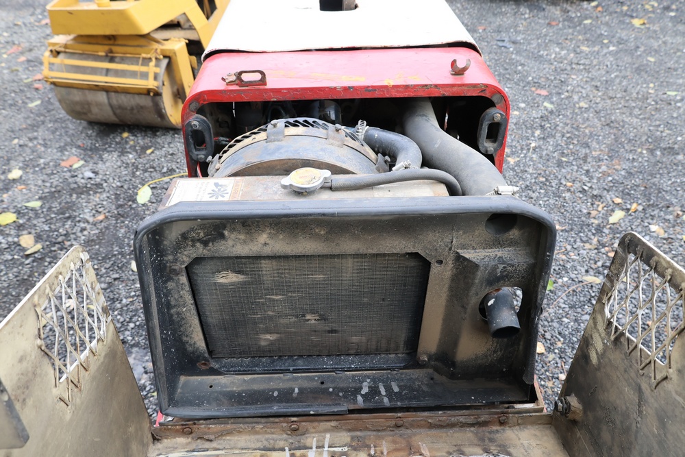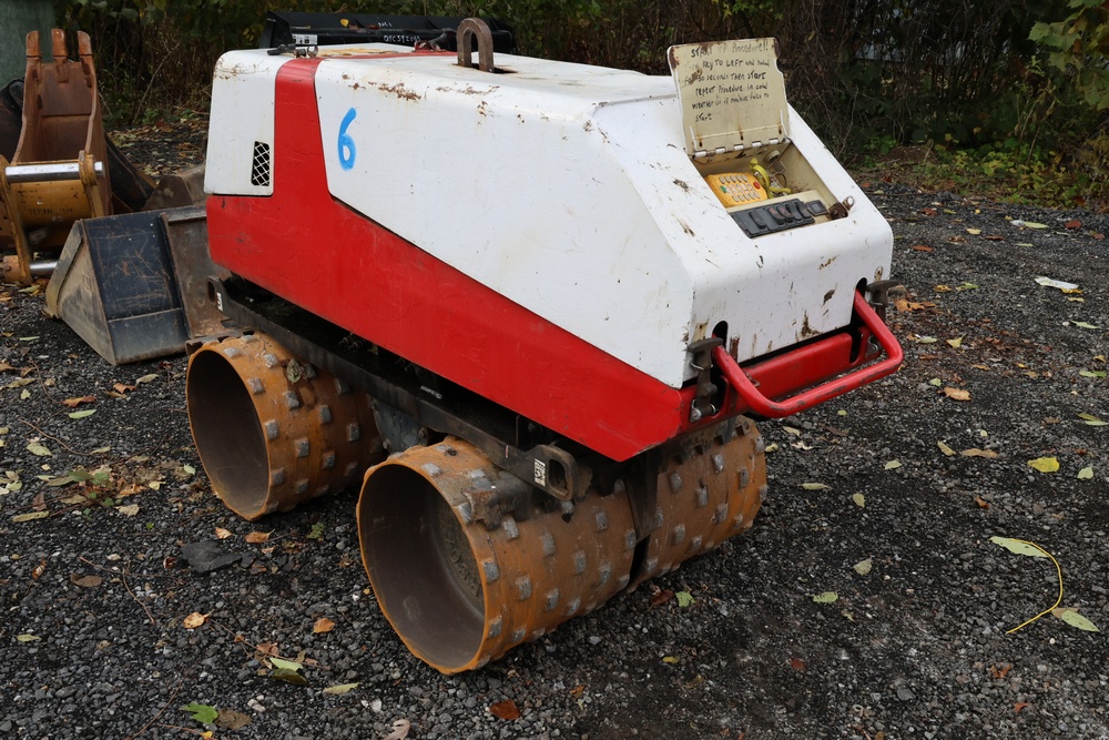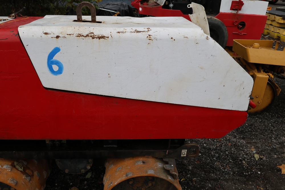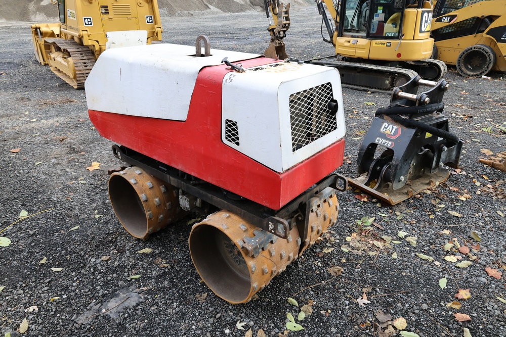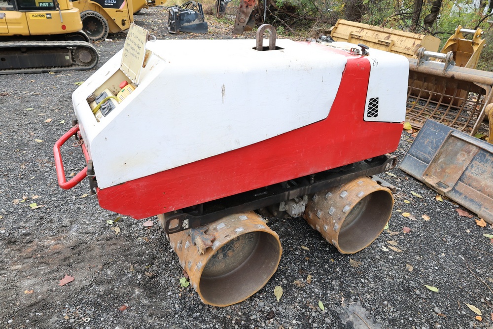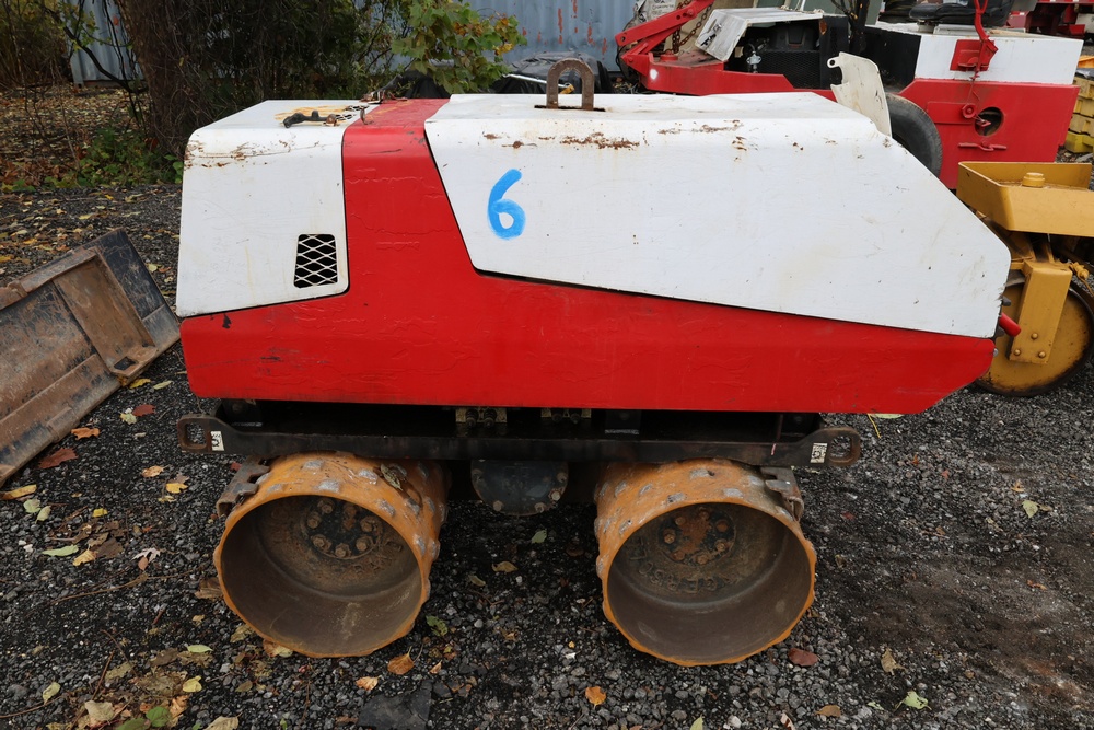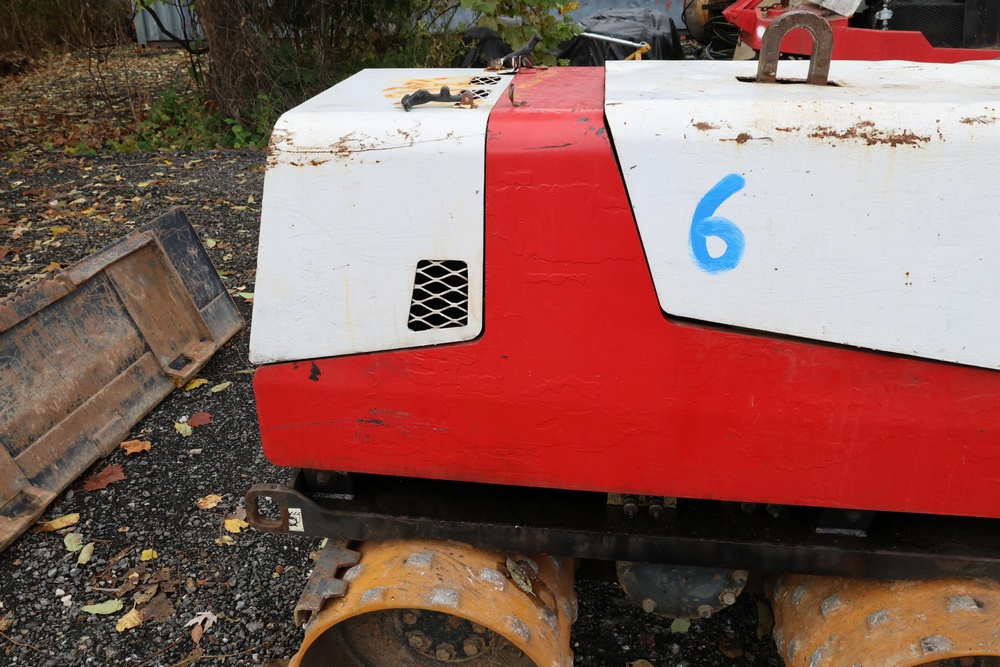 Ingersoll Rand Compactor. Tag dated 06/00, Identification #V18558, Code 59252338/EX. Remote-Controlled Padfoot Trench Roller with Four Steel Drums, Protective Engine Cover, and Omnex R160 Wireless Control System. Runs and operates as intended. Hour meter not functional.