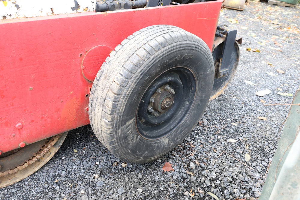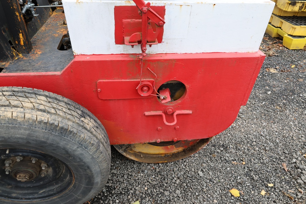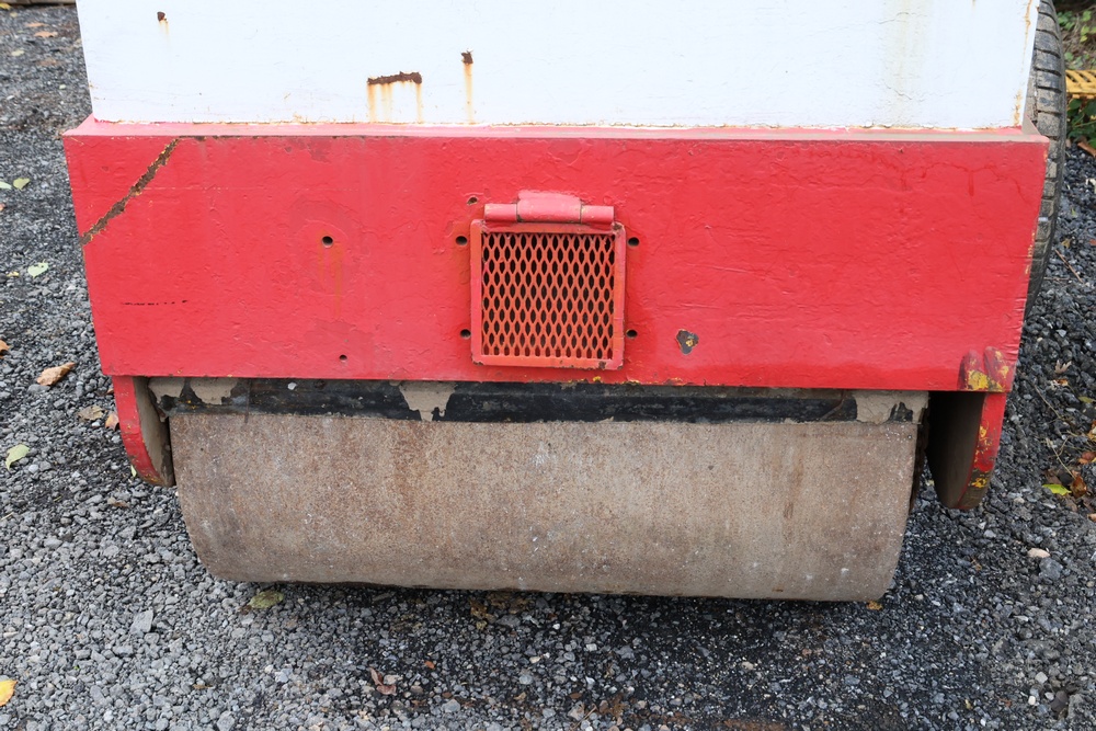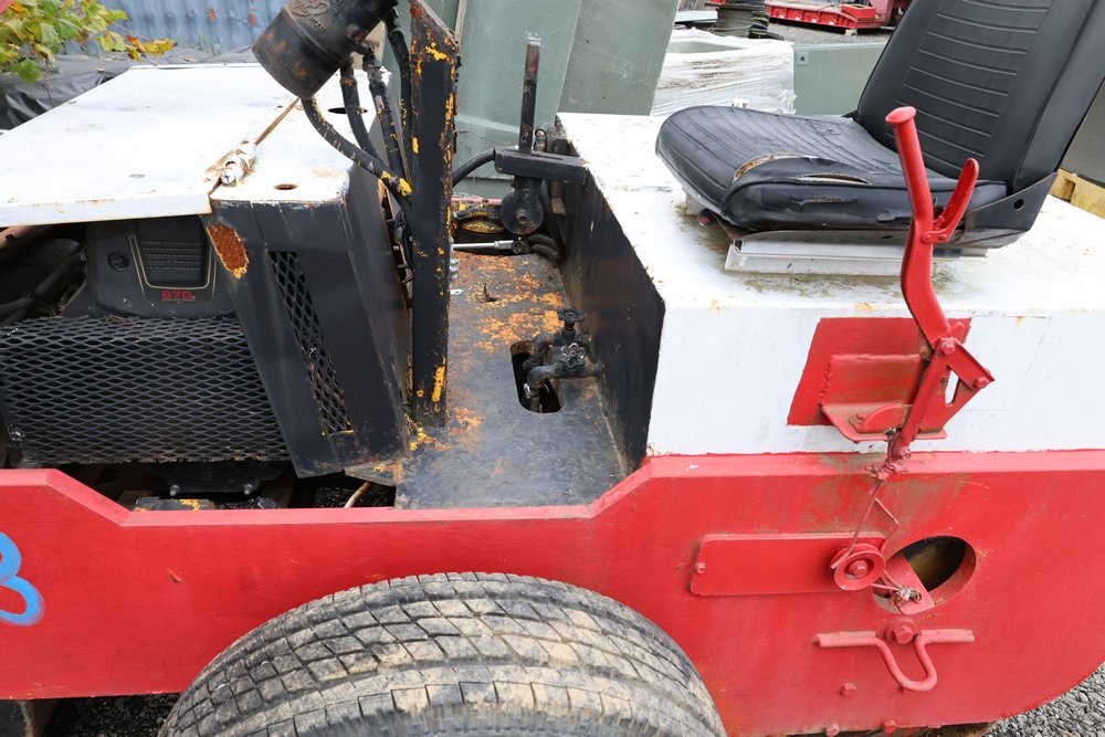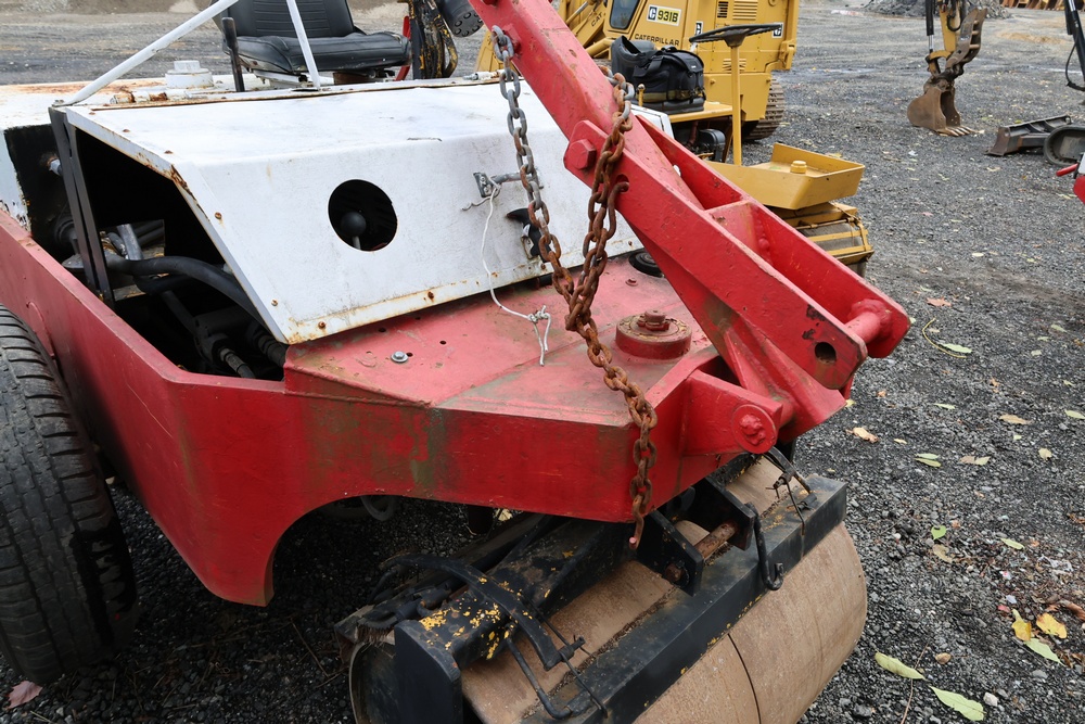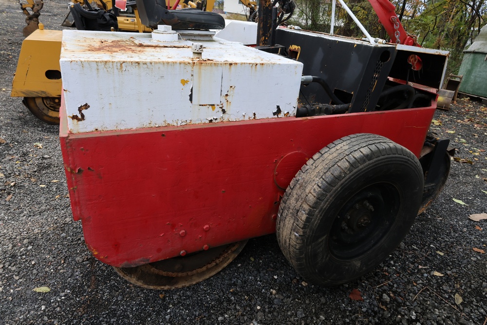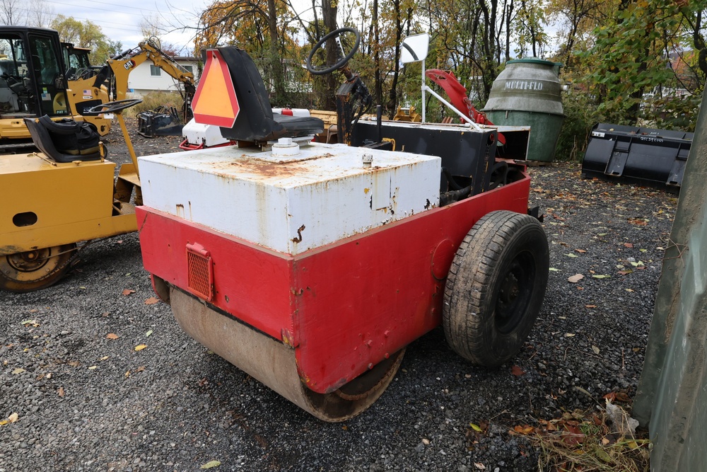 General Engines Co. Roller tow behind Ride-On Steel Drum Roller with Hydraulic Drive, Front and Rear Drums, and Rear Pneumatic Transport Tires. Powered by Predator 670cc Gasoline Engine. Equipped with Hydraulic Control Levers, Adjustable Seat, and Steering Wheel. Manufactured by General Engines Co., Thorofare, New Jersey. Runs and operates as intended.