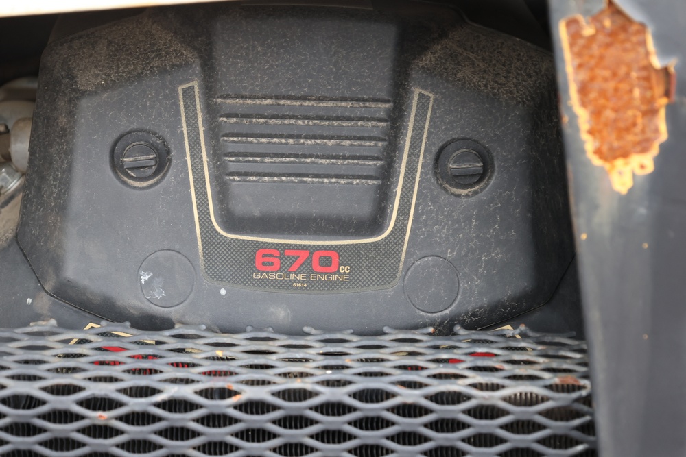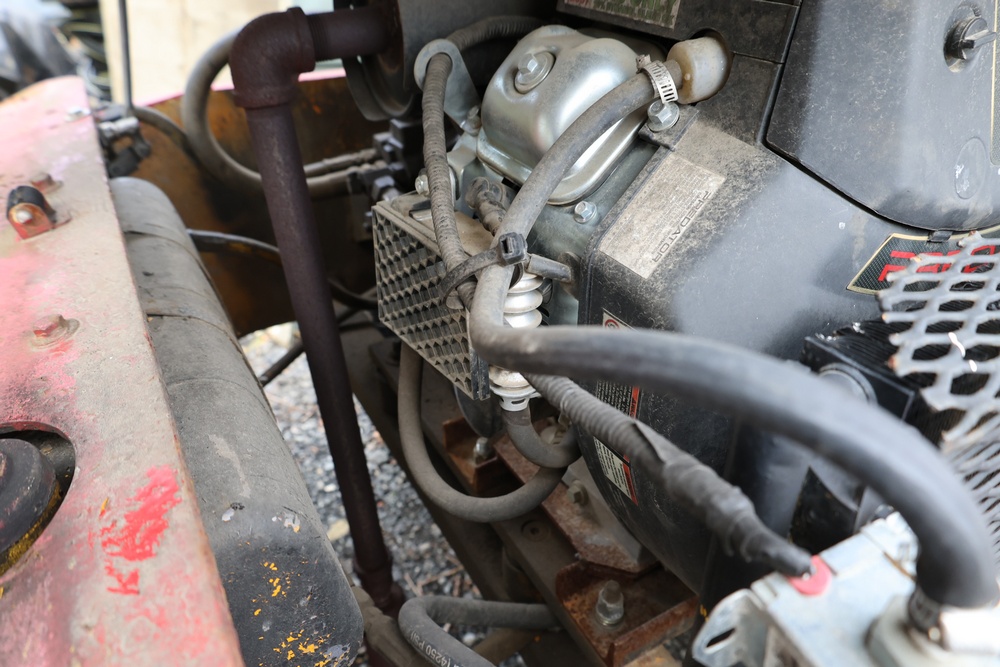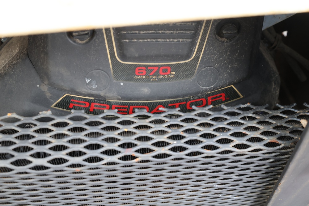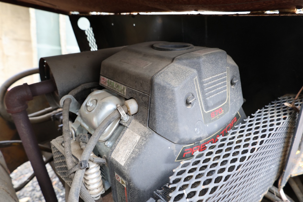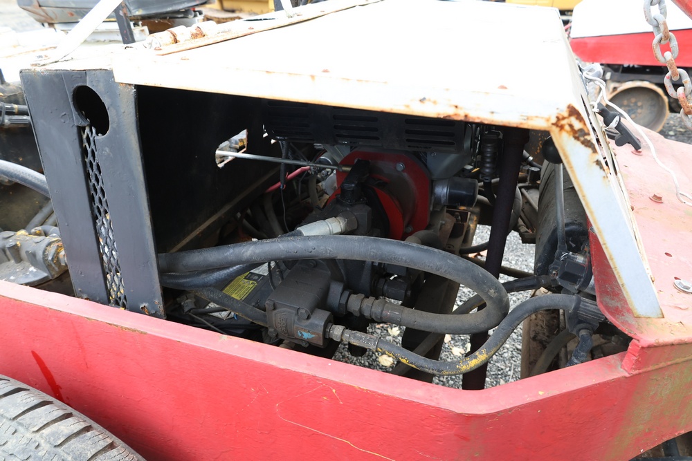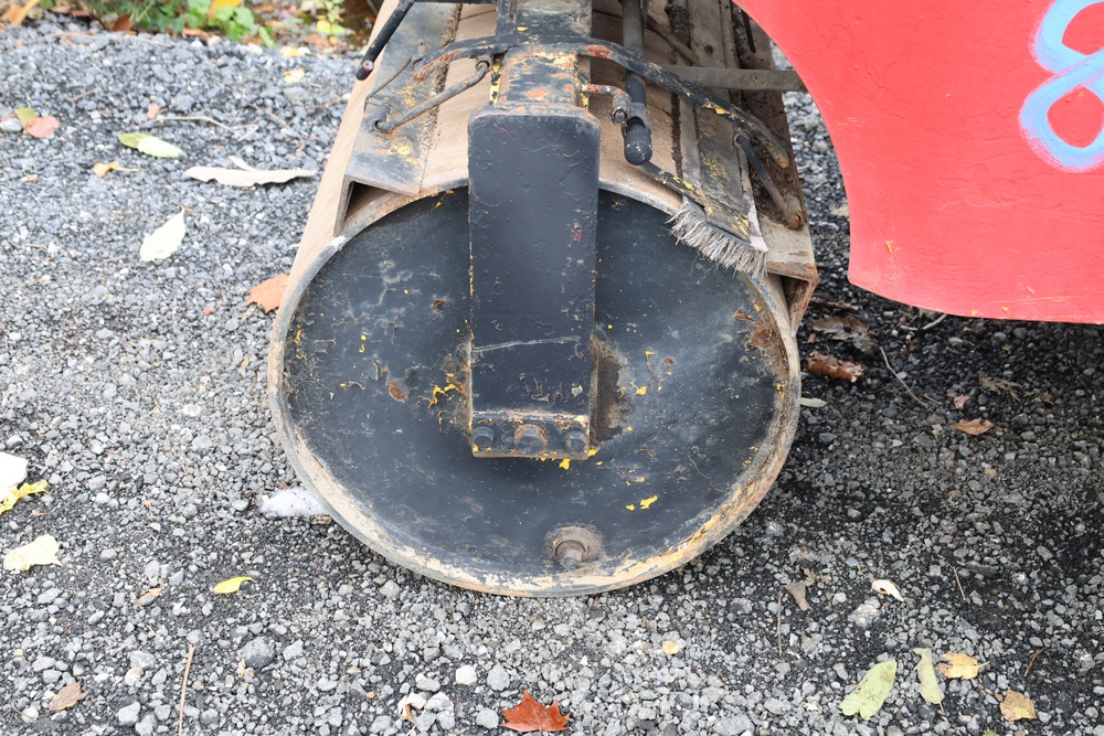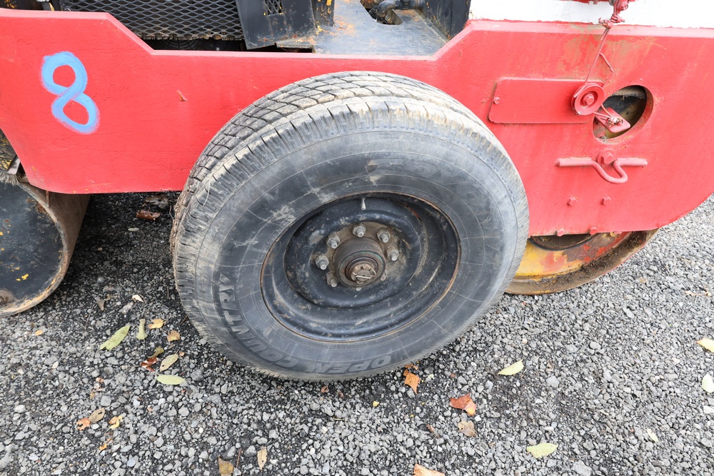 General Engines Co. Roller tow behind Ride-On Steel Drum Roller with Hydraulic Drive, Front and Rear Drums, and Rear Pneumatic Transport Tires. Powered by Predator 670cc Gasoline Engine. Equipped with Hydraulic Control Levers, Adjustable Seat, and Steering Wheel. Manufactured by General Engines Co., Thorofare, New Jersey. Runs and operates as intended.