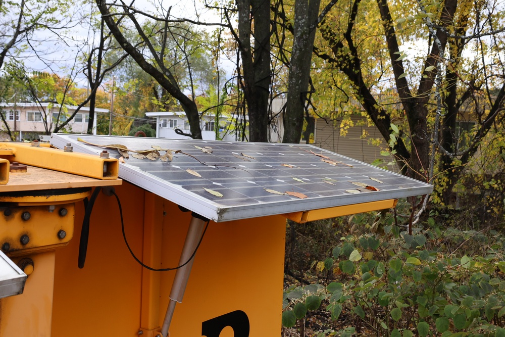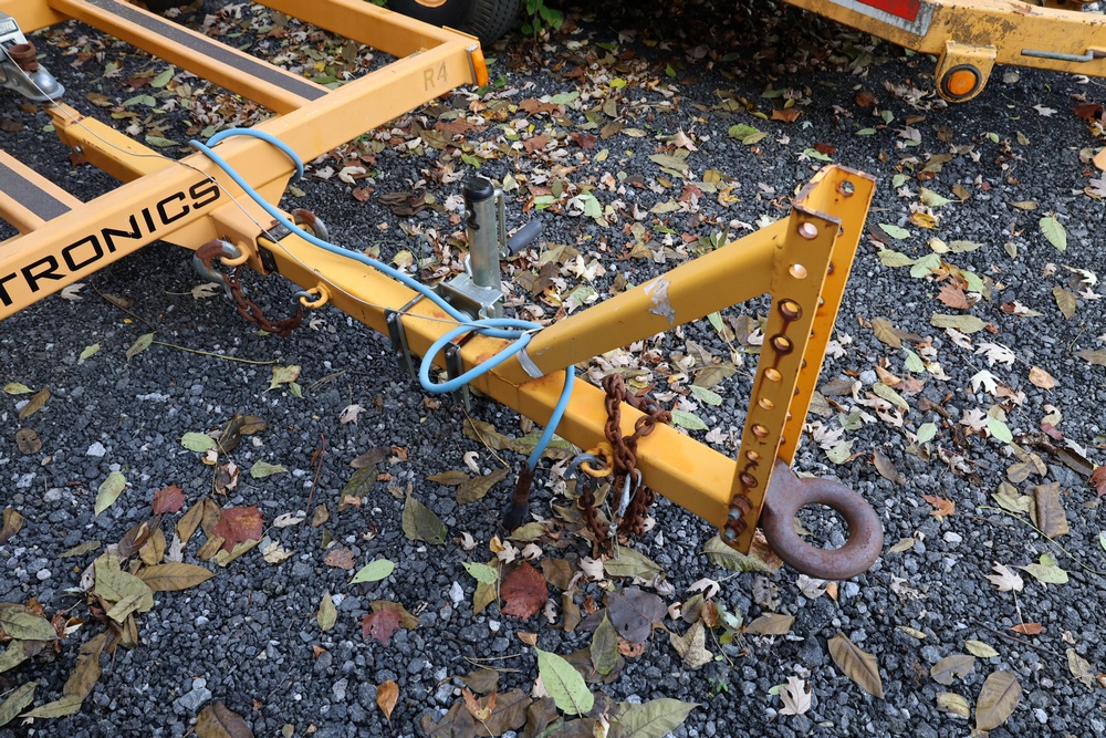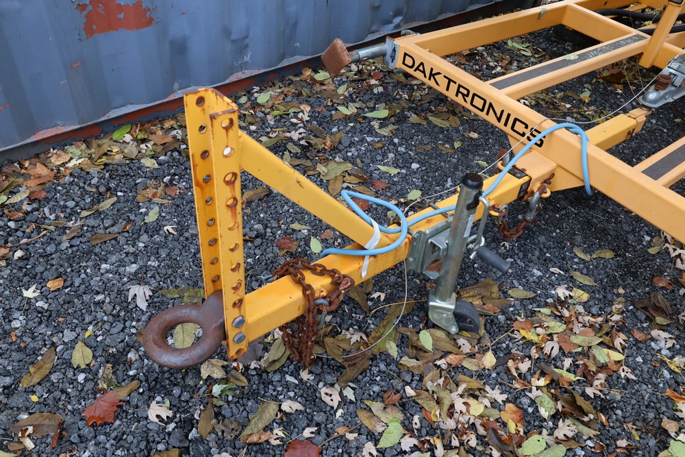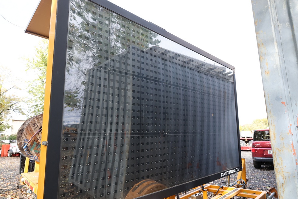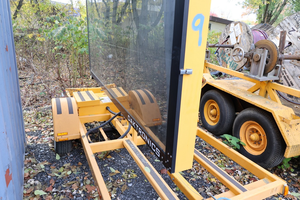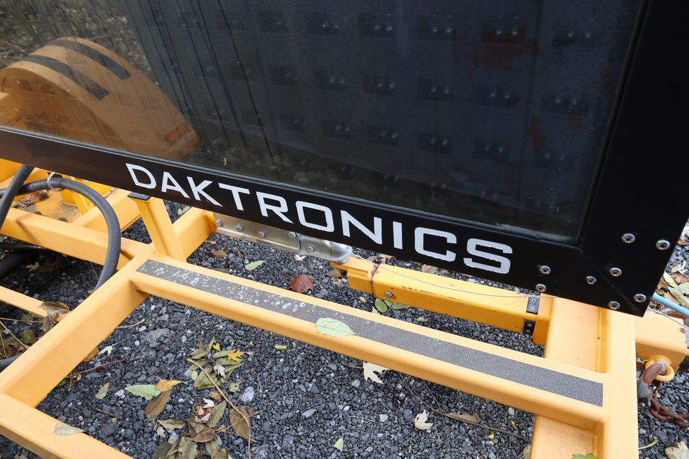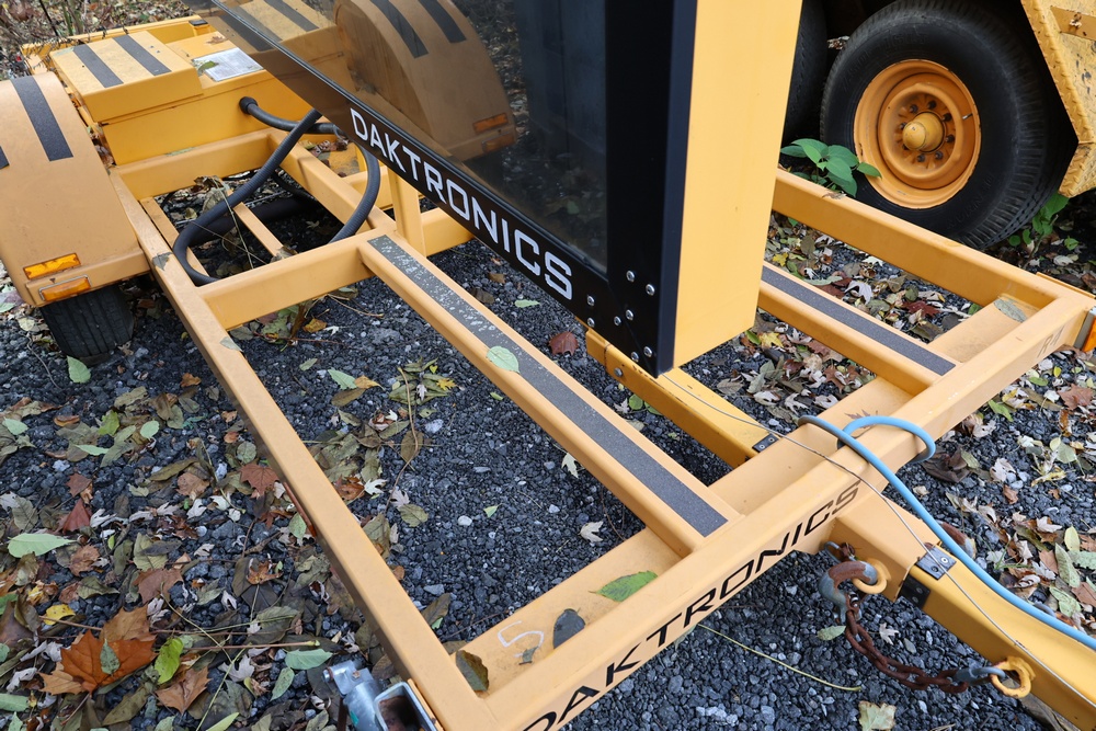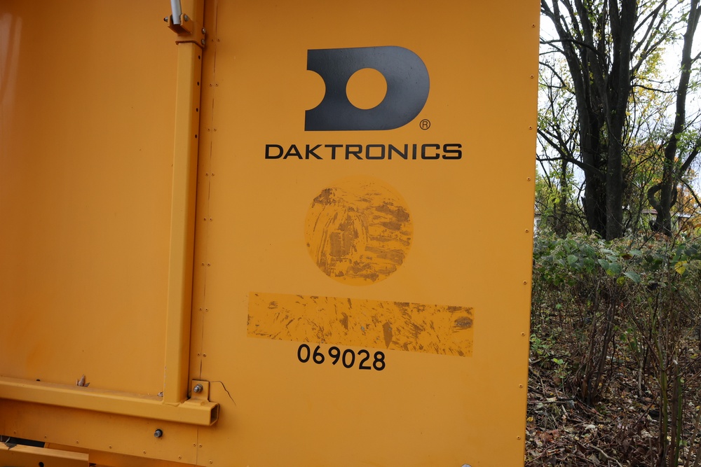 Daktronics Portable Message Board Trailer, Serial #069028. Solar-Powered Variable Message Sign (VMS) with Dual Solar Panels, Hydraulic Lift, and LED Display Panel. Yellow Steel Frame, Adjustable Pintle Hitch, and Manual Jack Stand. Equipped with Daktronics Control System and Power Box. Hasn't been used by the seller, unknown if operational.