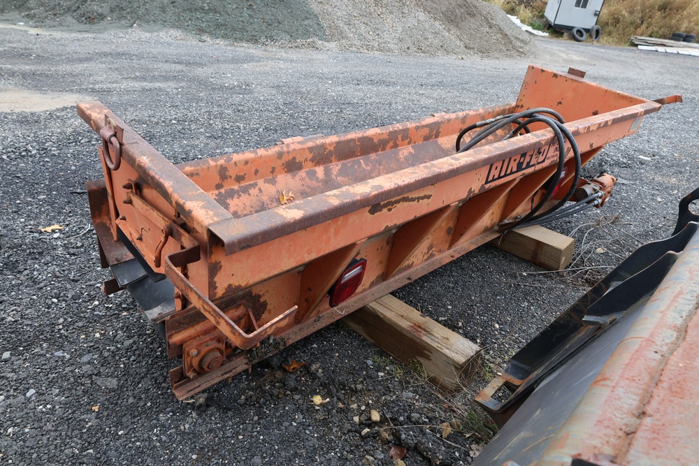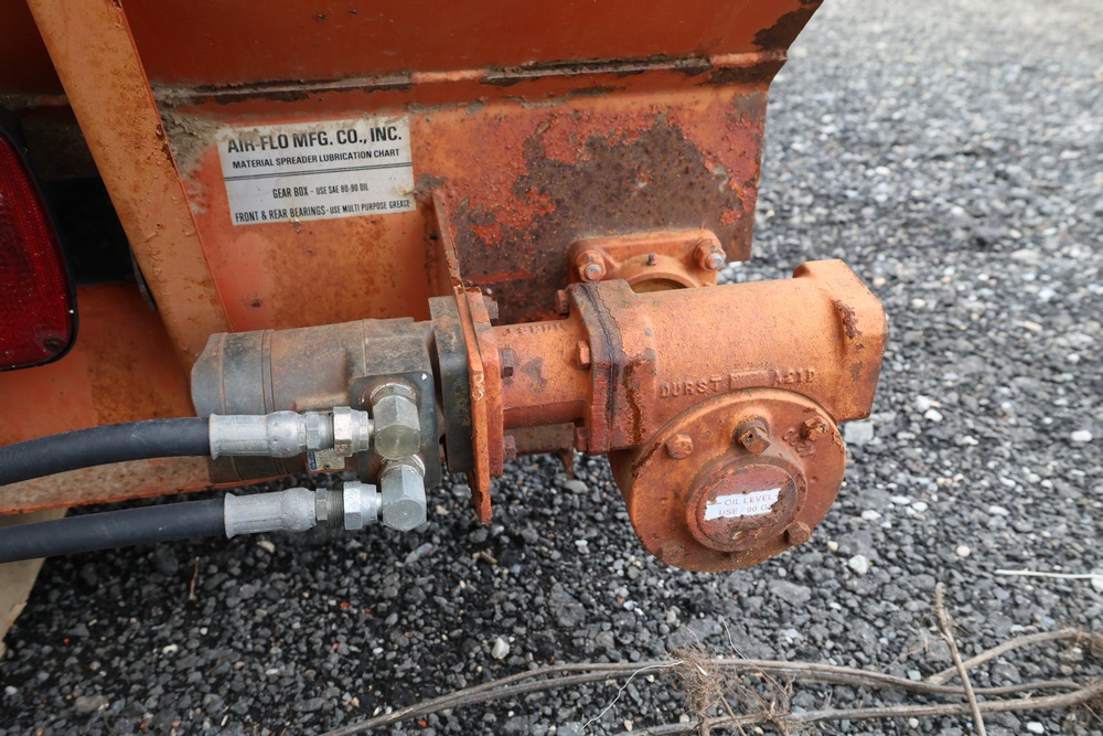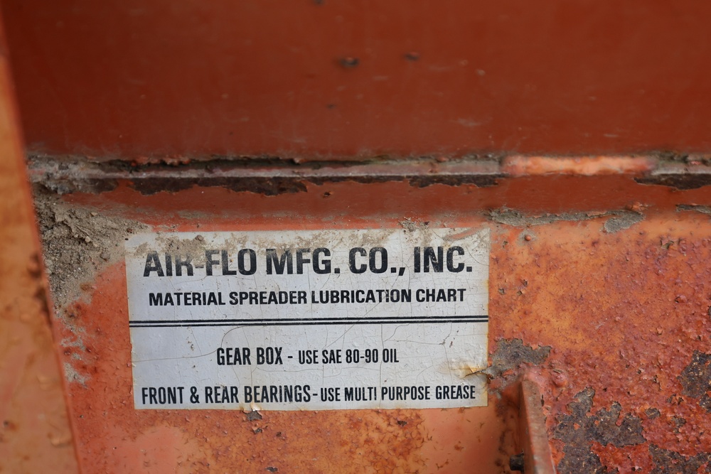Air-Flo Manufacturing Co. hydraulic material spreader, Prattsburg, New York. Unit features dual hydraulic lines, conveyor-style feed system, and rear discharge gate. Equipped with a Durst gearbox and lubrication chart specifying SAE 80-90 oil for the gearbox and multi-purpose grease for front and rear bearings.