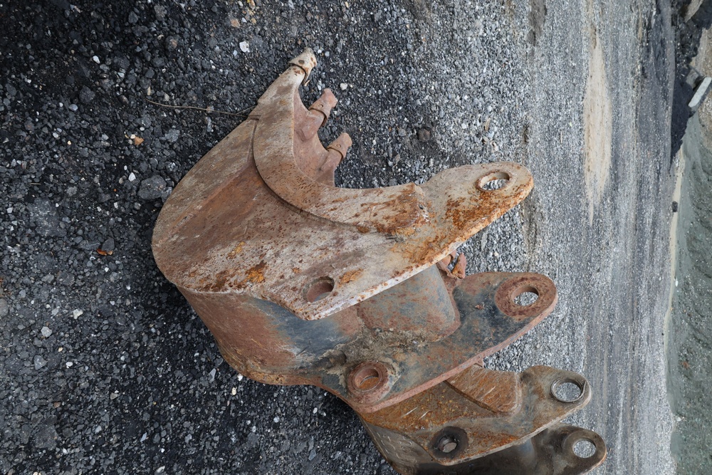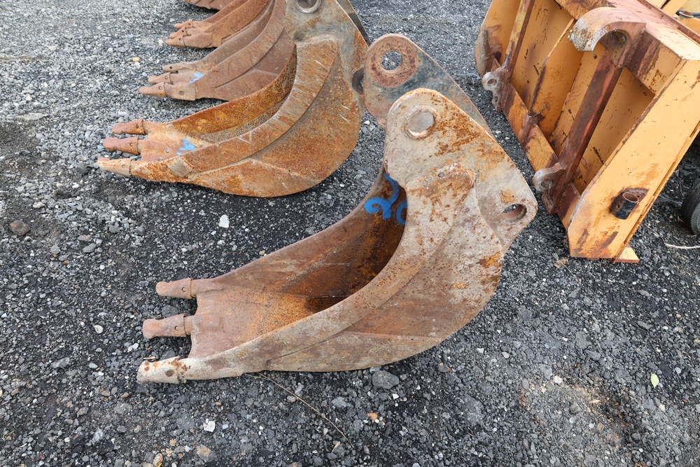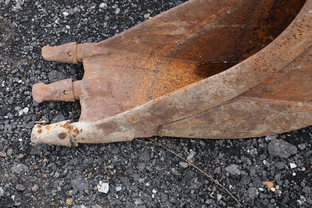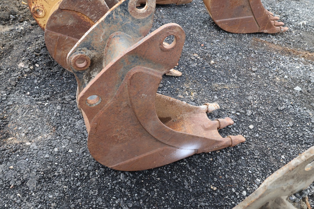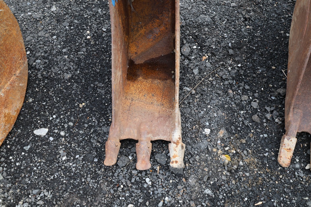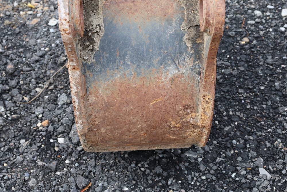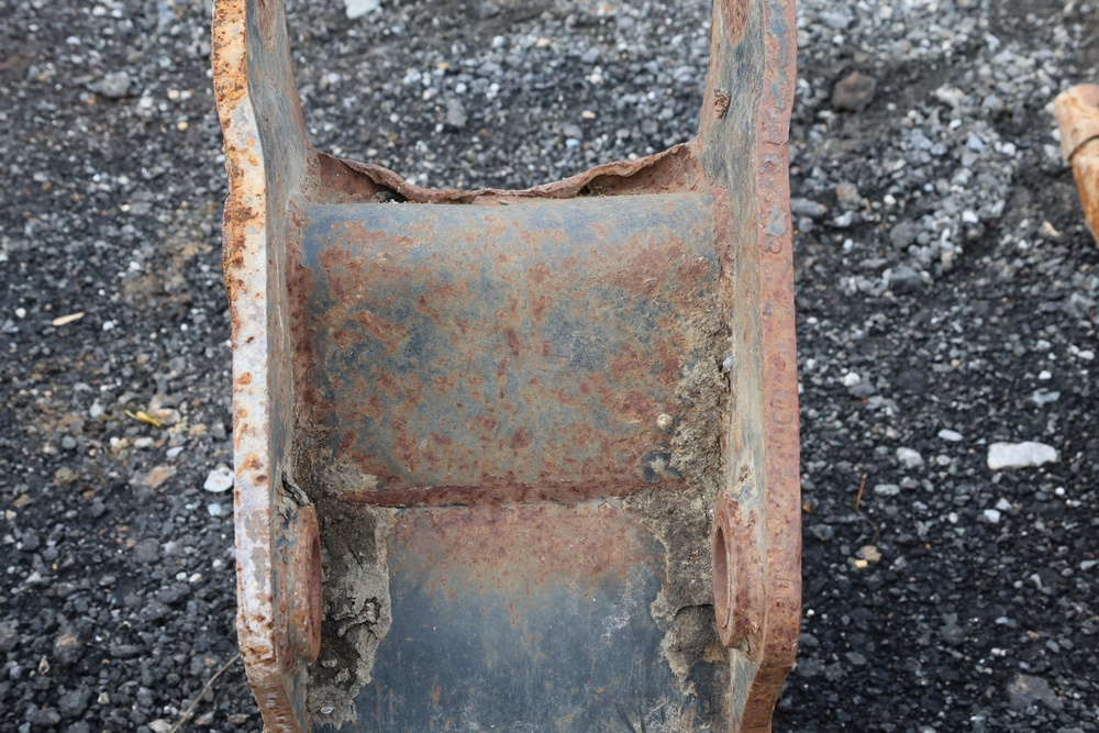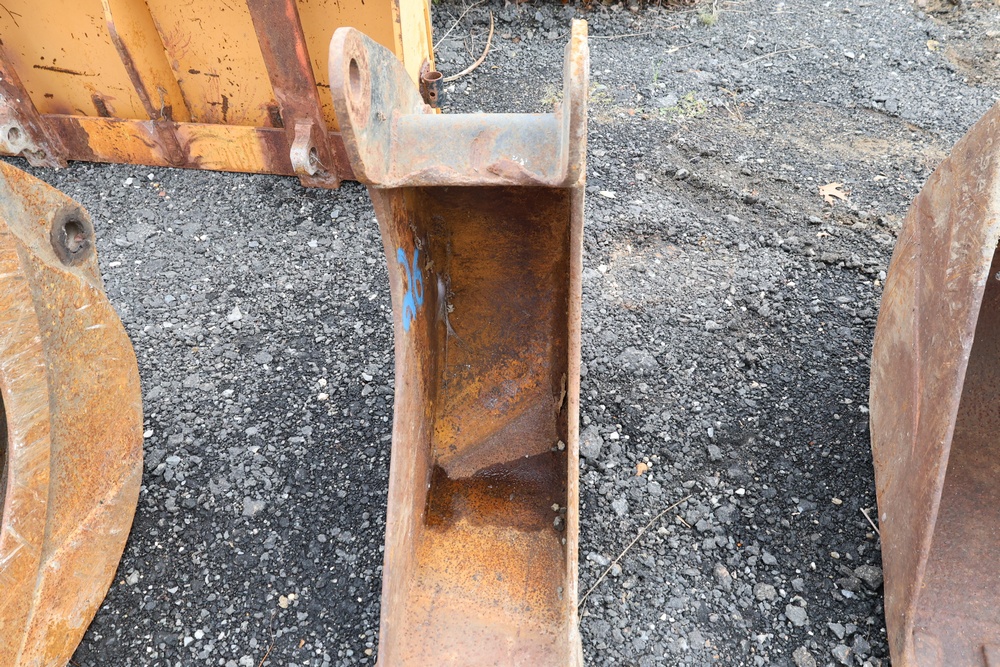 Narrow trenching bucket built for precision excavation and utility work. It features two teeth with a deep, curved profile ideal for narrow trench cutting and pipe installation. For use with CAT 416 or older 420 backhoe.