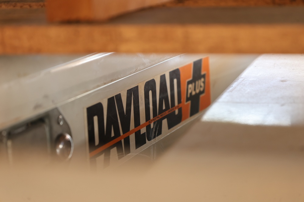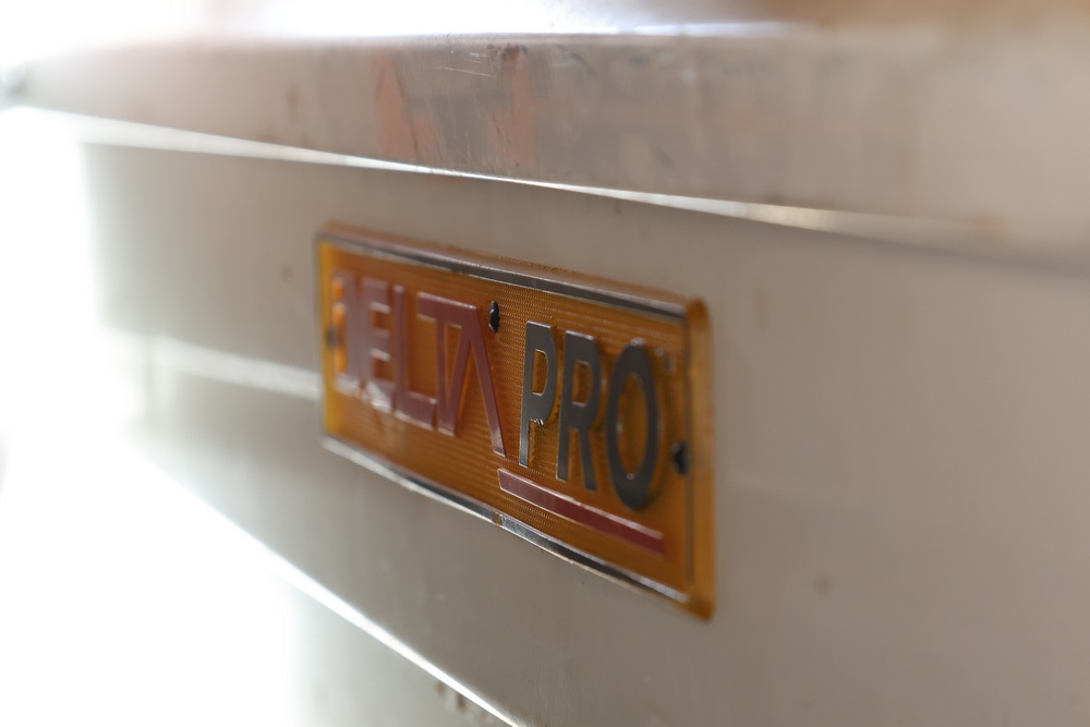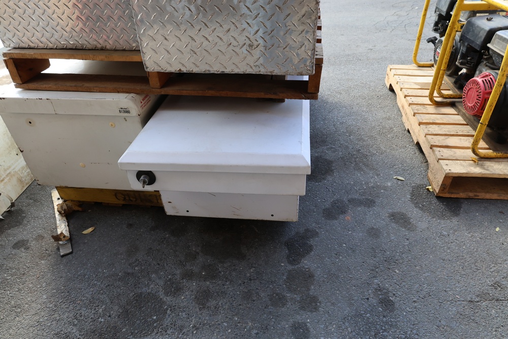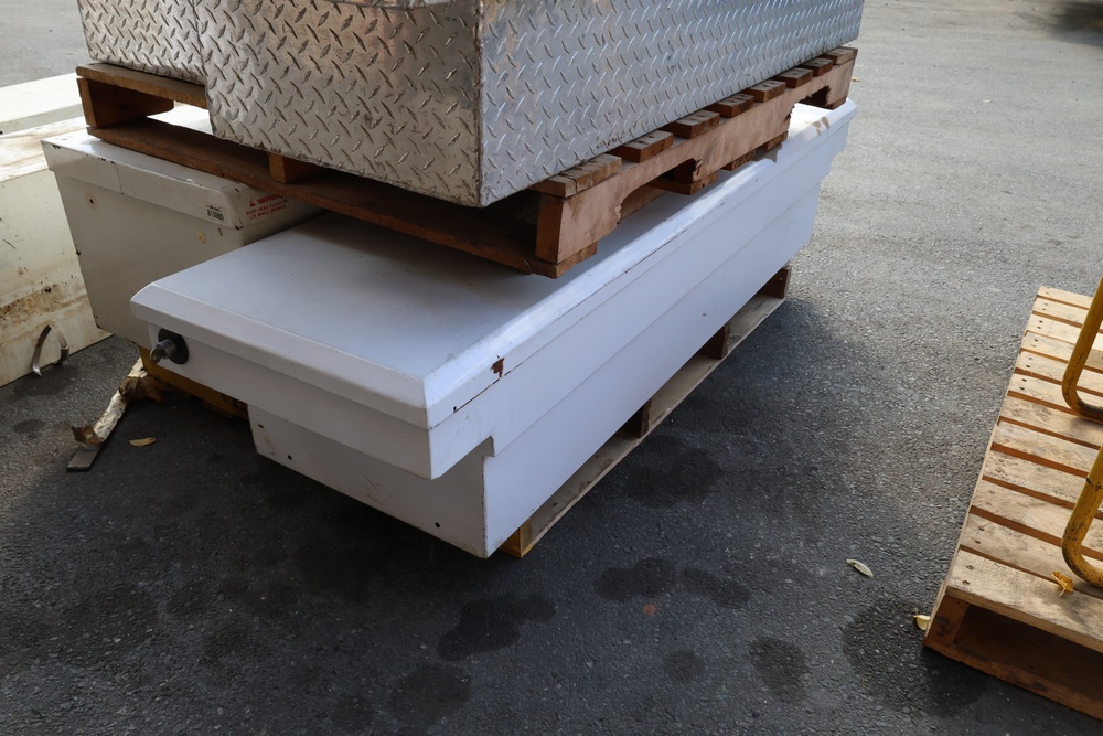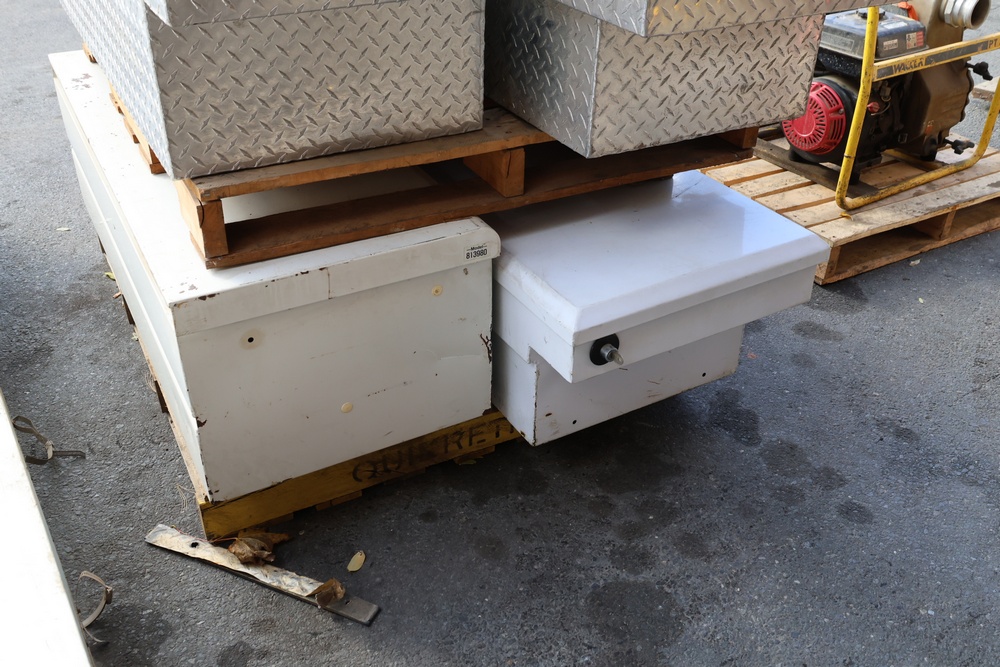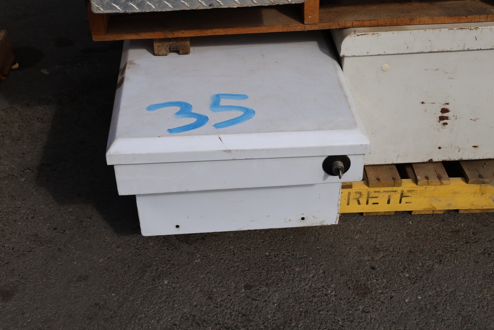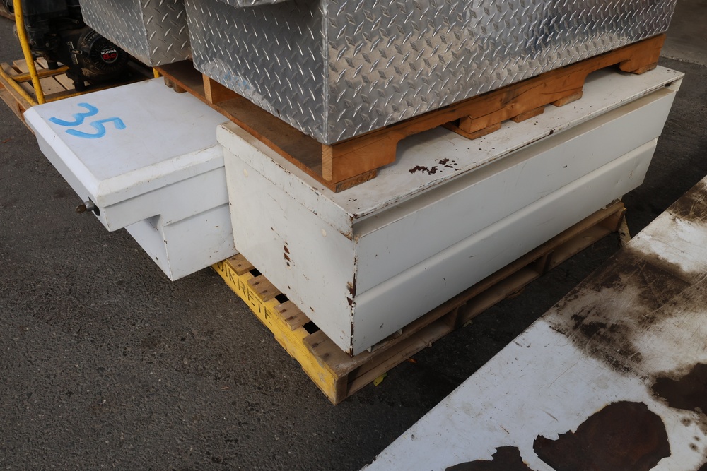 Two white metal crossover truck tool boxes stacked on a wooden pallet, with one sitting on top of the other. The top box displays a painted blue number "35" on its lid, and a visible emblem identifies it as a DELTA PRO model. The larger box underneath features a PAYLOAD PLUS decal on its side.
