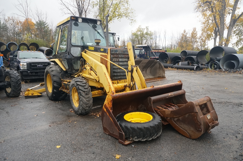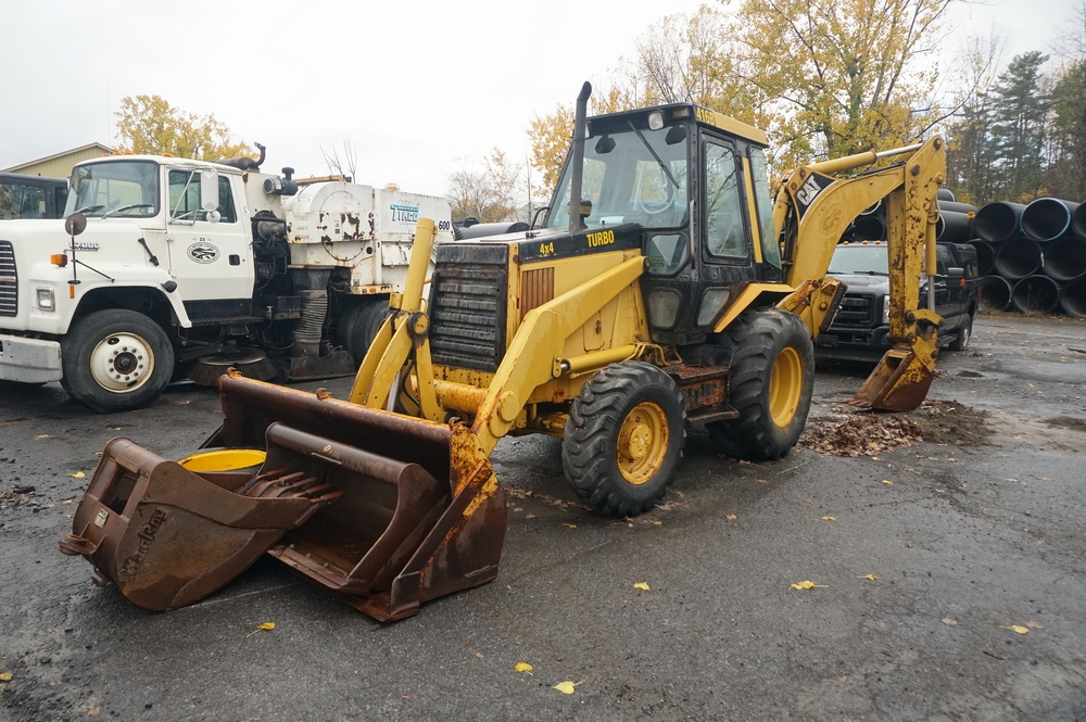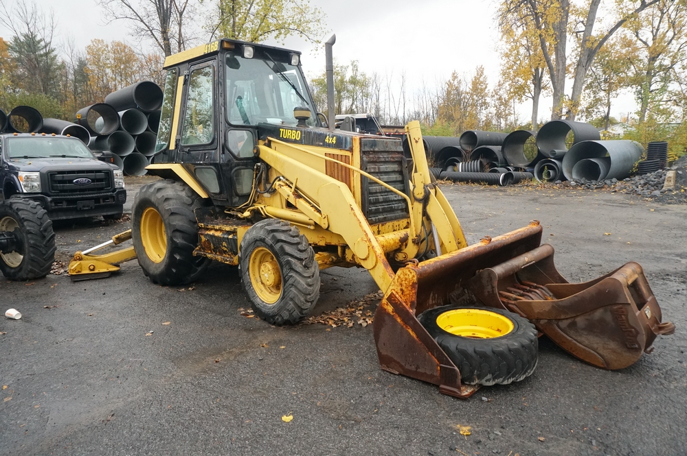Items include 2015 Ford F350 XLT, 1993 Caterpillar 416b Backhoe Loader, 2010 Freightliner M2112V Dump Truck, Guardian Power Drill Press, 2008 Volvo VHD648 Dump Truck, 2001 Mid-Atlantic Dump Body Trailer, and more. Items are located in Plattsburgh, NY.