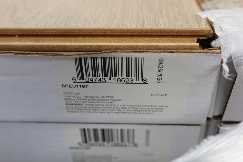 Lot is for 60 cartons of new laminate flooring. 12.27 square feet per carton. 736.20 total square feet. Manufacturer is Mohawk. Product is Revwood Select Boardwalk Collective Sand Dune. This product is Waterproof. Uni-Clic floating locking system. 2nd quality indicating up to 10% of product may have minor imperfections such as markings, off-shade, blister/missing spot of wood grain, sample board.
