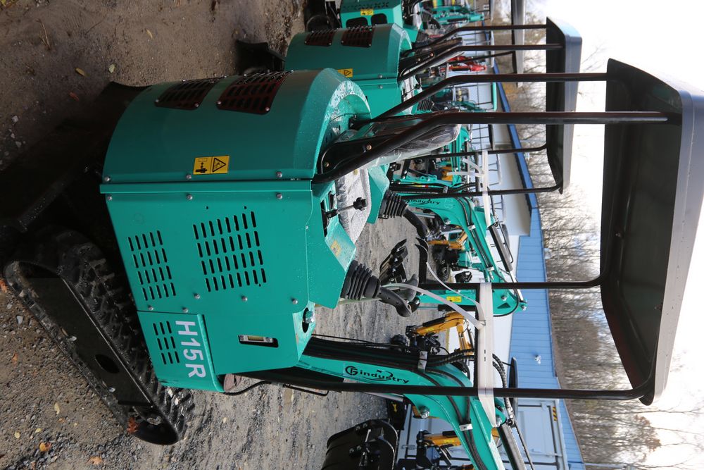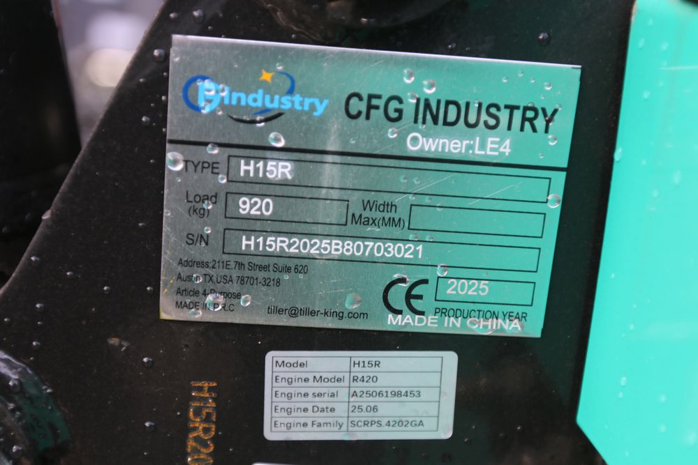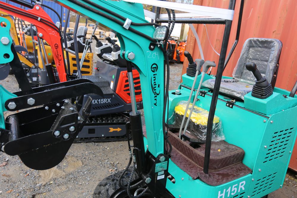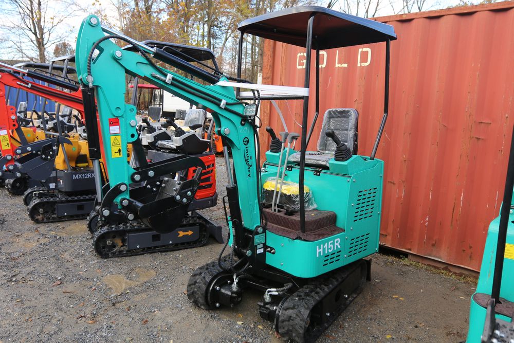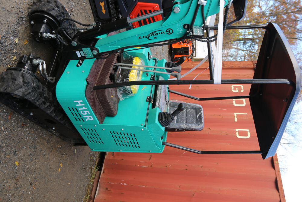 New 2025 CFG Industrial industrial gas powered mini Excavator model H15R with 420cc gasoline engine, bucket, 4' long tracks, 38.5" wide base, 6" wide tracks, canopy, hydraulic boom & bucket controls, pilot system, thumb, dozer blade.