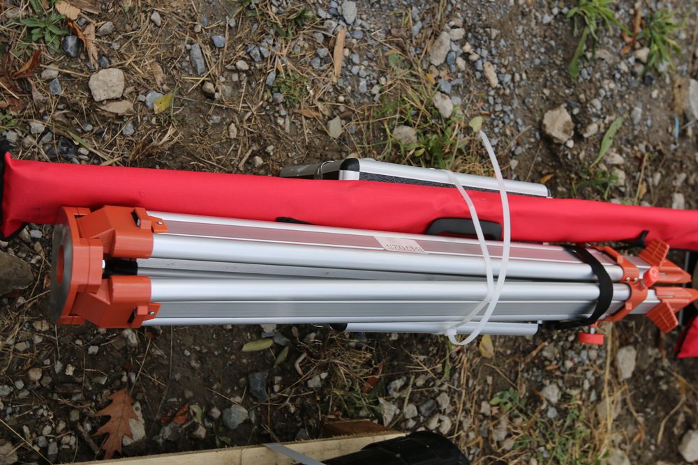 New SKLP self-leveling rotary laser level with batteries, receiver, tripod, and grade rod.