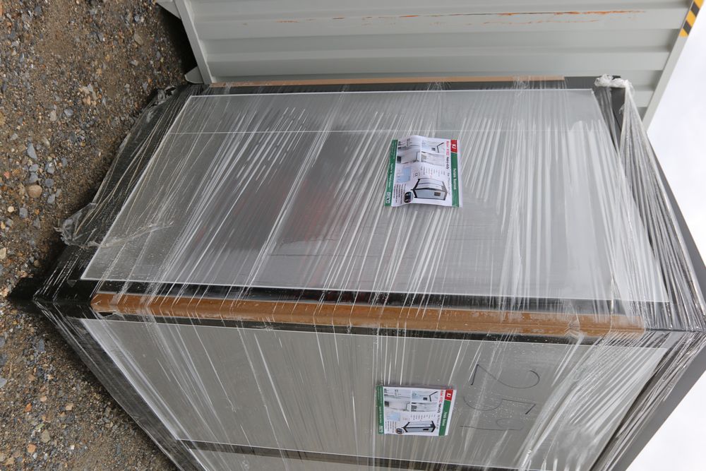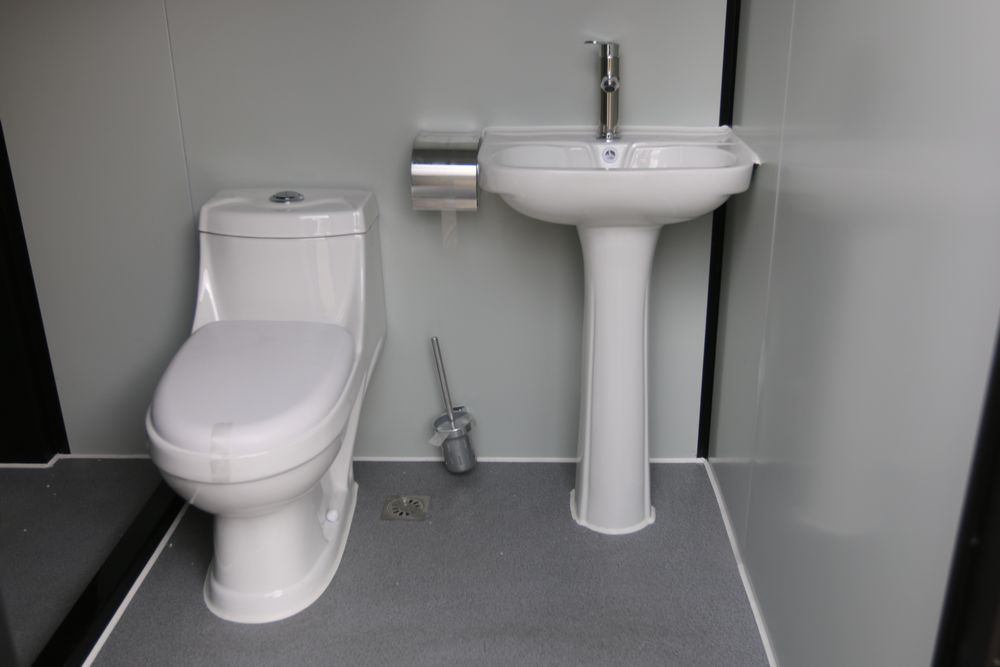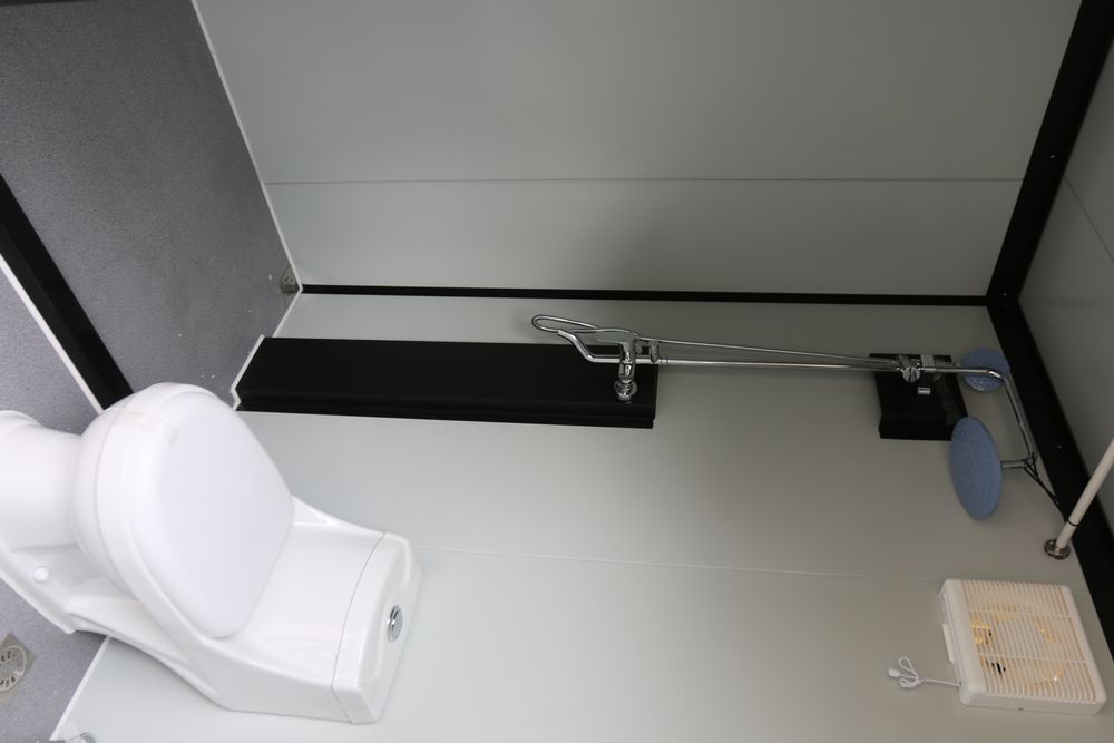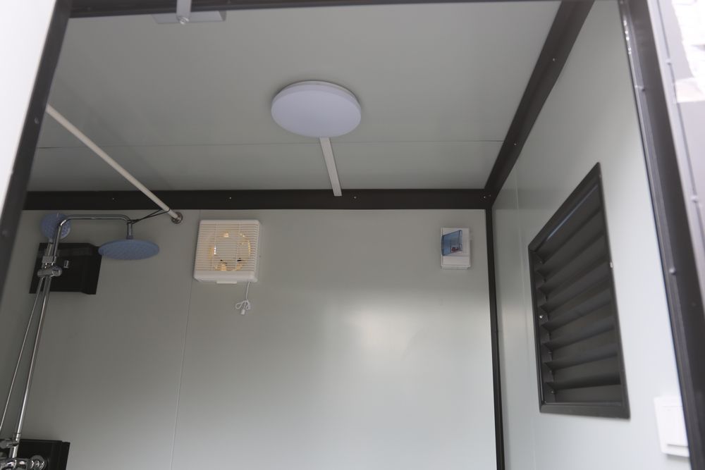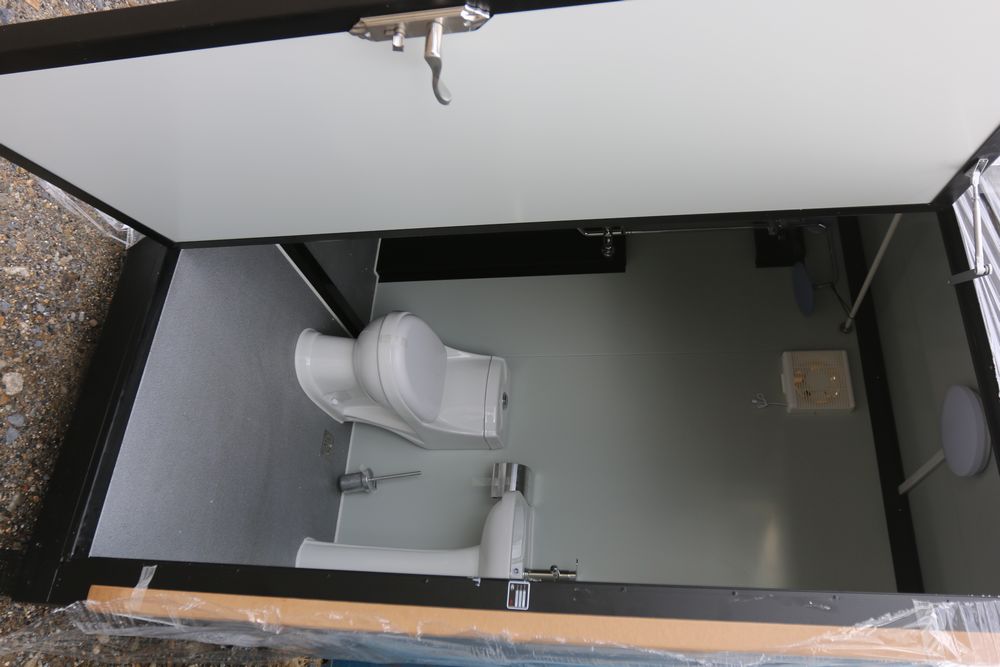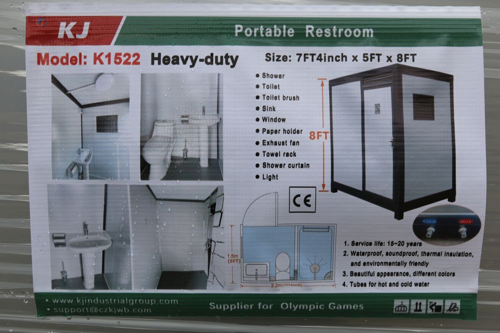 New KJ portable restroom 7'4" X 5' X 8', includes shower, toilet, sink, window, paper holder, exhaust fan, towel rack, shower curtain, light, model K1522.