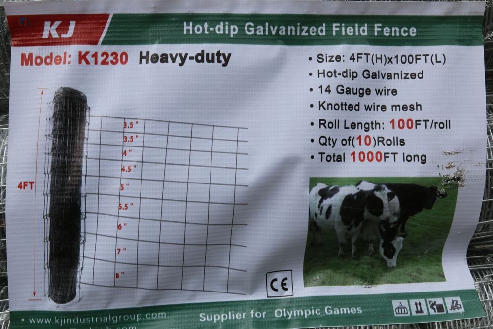 New KJ Hot-dip Galvanized field fence, 4'Tx100'L, 14 gauge wire, 100 feet/roll, 10 rolls total, model K1230.