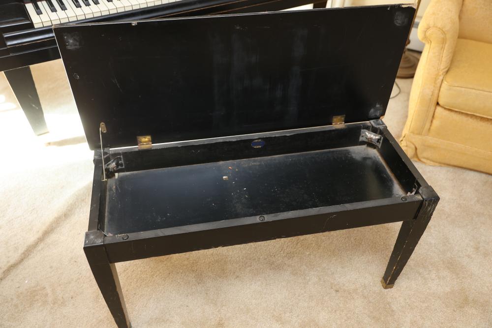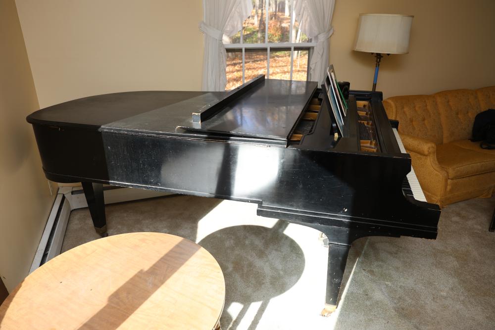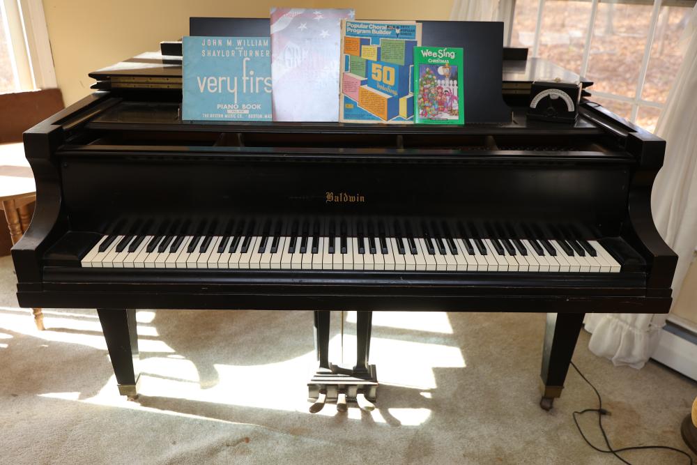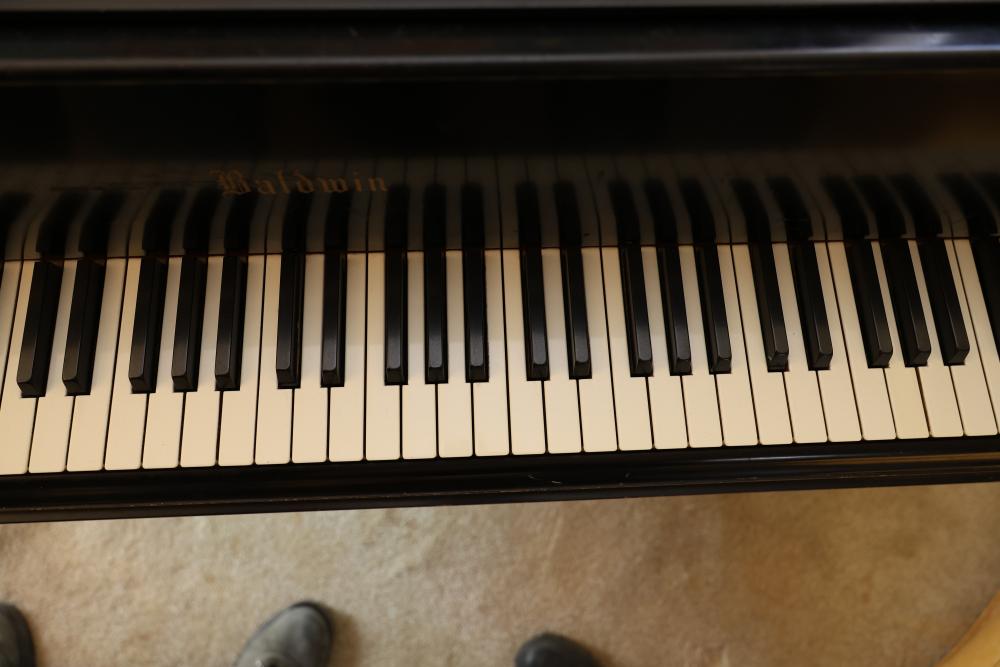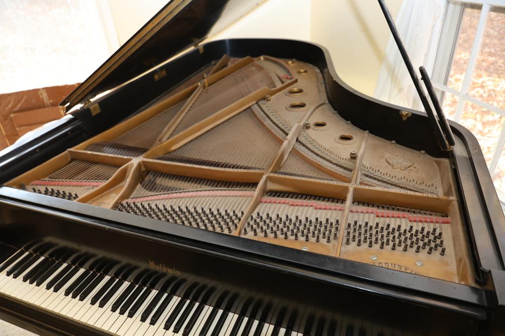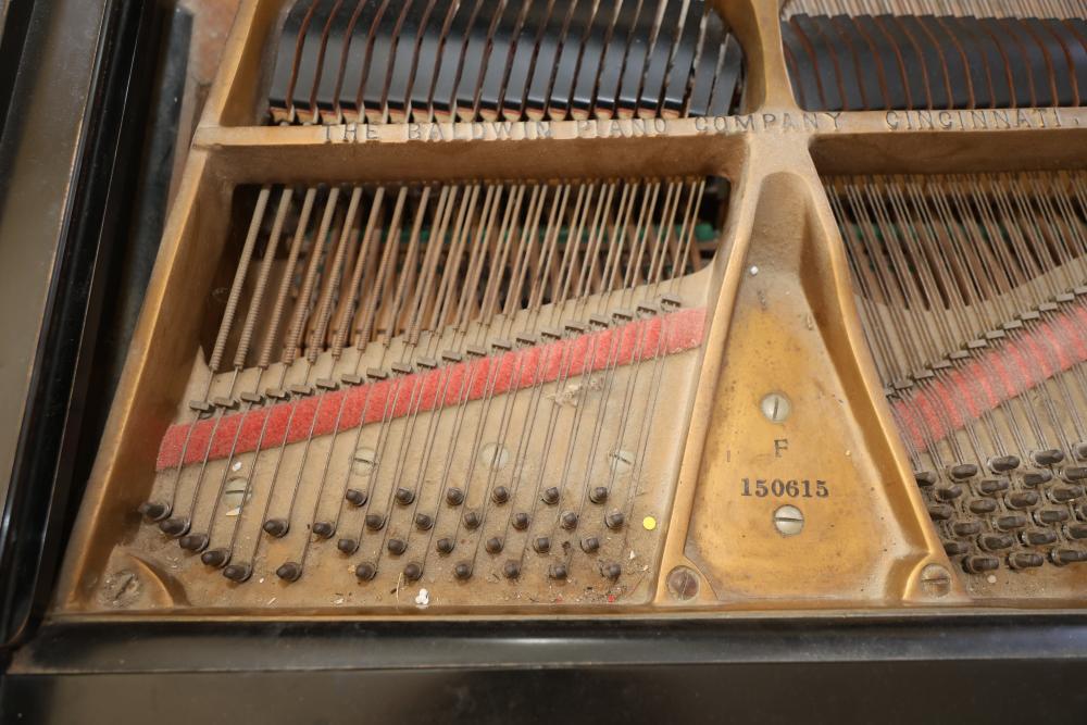 Baldwin Grand Piano with Bench. Features a polished black exterior with full keyboard, three pedals, and an included piano bench. Showcases acoustic patented construction, with serial number visible inside the piano (150615). See photos for condition. Approximately 60 " × 84 " × 40 " Buyer is responsible for all help and materials necessary for safe and proper removal. This lot is located on the first floor, no stairs. Pickup only.