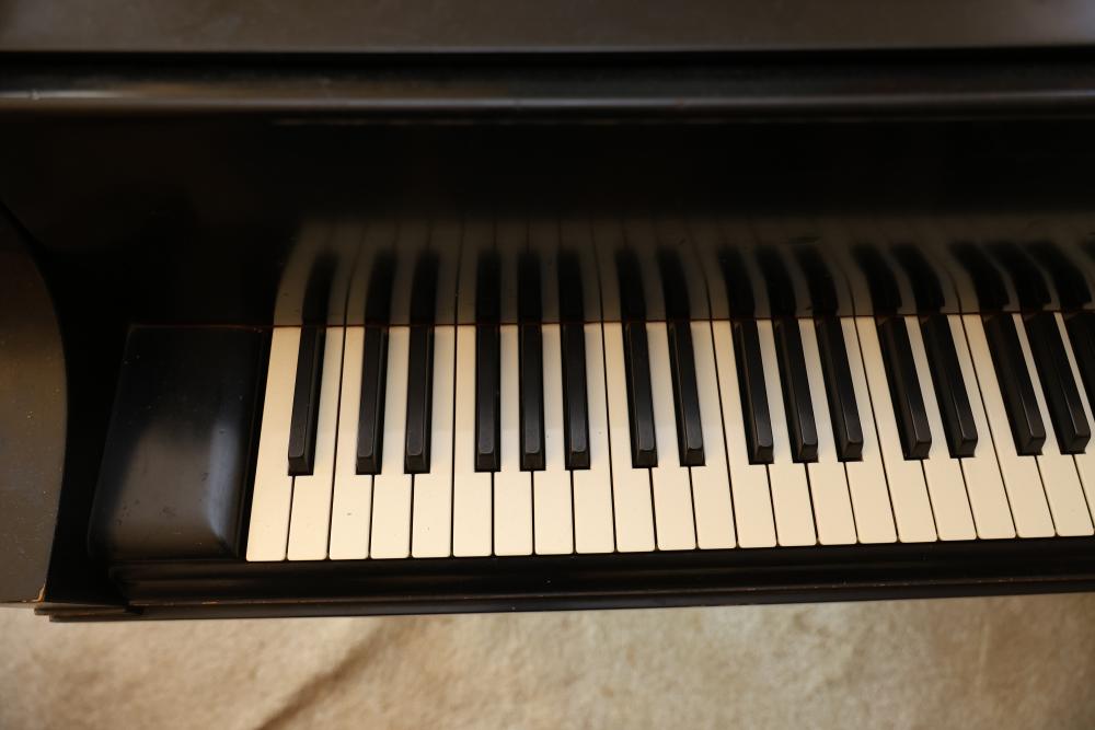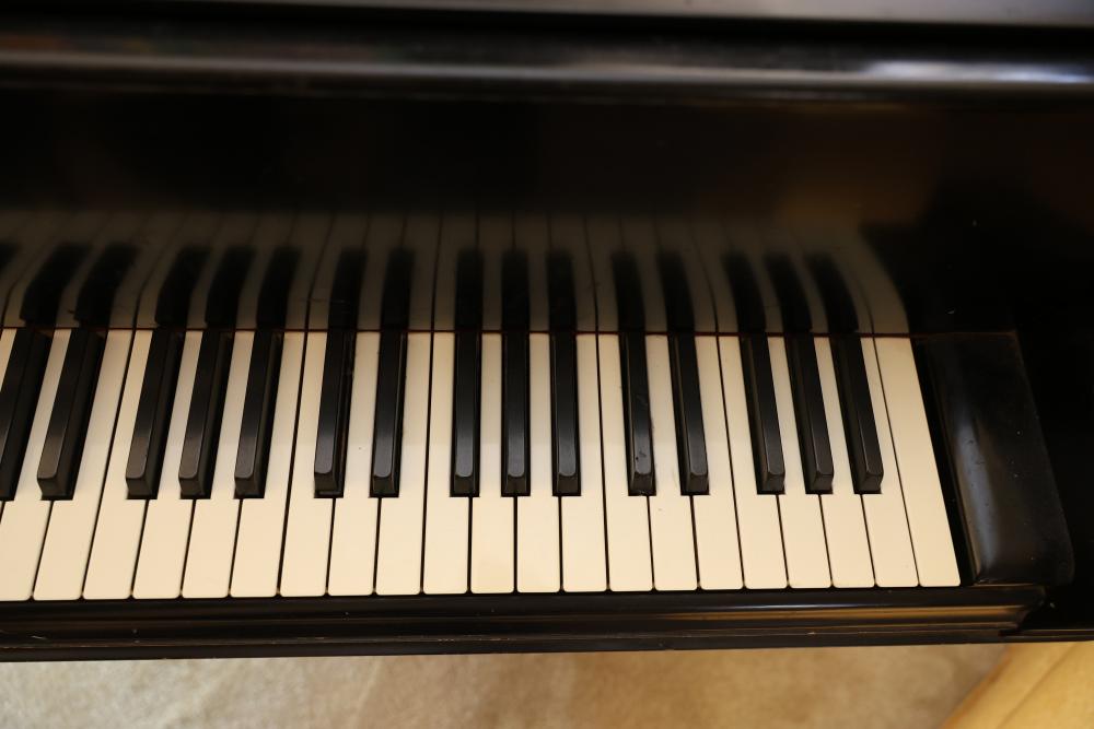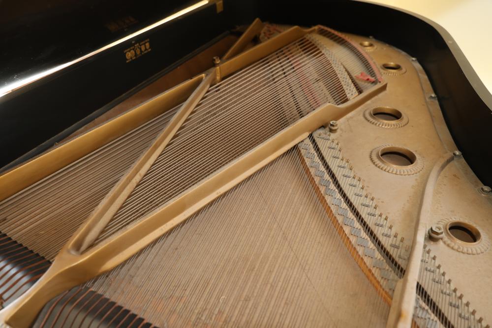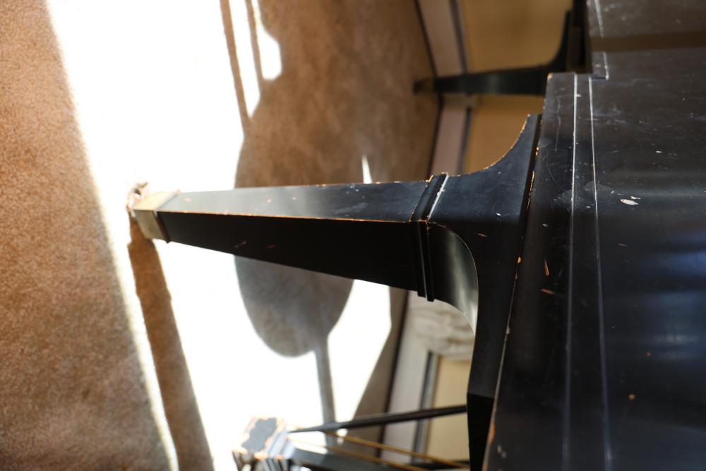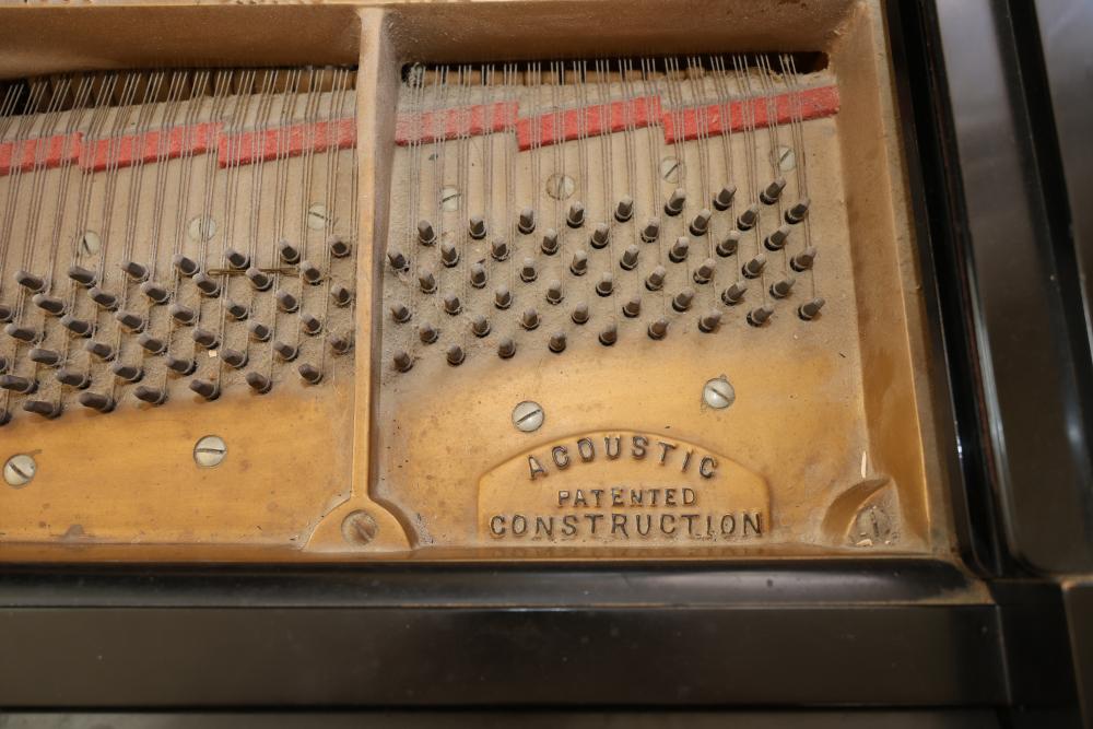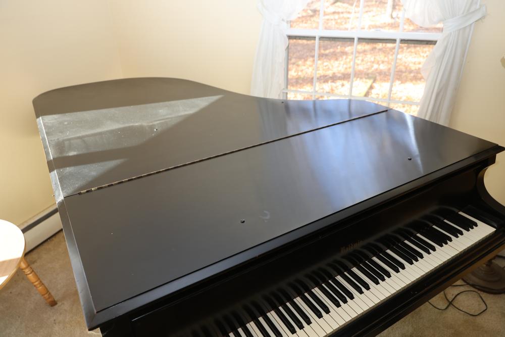 Baldwin Grand Piano with Bench. Features a polished black exterior with full keyboard, three pedals, and an included piano bench. Showcases acoustic patented construction, with serial number visible inside the piano (150615). See photos for condition. Approximately 60 " × 84 " × 40 " Buyer is responsible for all help and materials necessary for safe and proper removal. This lot is located on the first floor, no stairs. Pickup only.