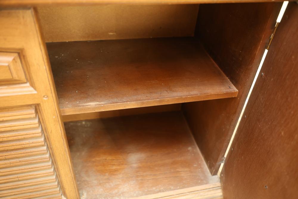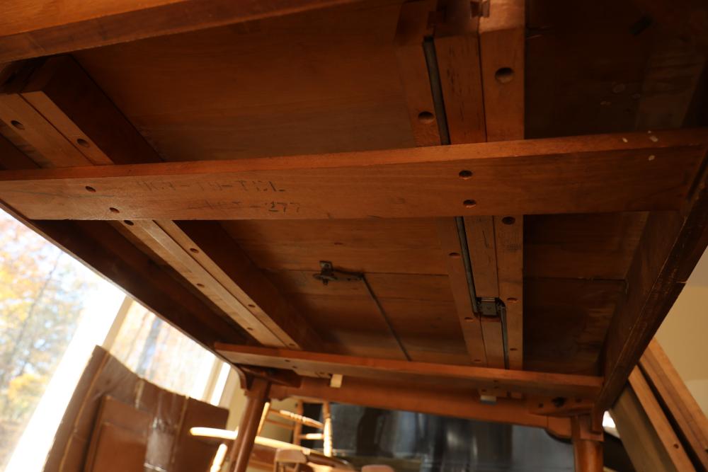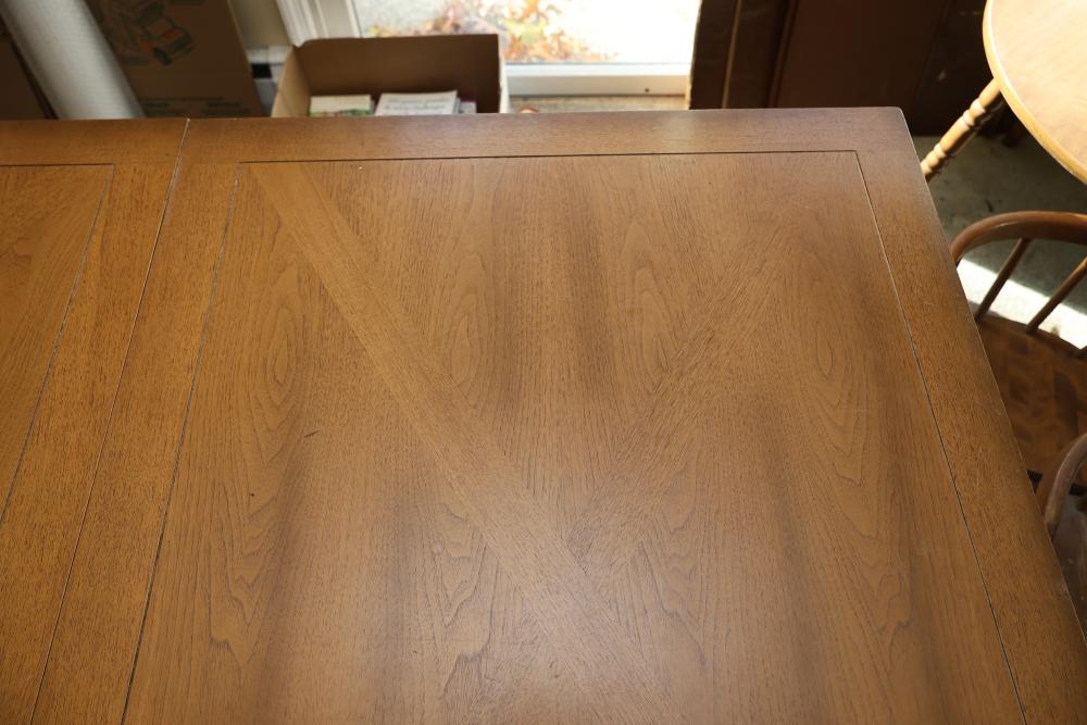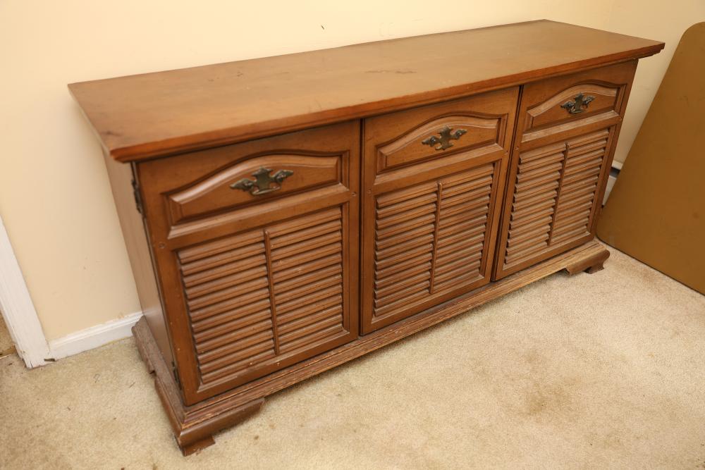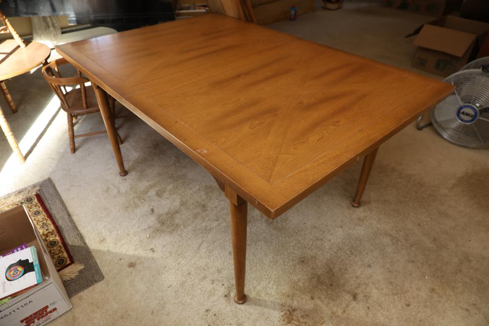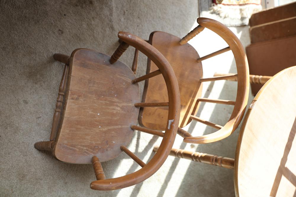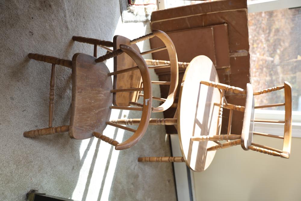 Dining Table with Insert Leaves, Round Table, Spindle-Back Chairs, and Three-Door Buffet Table. Includes an expandable rectangular dining table with three insert leaves 60in 40in x 30in, a round wooden table with spindle legs 30in x 23in, three spindle-back wooden chairs, a three-drawer wooden utility cabinet with hinged doors, and a three-door wooden buffet table with slatted front doors and interior shelving 50in x 17in x 30in. Buyer is responsible for all help and materials necessary for safe and proper removal. Buyer must take all. Pickup only.