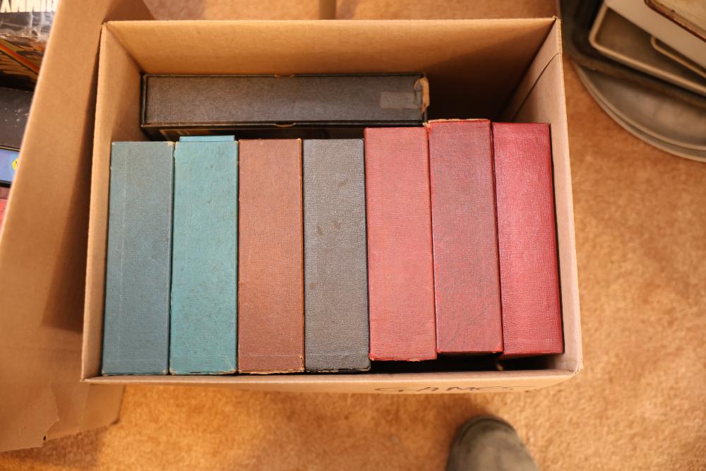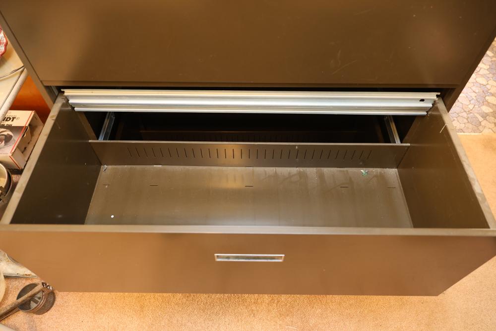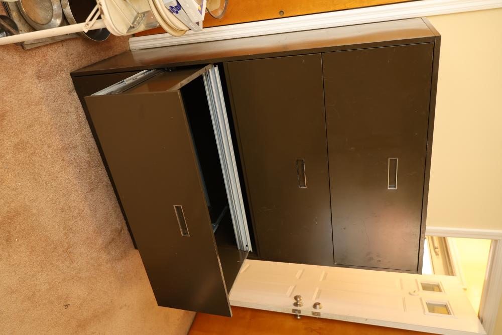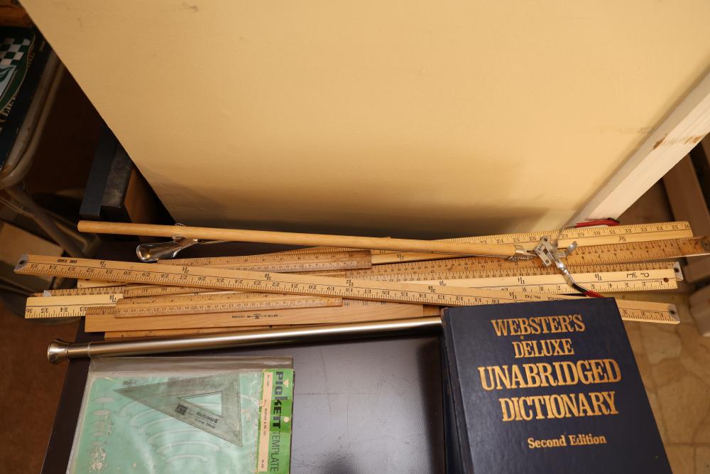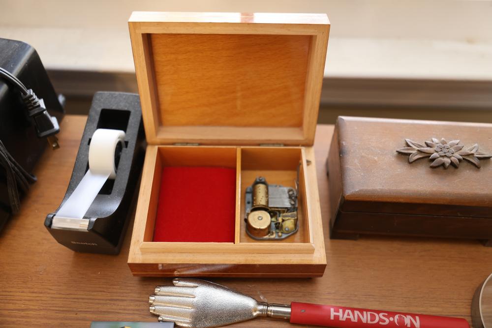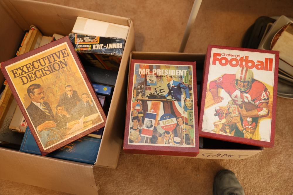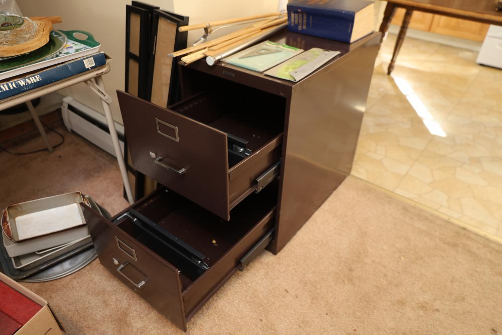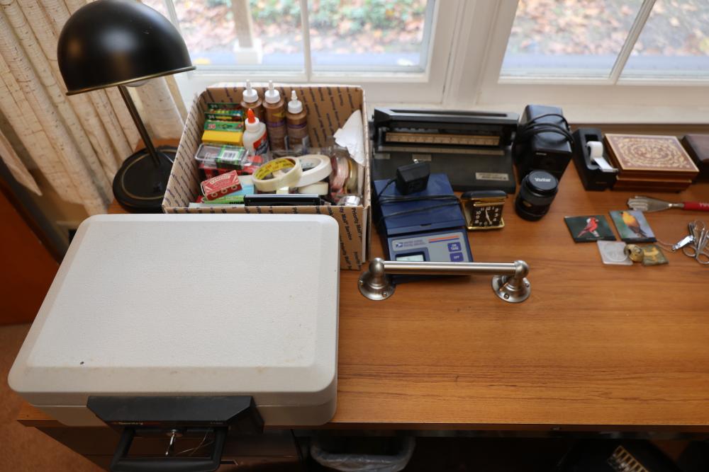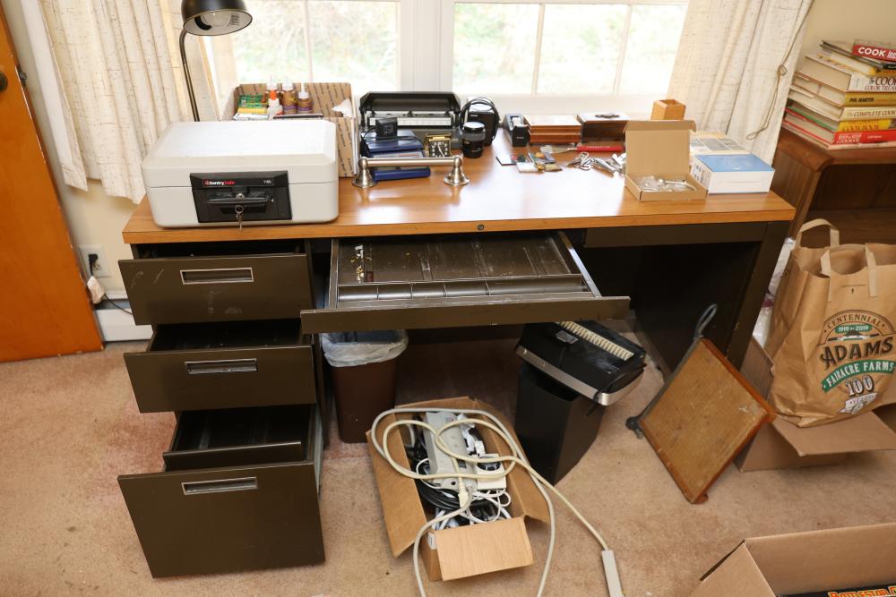 Office furniture, games, and supplies. Includes an Anderson Hickey Co. metal filing cabinet, a metal desk 60in x 24in x 28in, SentrySafe 1160 with key, Webster's Deluxe Unabridged Dictionary, tape dispensers, magnifying glass, rulers, music box, Reuge Swiss musical movement, clipboards, power strips, and various small office items. Box of vintage board games including Executive Decision and Mr. President. Buyer is responsible for all help and materials necessary for safe and proper removal. Buyer must take all. These item are located on the first floor. Pickup only.