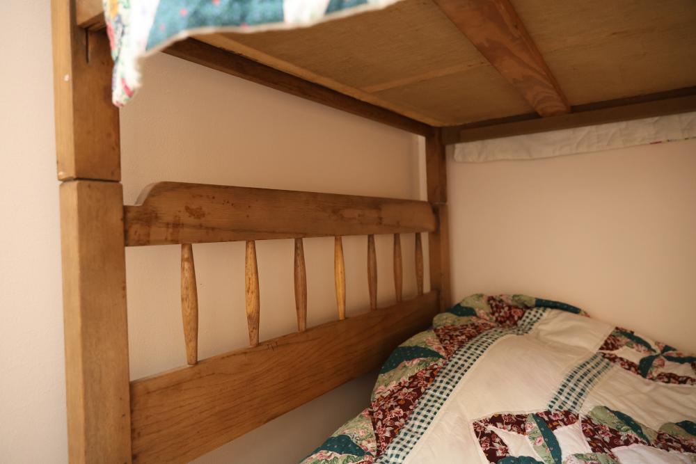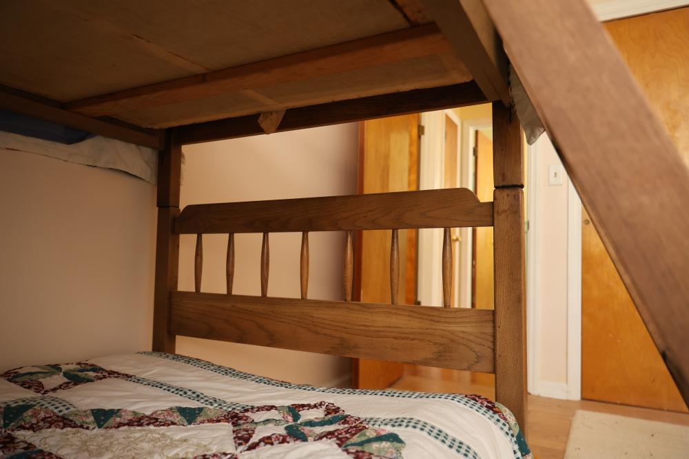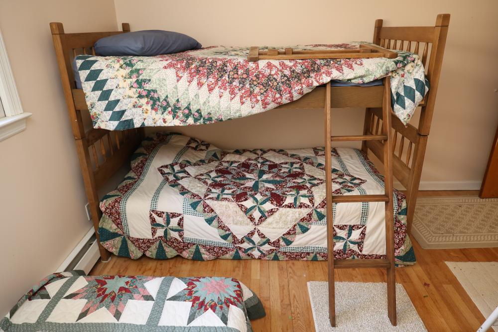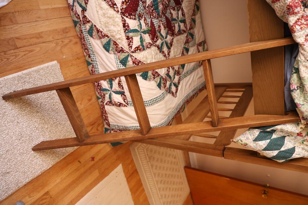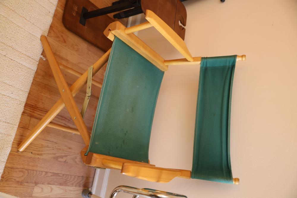 Wooden bunk bed frame with ladder and quilts, green fabric folding director's chair with a wooden frame, white padded stool with chrome accents, Bogen 3046 tripod, wooden side table stamped Miro Modern Home Decor, and wooden chest. Buyer is responsible for all help and materials necessary for safe and proper removal. Bunk bed measures 41in x 79in x 59in. Buyer is responsible for all help and materials necessary for safe and proper removal. Does not include items from other lots. These items are located on the second floor. Pickup only.
