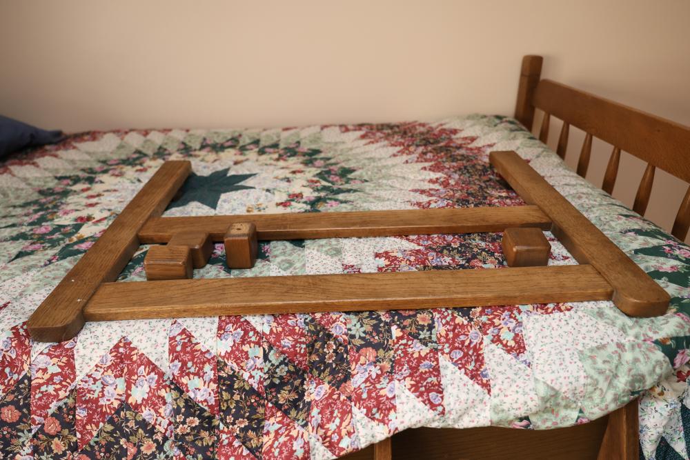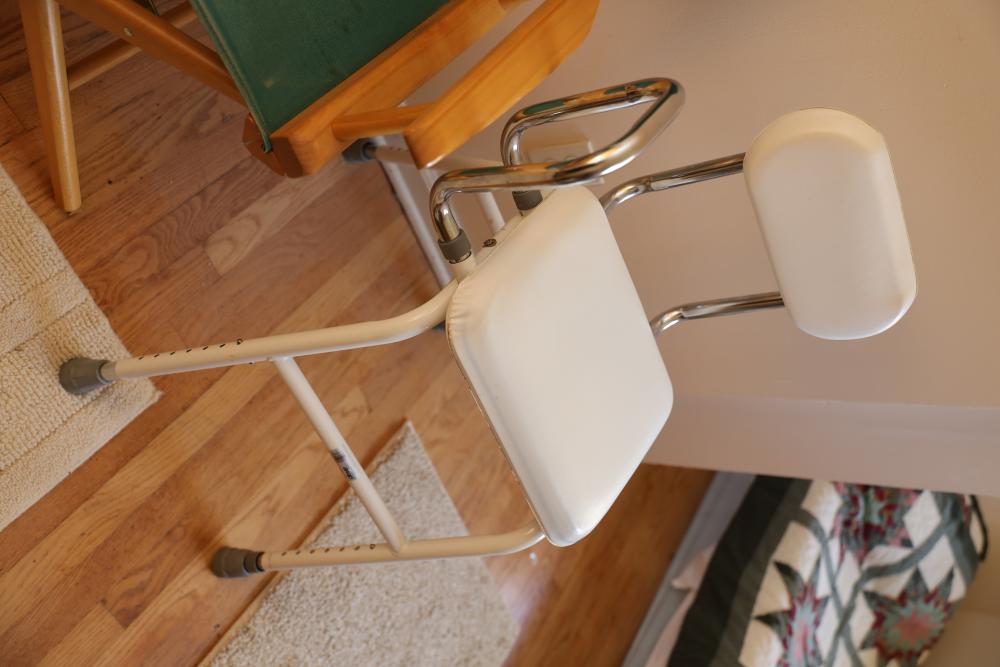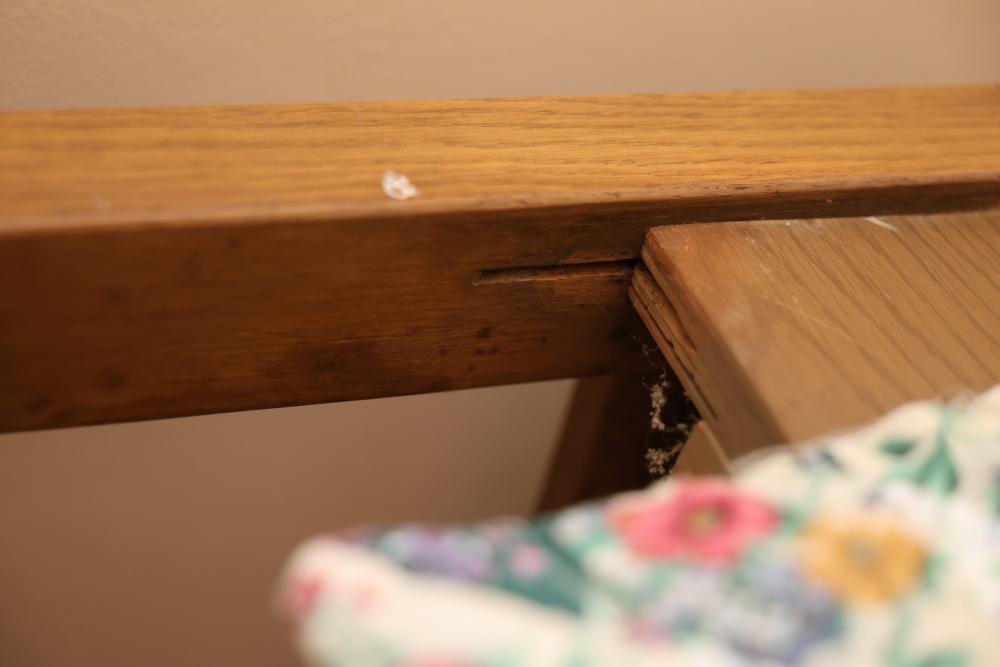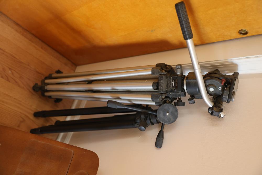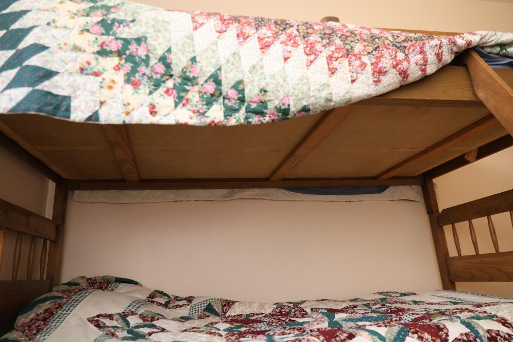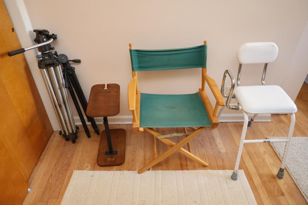 Wooden bunk bed frame with ladder and quilts, green fabric folding director's chair with a wooden frame, white padded stool with chrome accents, Bogen 3046 tripod, wooden side table stamped Miro Modern Home Decor, and wooden chest. Buyer is responsible for all help and materials necessary for safe and proper removal. Bunk bed measures 41in x 79in x 59in. Buyer is responsible for all help and materials necessary for safe and proper removal. Does not include items from other lots. These items are located on the second floor. Pickup only.