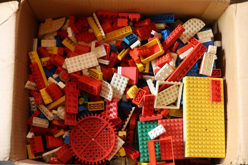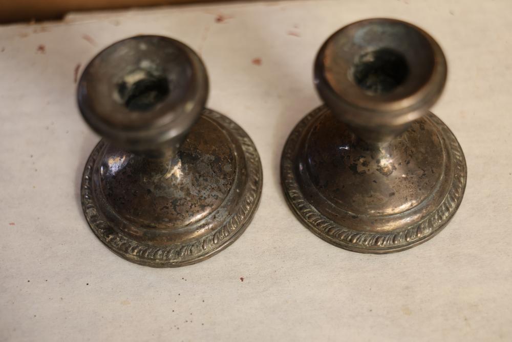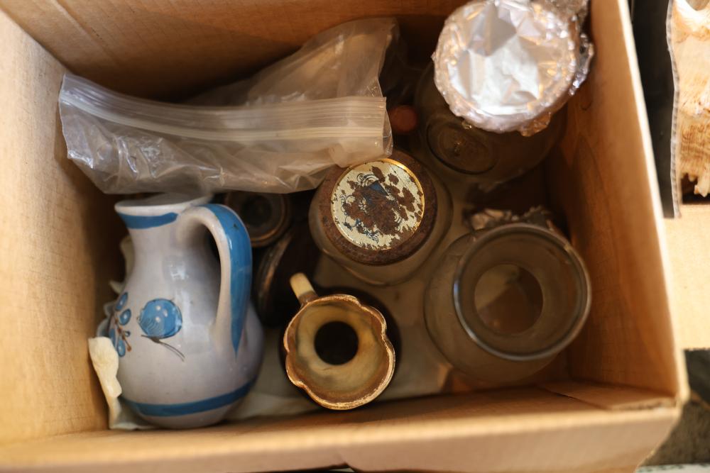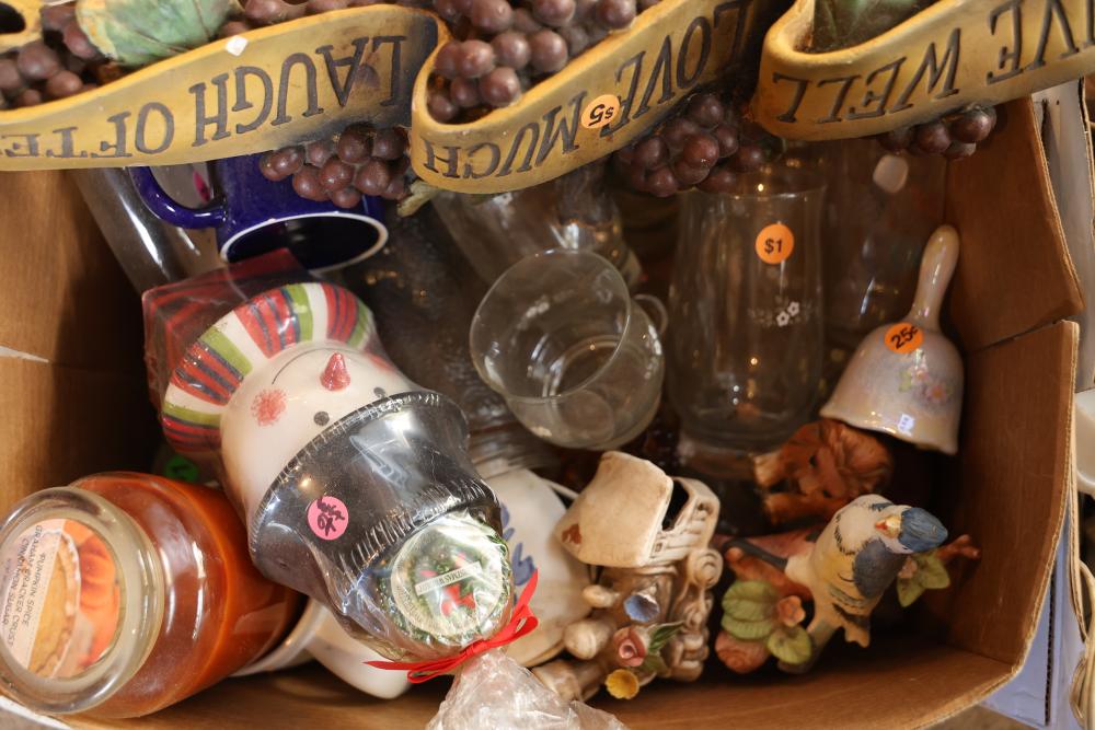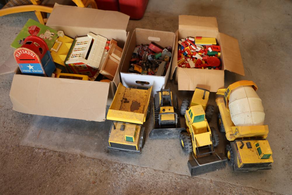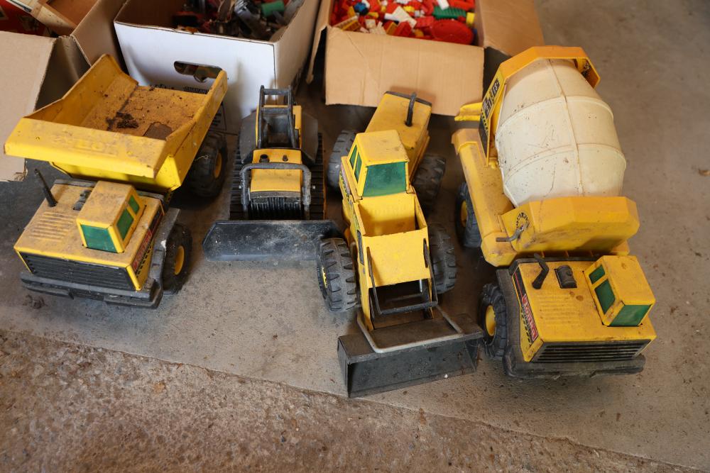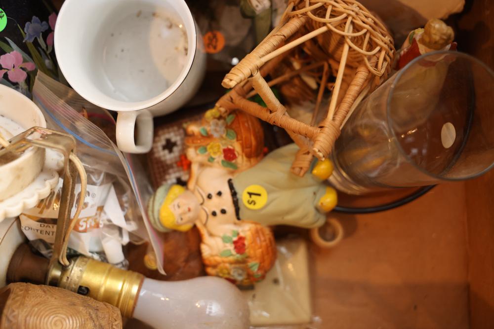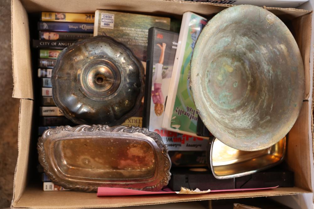 Toys, DVDs, Kitchenware, Decor, and Metal Items. Includes a collection of toy construction vehicles, loose building bricks, various small die-cast vehicles, DVDs and VHS tapes, multiple ceramic and glassware items, seashell decor, a pair of silver candlesticks marked on the bottom, metal utensils, festive home decor, and a boxed Yankee Stadium puzzle. Buyer is responsible for all help and materials necessary for safe and proper removal. Does not include other lots. Buyer must take all. Pickup only.
