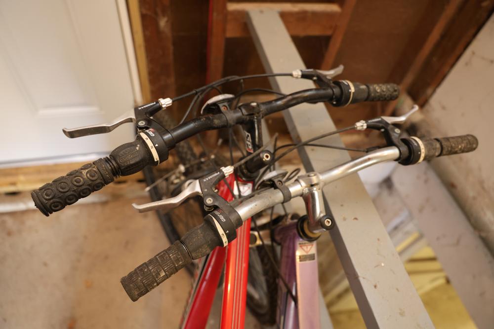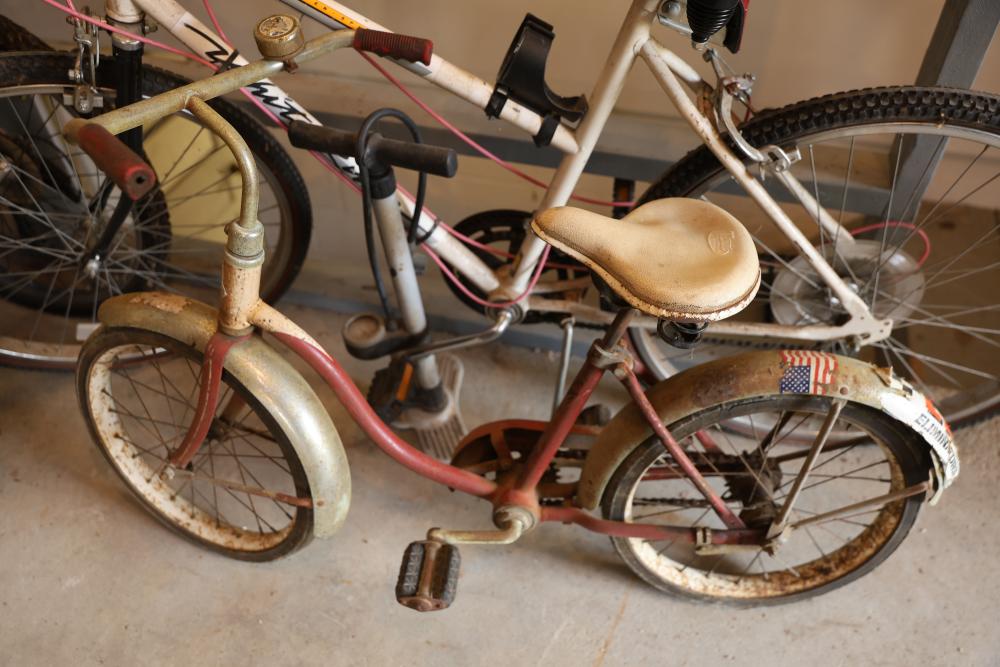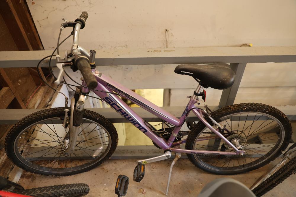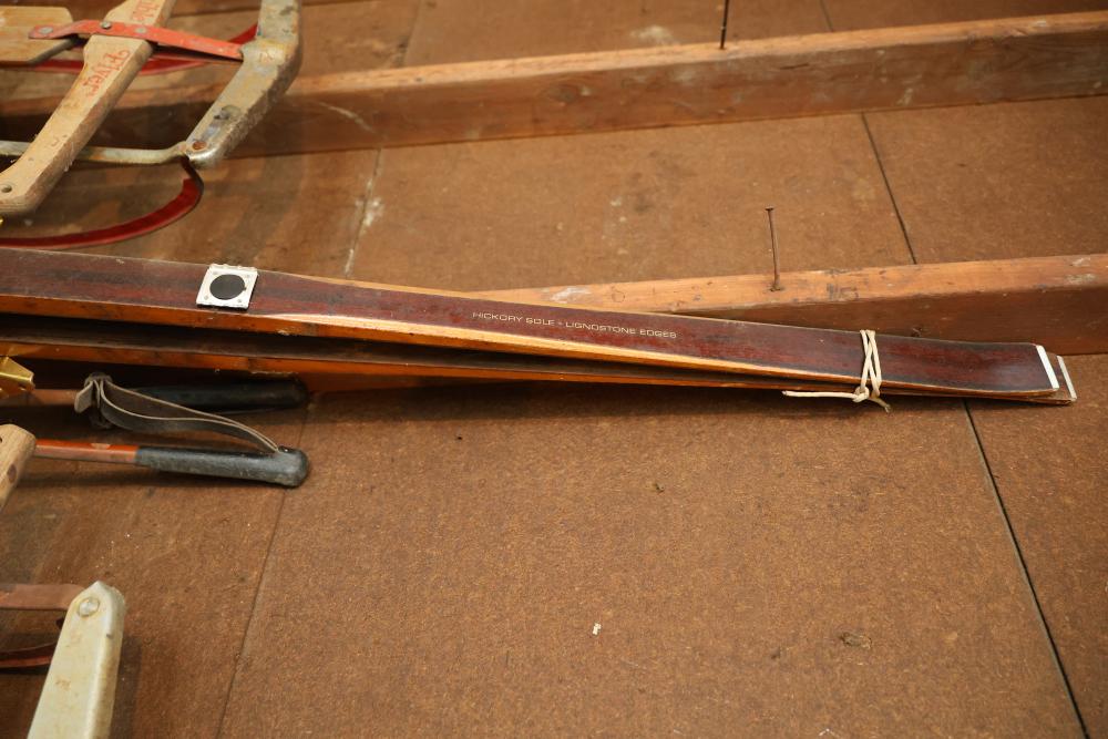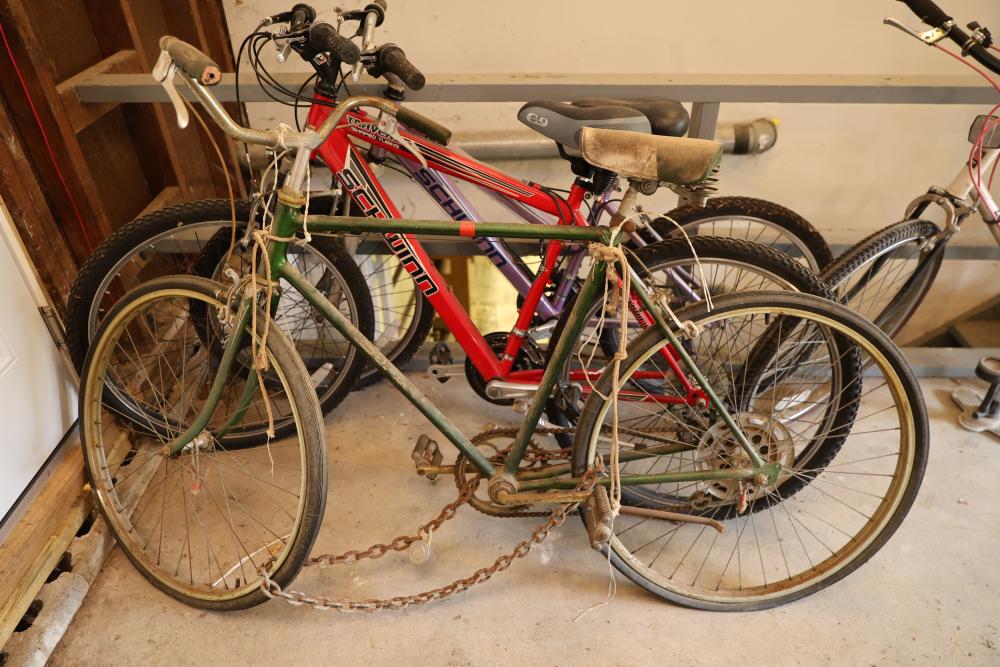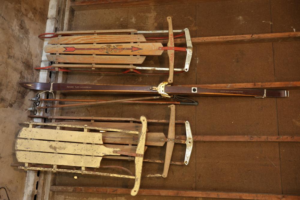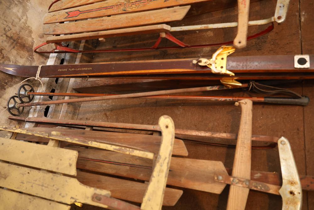 Bicycles, sleds, and Nordic skis. Includes multiple bicycles featuring Schwinn, Huffy, and additional brands, ranging from adult to child sizes with varied frames and handlebars. Includes Flexible Flyer and other vintage-style sleds in wooden designs and complementing Nordic skis marked Åsnes Tur-Langrenn with attached poles. Buyer is responsible for all help and materials necessary for removal. Buyer must take all. Pickup only.
