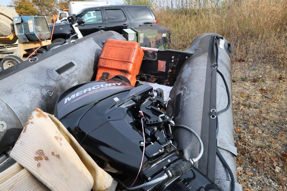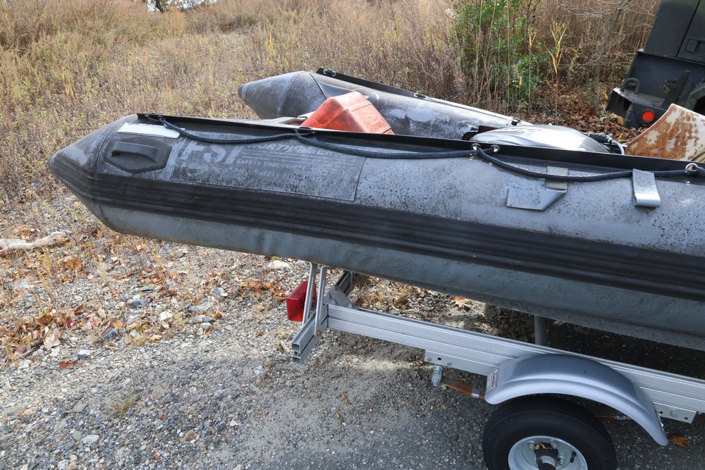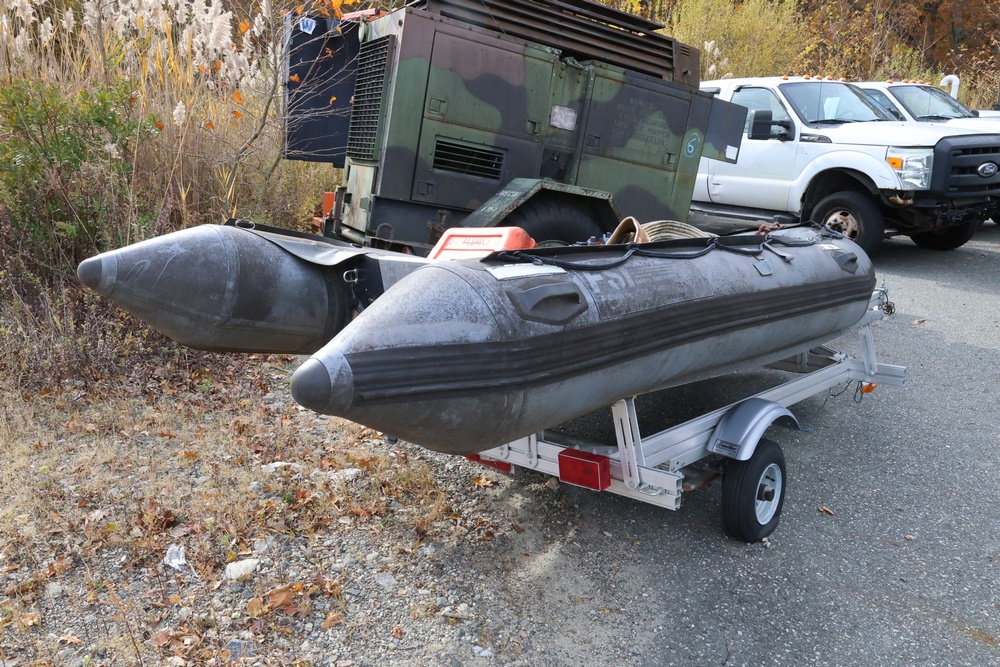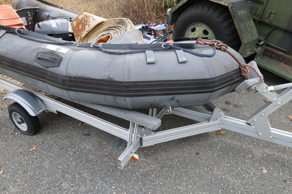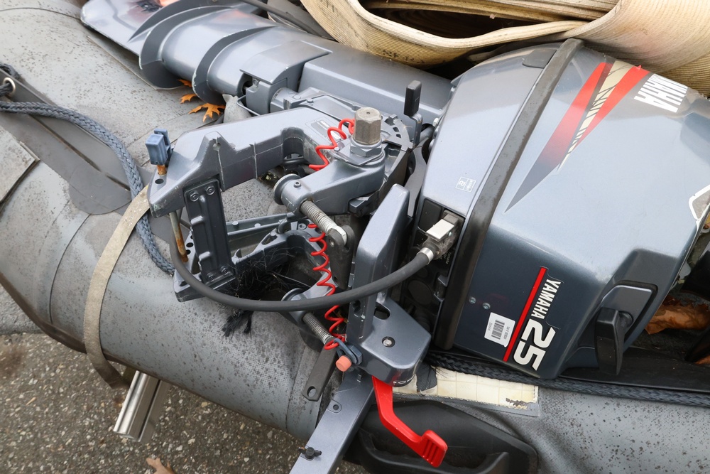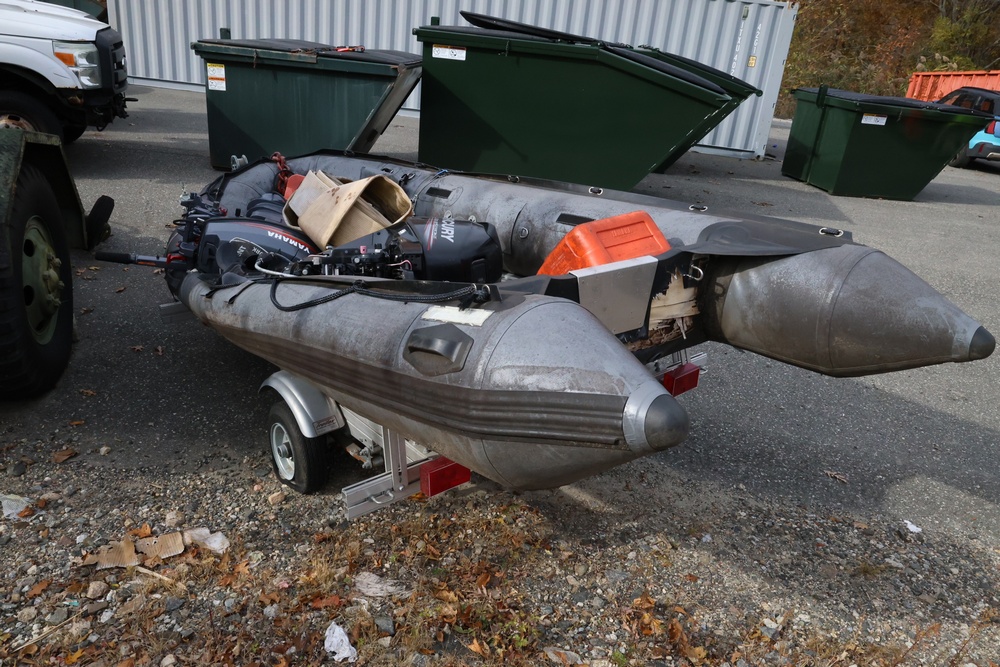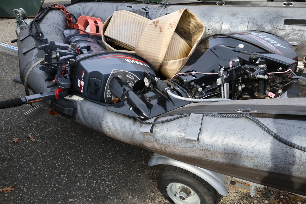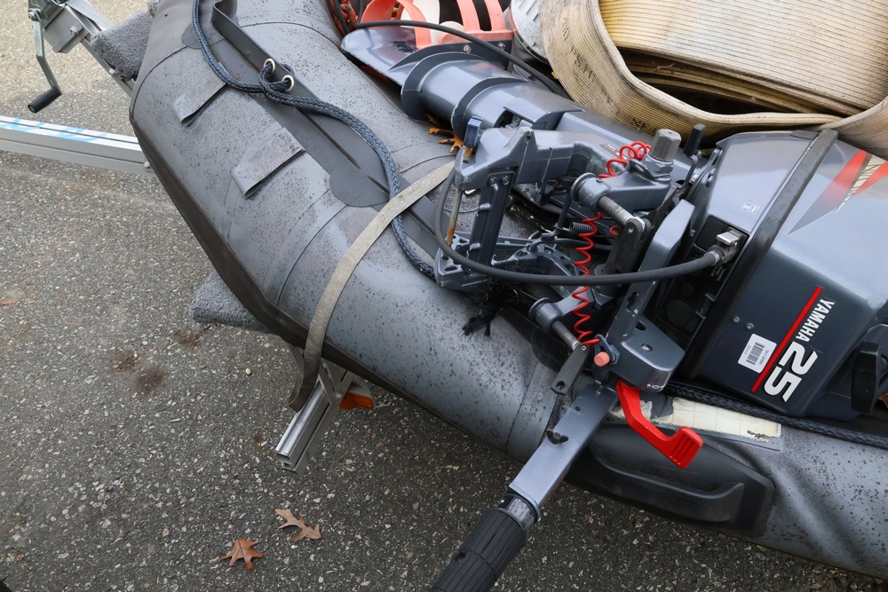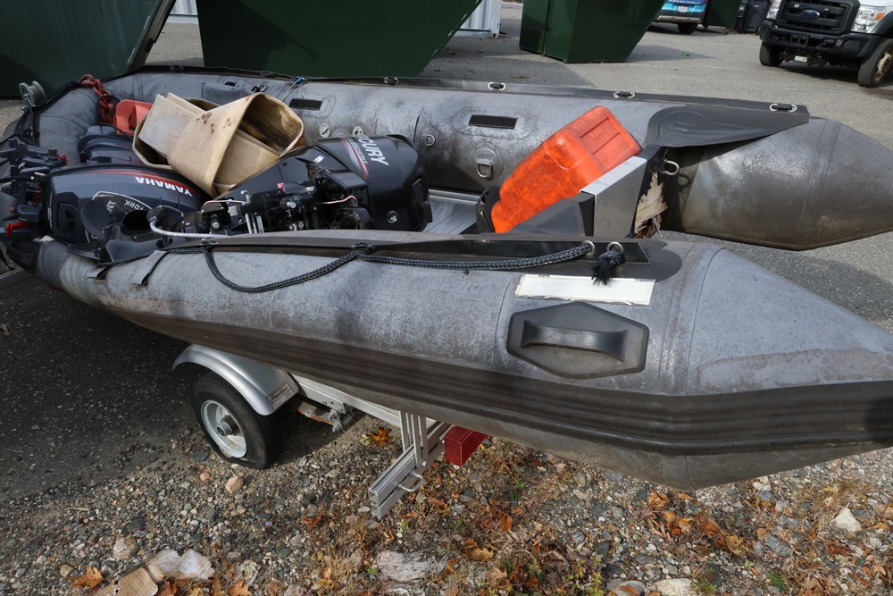 FSI Inflatable Flat Bottom Boat; model FSI-F-YRR385D FSI00006F313. Trailex Aluminum Inflatable Boat Trailer; model UT-850MIIIWT. Mercury Outboard Motor; model 1A25203EK Fourstroke 0R587513. Yamaha Boat Motor; model 25MLHKZ 6L2KL 0100452. Seller reports: motors were both working when removed from service.