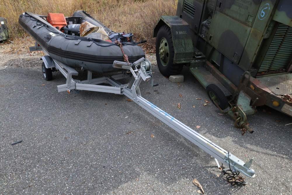 FSI Inflatable Flat Bottom Boat; model FSI-F-YRR385D FSI00006F313. Trailex Aluminum Inflatable Boat Trailer; model UT-850MIIIWT. Mercury Outboard Motor; model 1A25203EK Fourstroke 0R587513. Yamaha Boat Motor; model 25MLHKZ 6L2KL 0100452. Seller reports: motors were both working when removed from service.