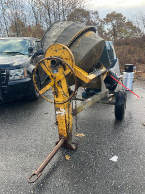 Stone Construction Equipment model 105CM tow behind gas powered concrete mixer with a Honda GX240 engine. Unknown if operational.