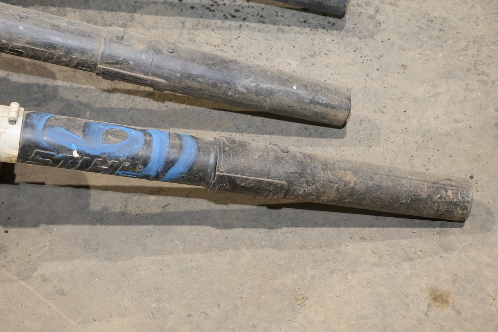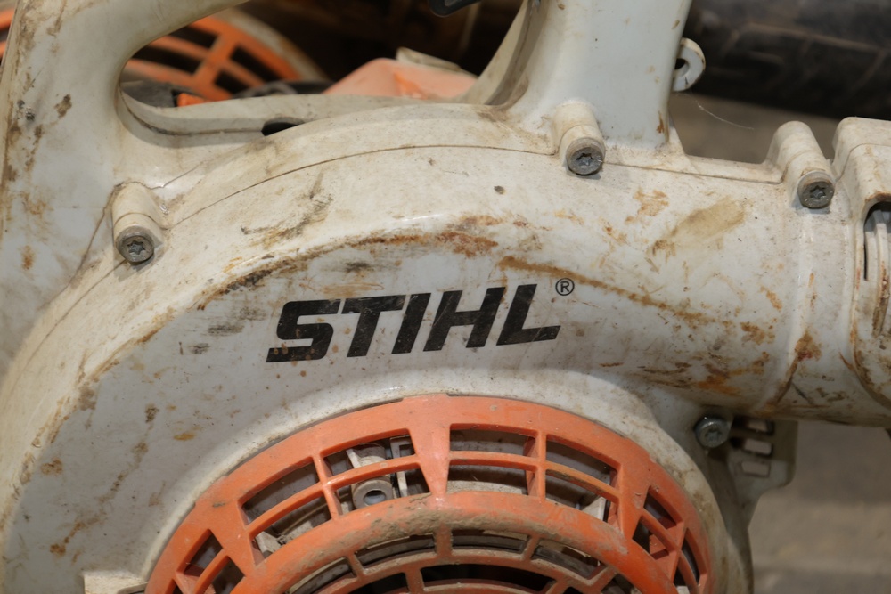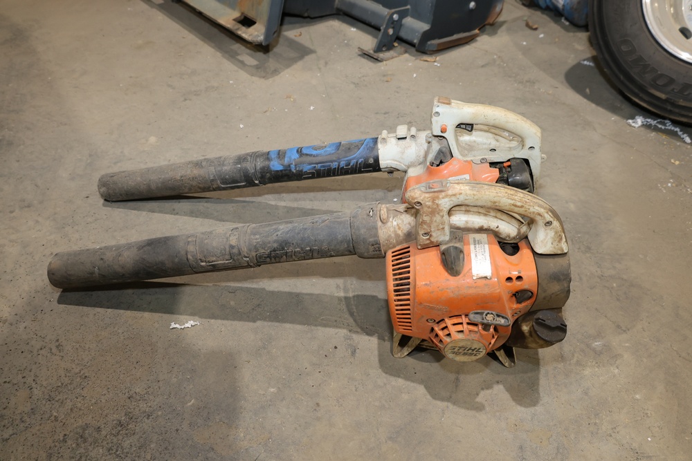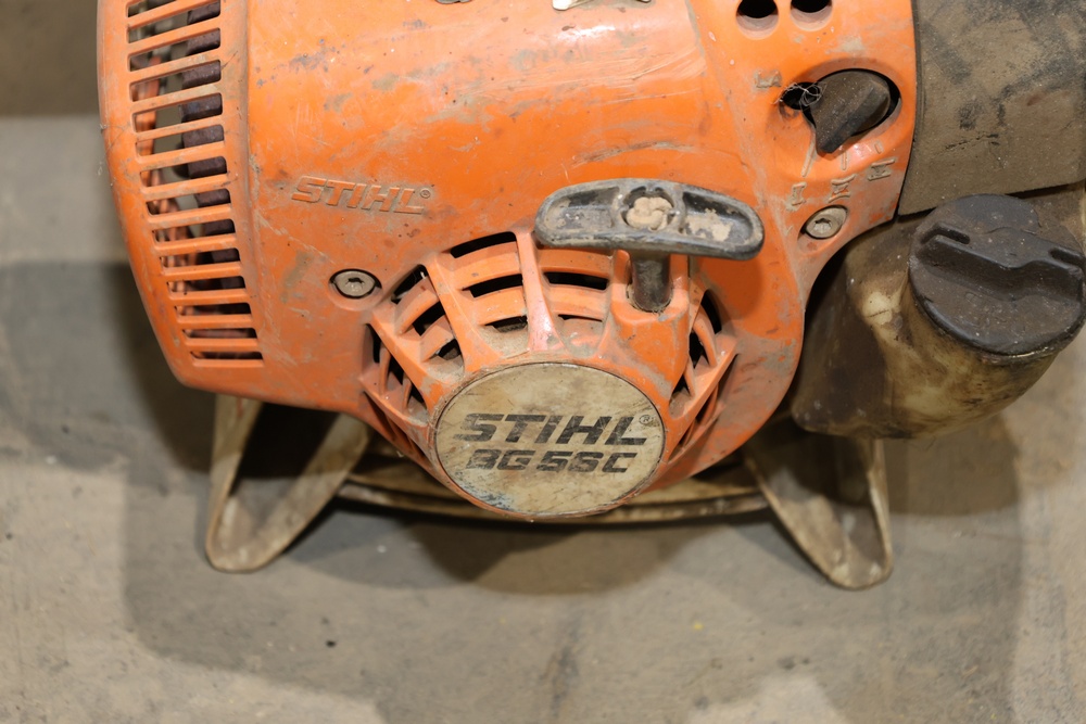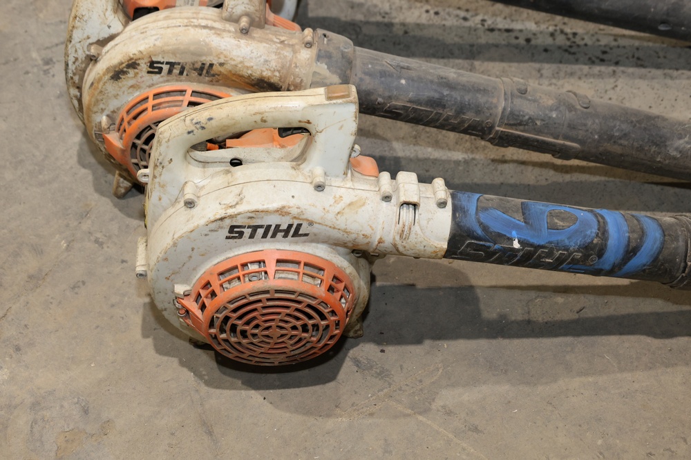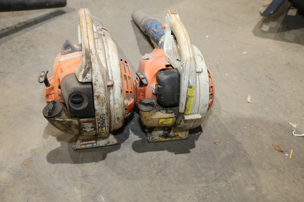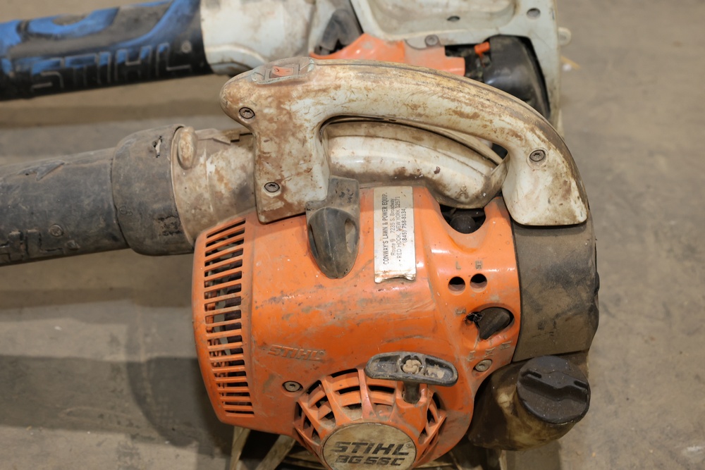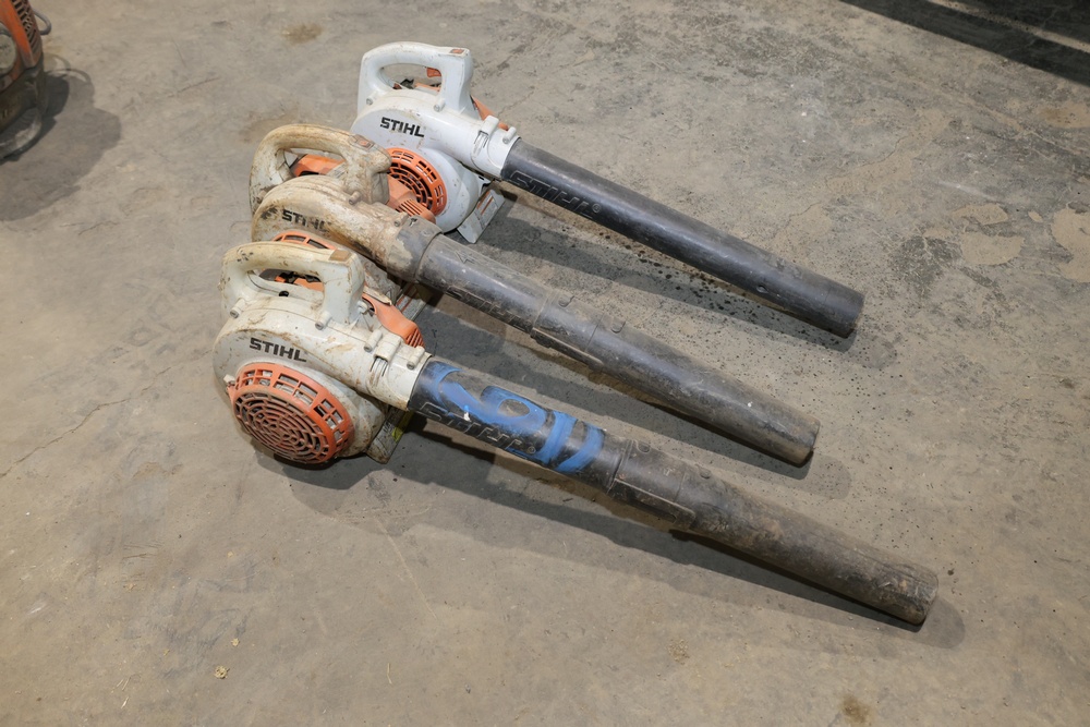 Three Stihl handheld leaf blowers including BG55, BG56C (appears to need parts/repair), and BG50. Seller reports ran when stored.