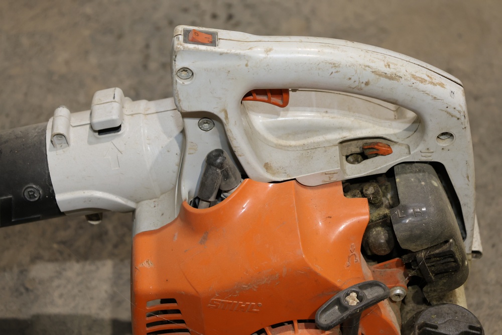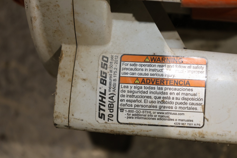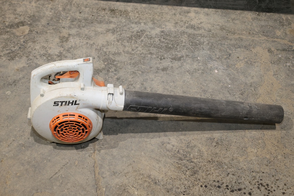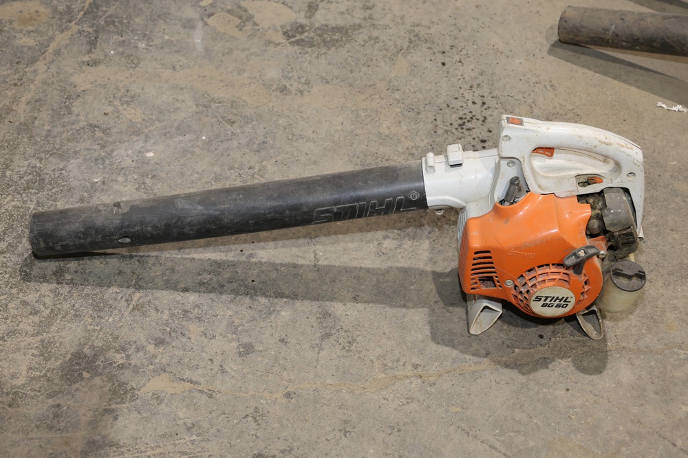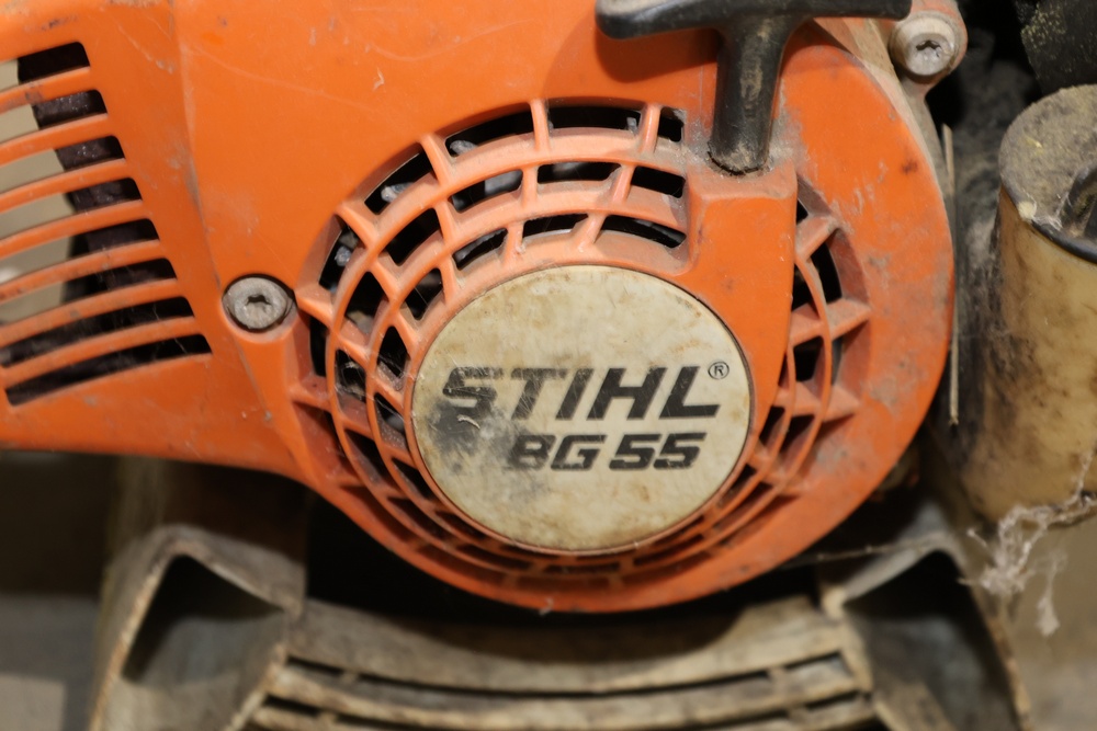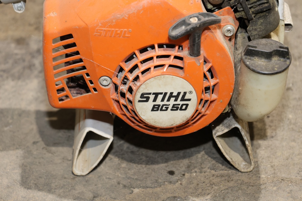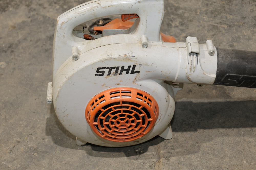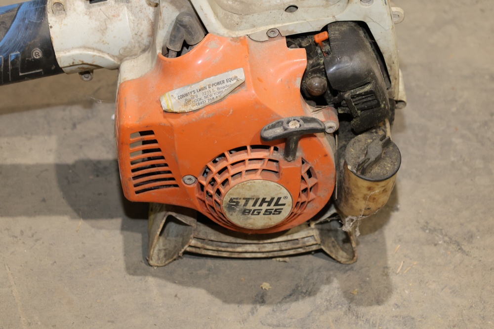 Three Stihl handheld leaf blowers including BG55, BG56C (appears to need parts/repair), and BG50. Seller reports ran when stored.