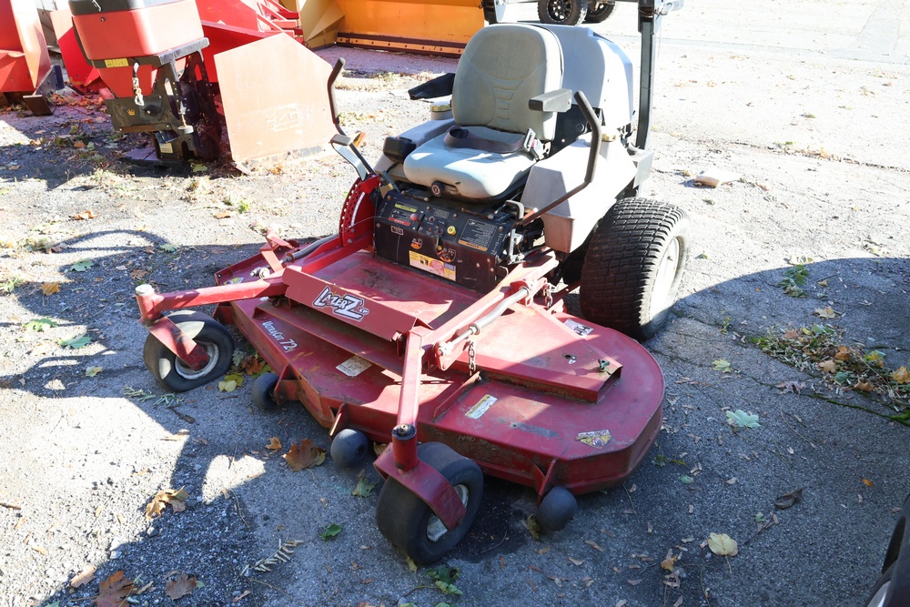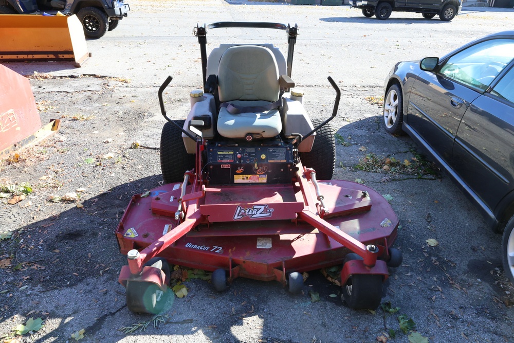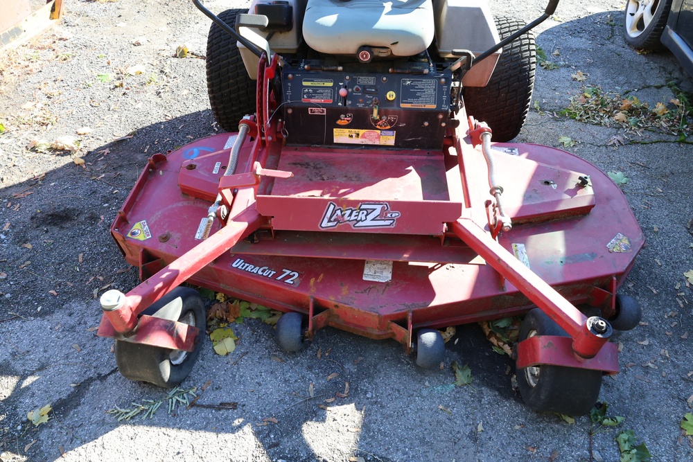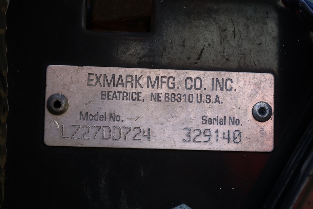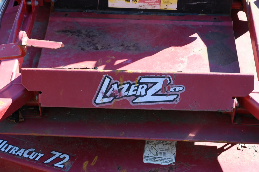 Exmark Lazer Z XP commercial mower manufactured by Exmark Mfg. Co., Inc., Beatrice, Nebraska, USA. The model number is LZ27DD724 and the serial number is 329140. The mower is equipped with an UltraCut 72-inch deck and shows 3,554.9 hours on the meter. Seller reports: ran when parked, doesn't start.