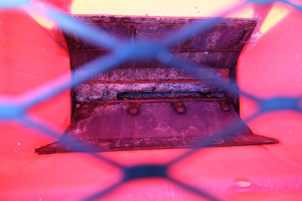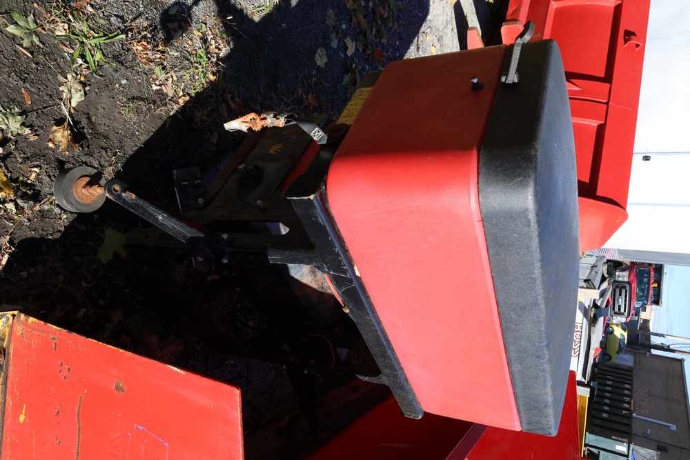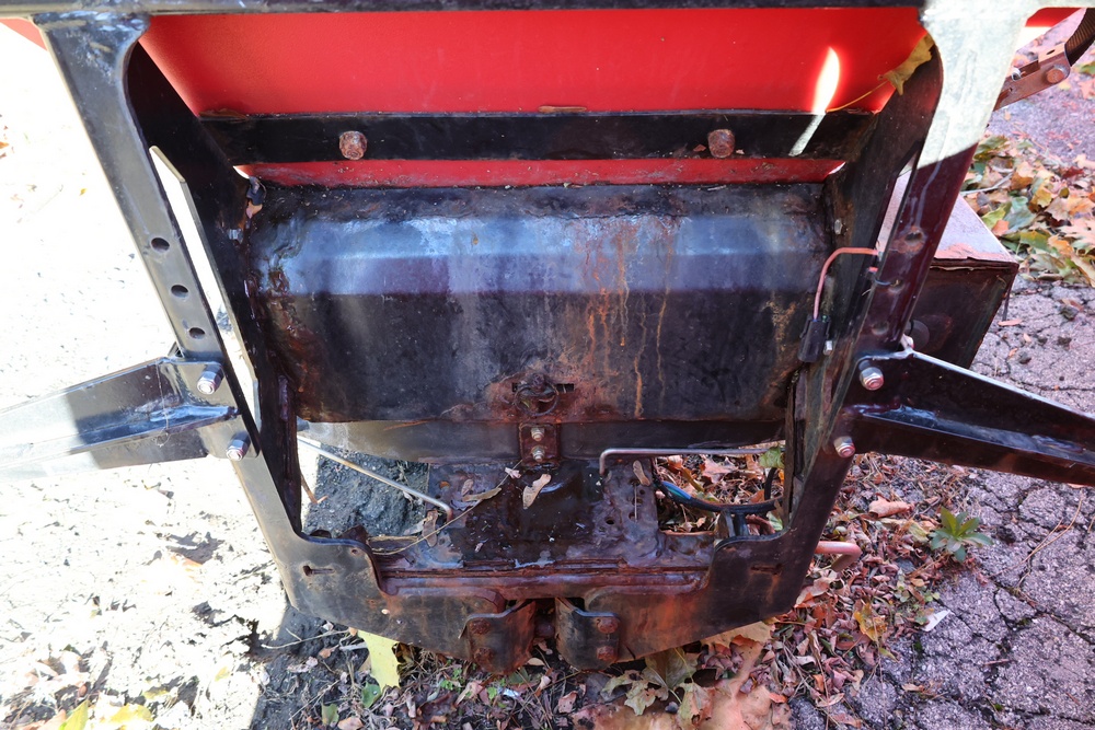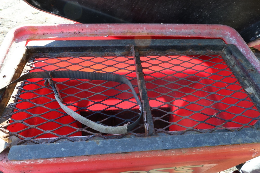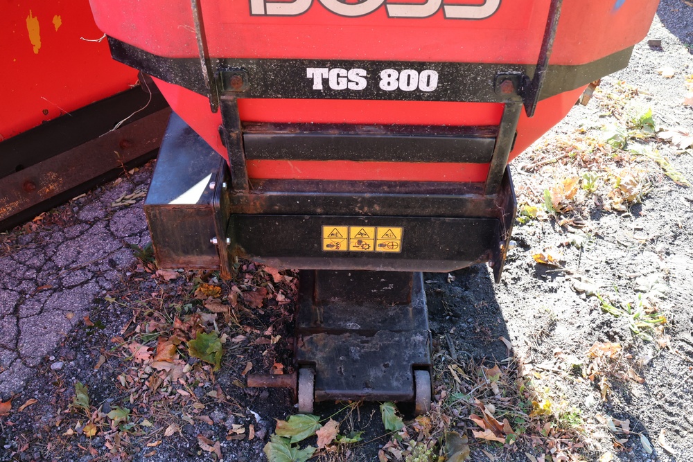 Boss TGS 800 tailgate spreader designed for mounting on trucks or utility vehicles. The unit features a red poly hopper and steel frame. Seller reports: in working condition.