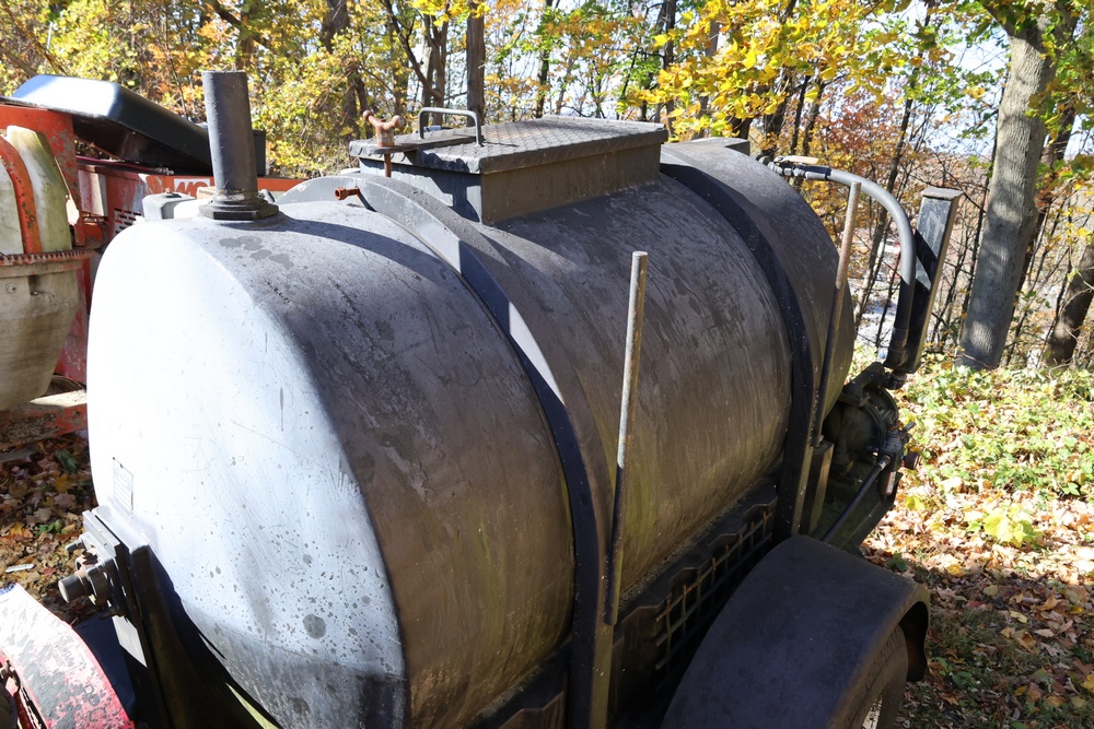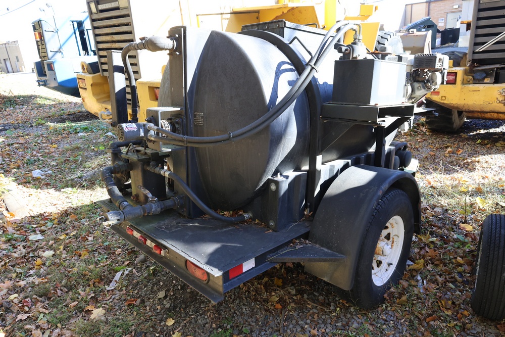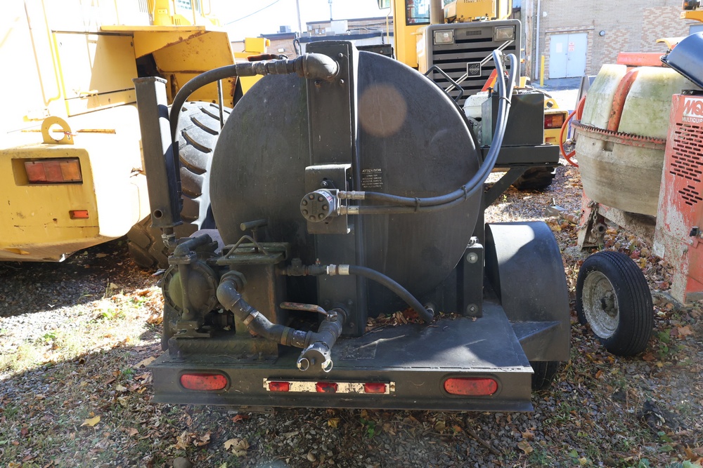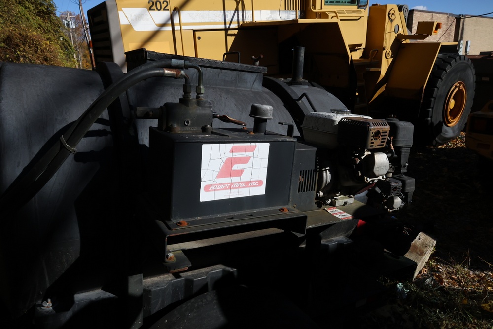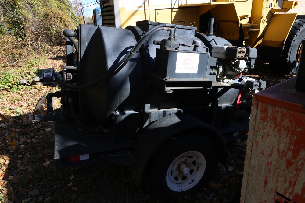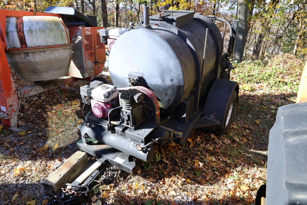 Equipment MFG Inc tow behind seal coat tank with Honda GX160 engine. Unknown if operational.