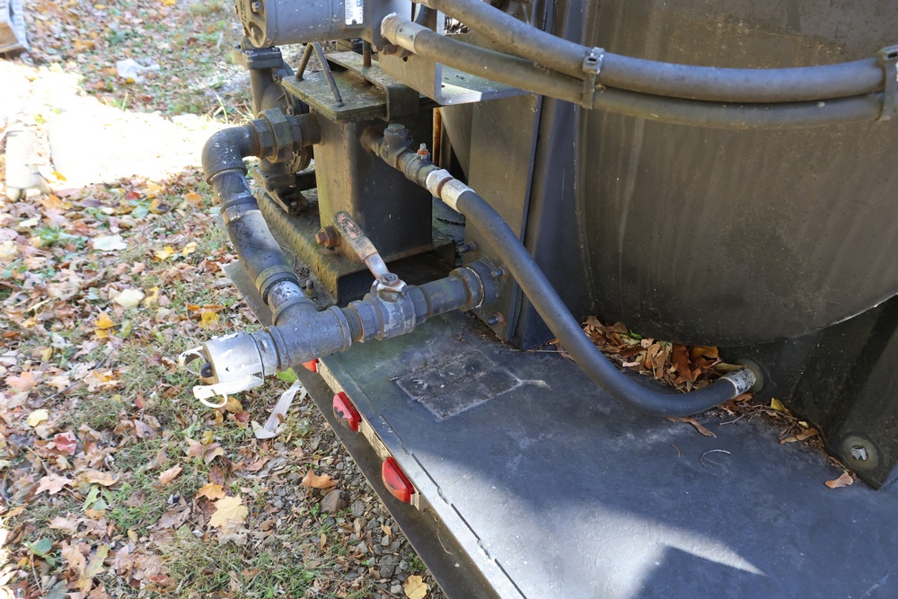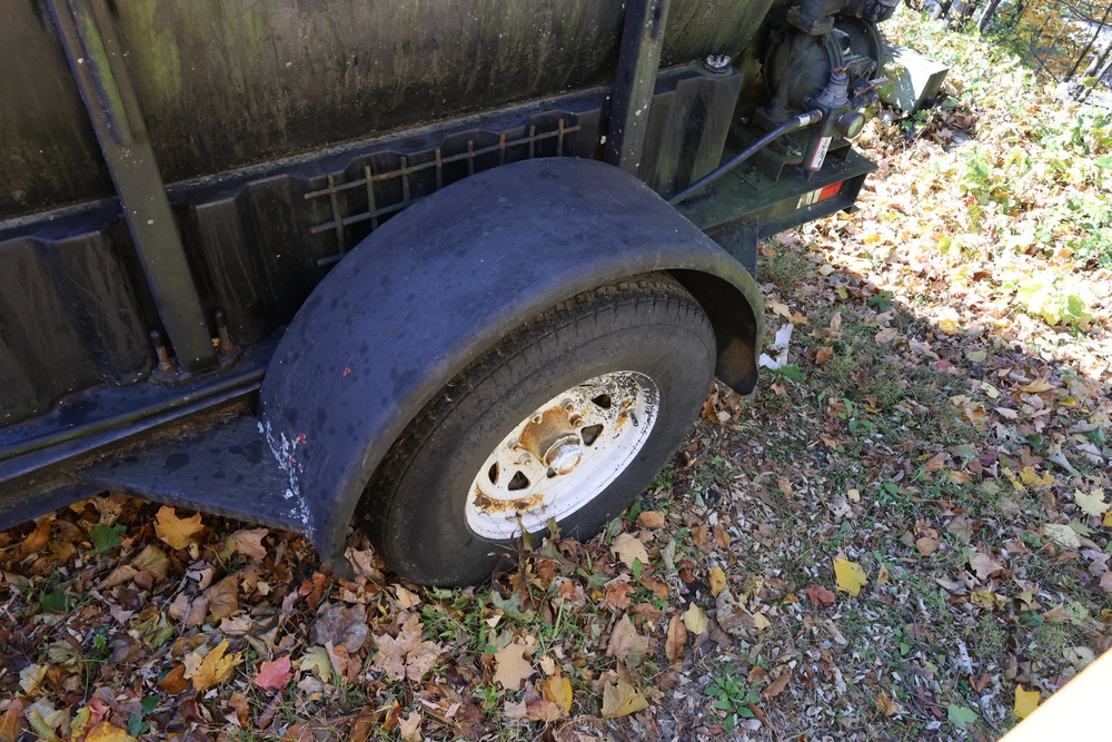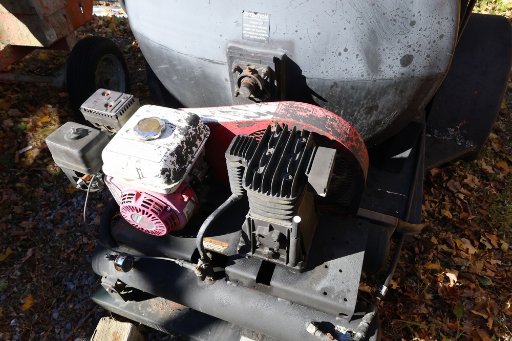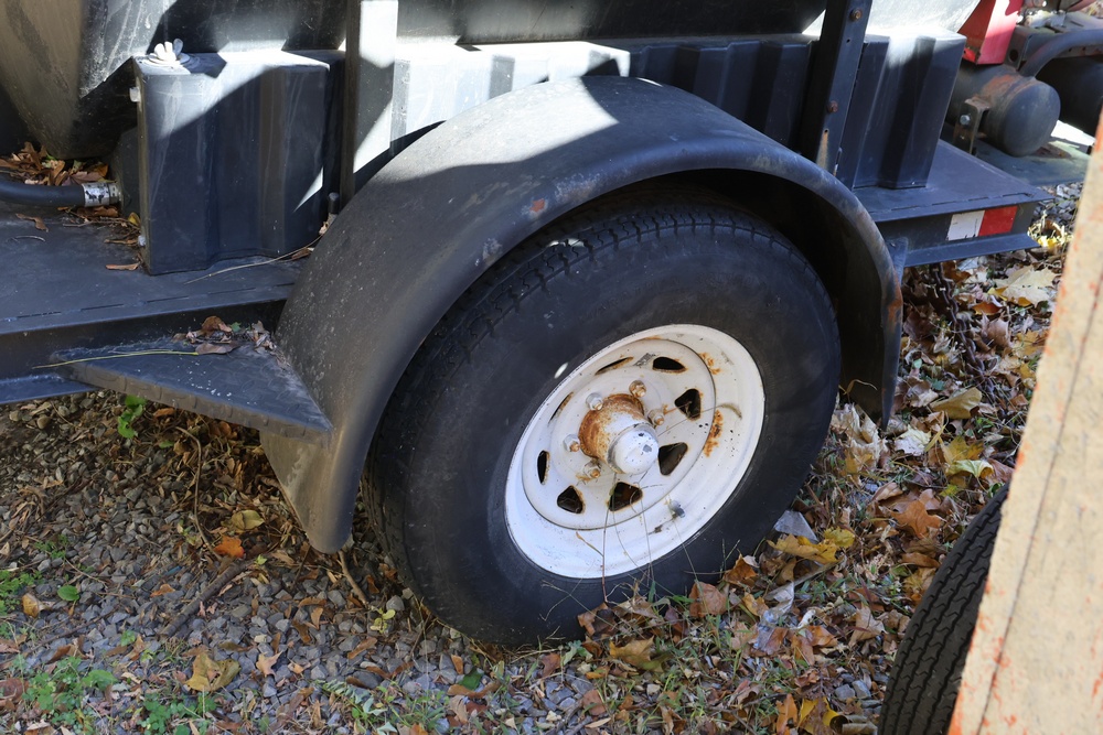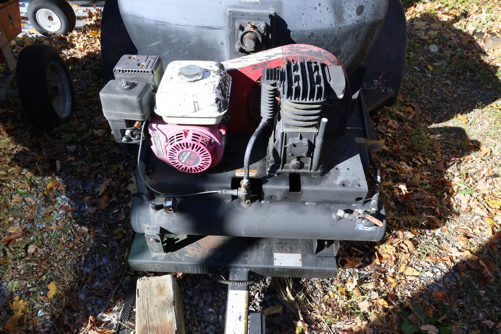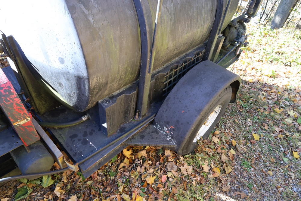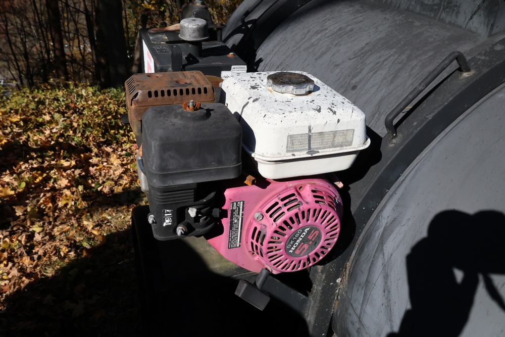 Equipment MFG Inc tow behind seal coat tank with Honda GX160 engine. Unknown if operational.