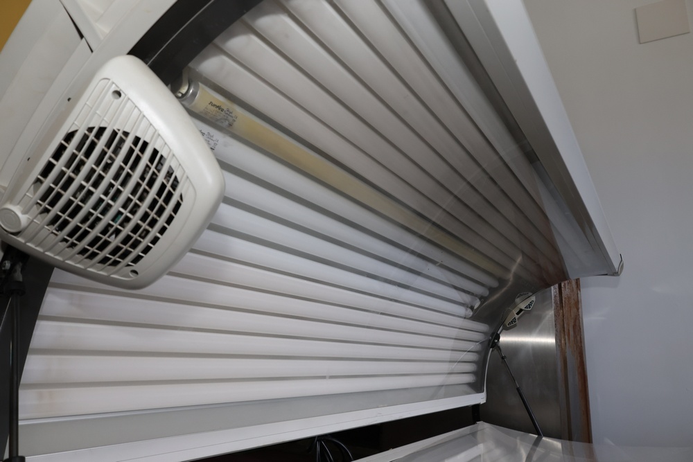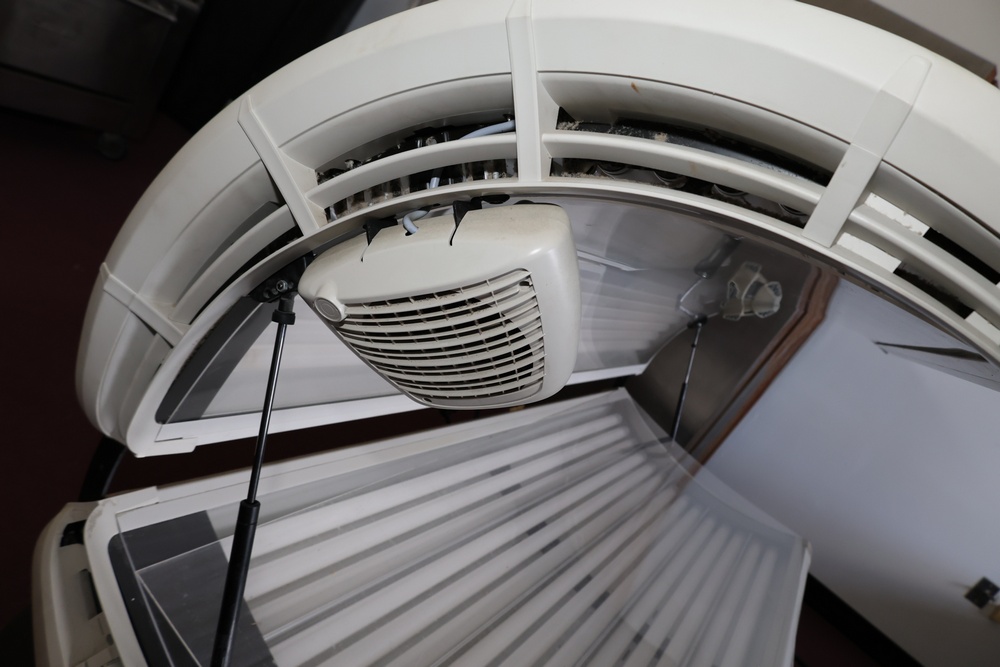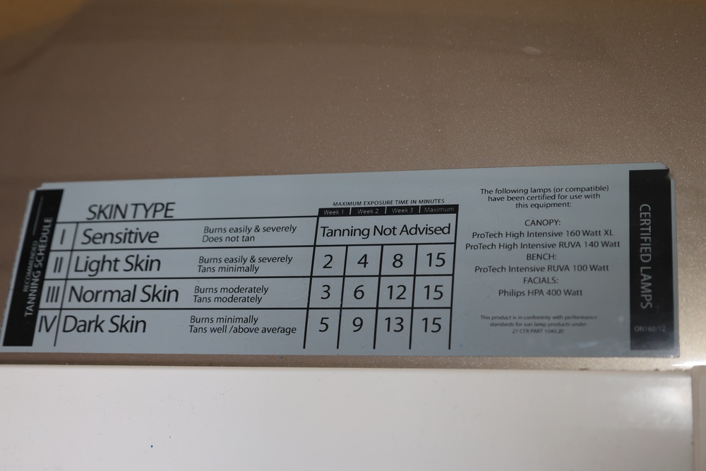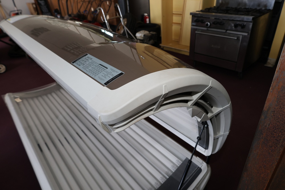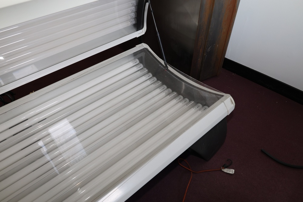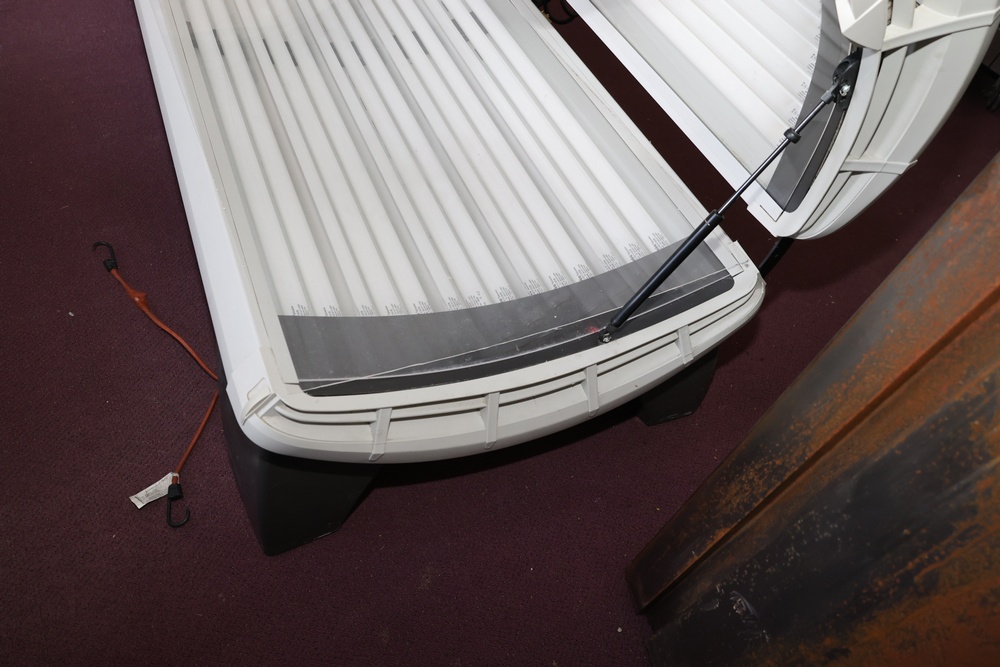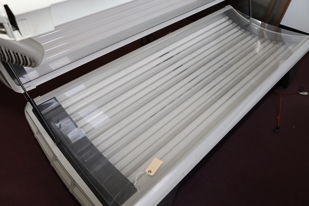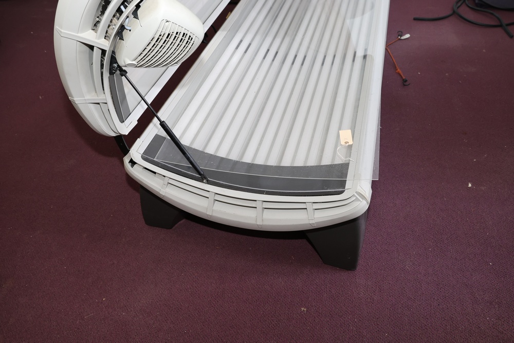 Sunfire tanning bed model 32/1. Seller reports: low hour bed, new acrylic included, needs to be installed, two bulbs need replacement, otherwise functional.