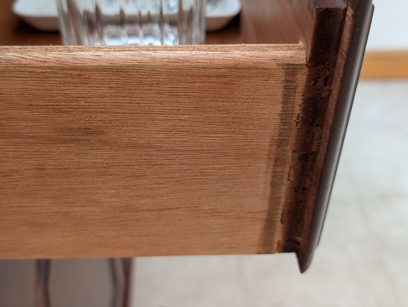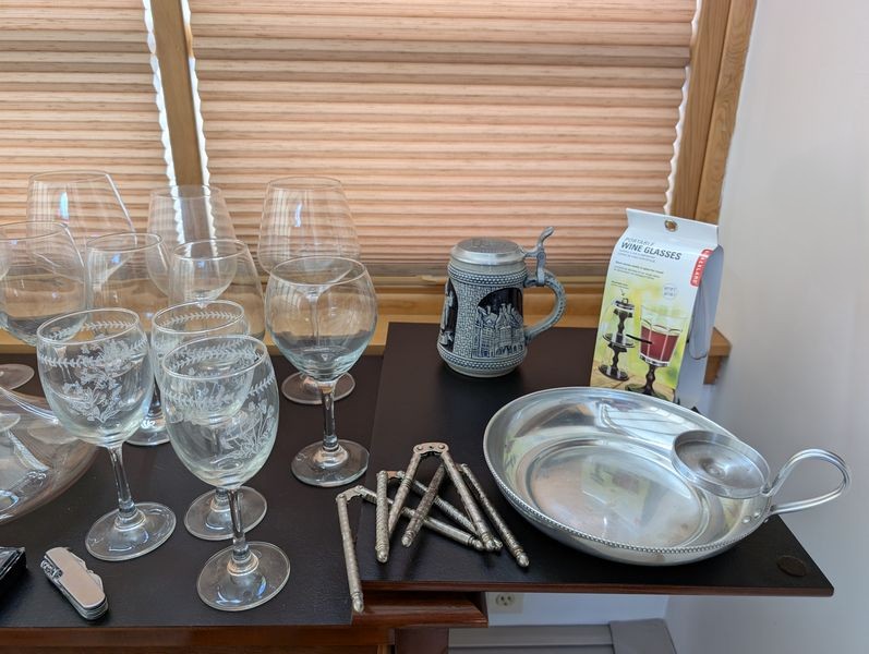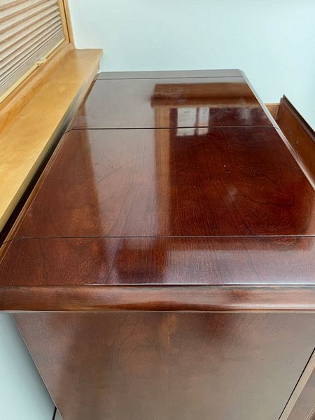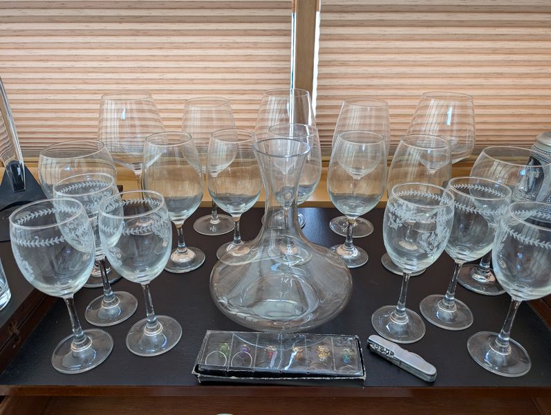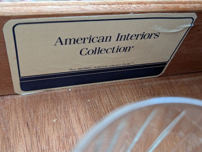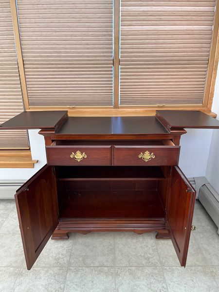 Buffet Cabinet, Barware. American Interiors cherry dovetailed buffet server, 3'Wx17"Dx24"H with flip top extensions, single dovetailed drawer & storge below; assort stemware, bar glasses, decanters, German stein, other related items as seen in photos.