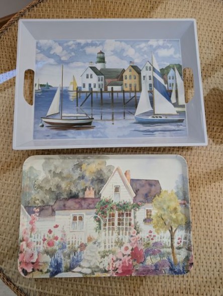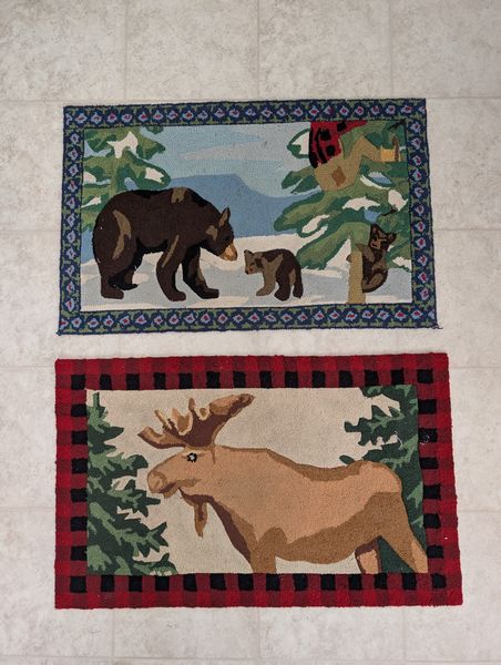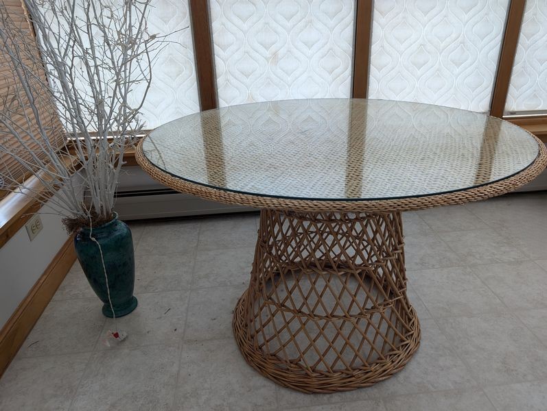Wicker Table, LL Bean Rugs, Décor. Wicker pedestal table with glass top, 42'diam x28.5"H; two LL Bean rugs (moose, bear-motif); resin serving trays; other décor as seen in photos.