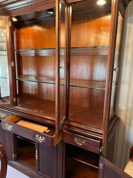 Cherry Two-Piece China Hutch. Formal glass front & sides lights China cab with crown molding, 64"Wx20"Dx33"H (bottom) plus 62"Wx18"Dx47"H (top). Has 1/2" think glass shelves with plate grooves. See photos for more details. Matches buffet in lot #14 and table in lot #15.