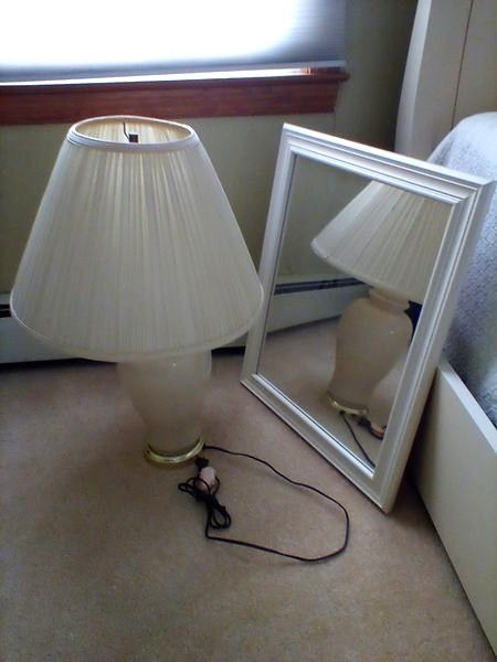 White Trundle Day Bed, Mirror, Lamp. White sleigh-style trundle bed with two opt mattresses & quilt, 83"Lx40"Wx35"H; white wall mirror, 19"Wx23"H; table lamp with shade. Loc on 2nd fl.