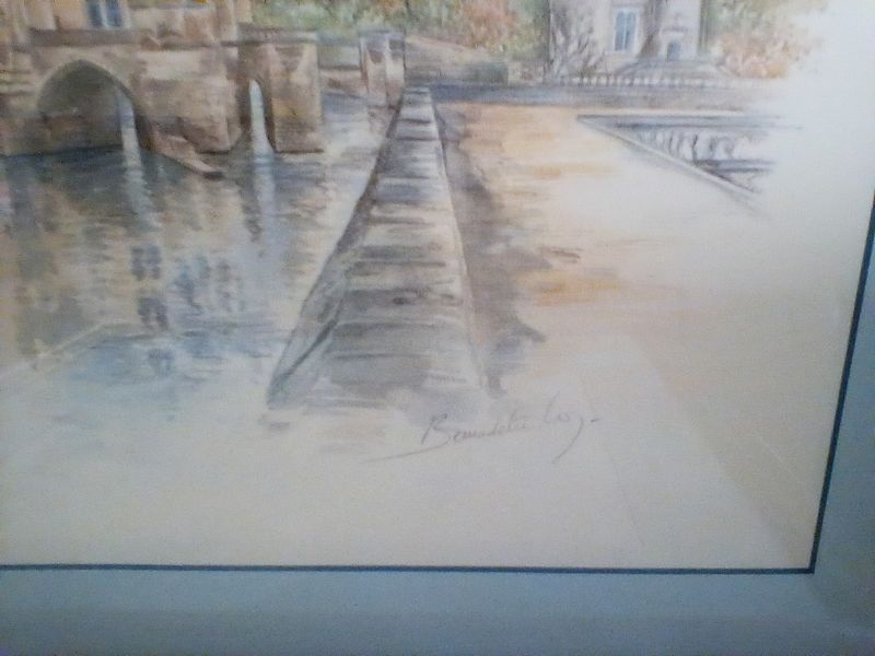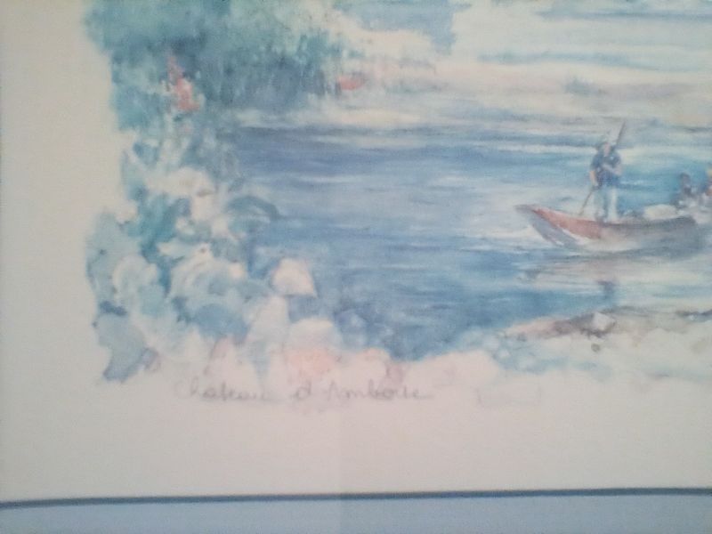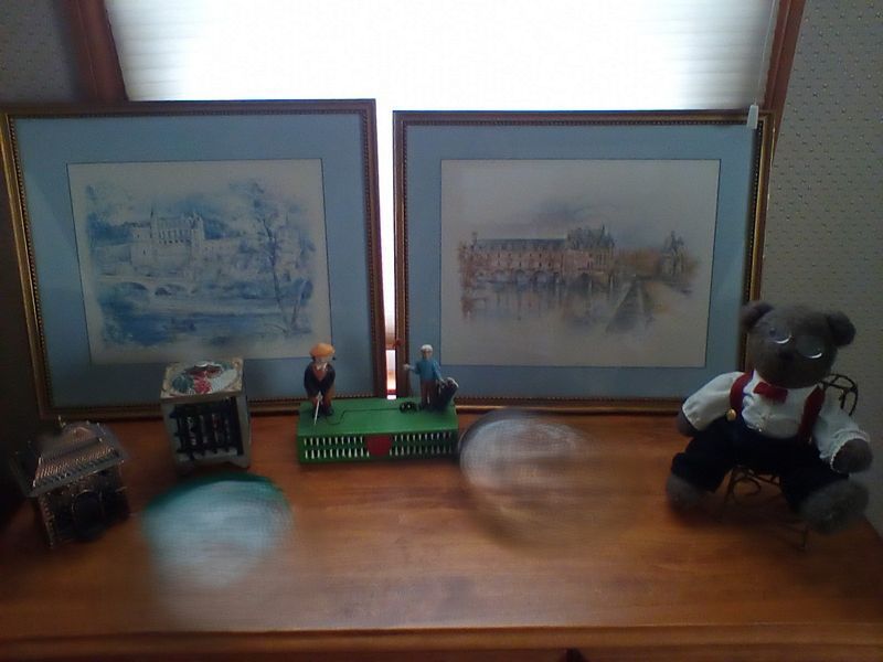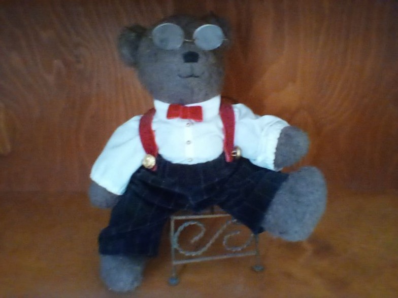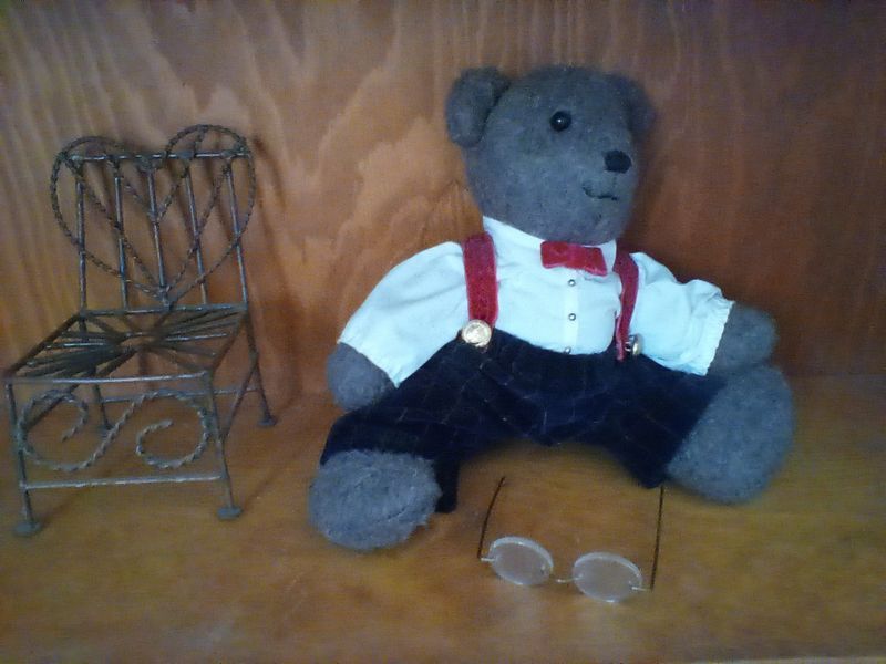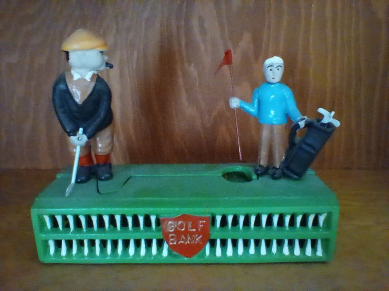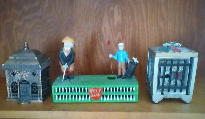 Antique Banks, Wall Art. Three antique iron banks, approx. 5"H; set of 2 sign framed wall art, matted & behind glass, each 19"Wx17"H; stuffed bear with glasses in chair. See photos for details.